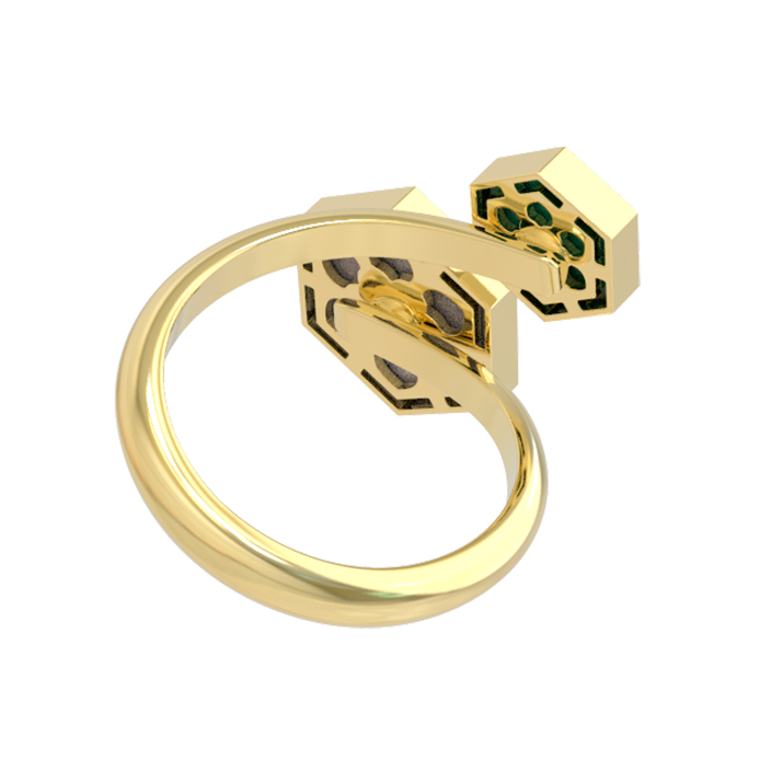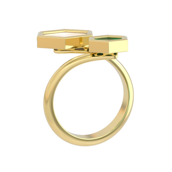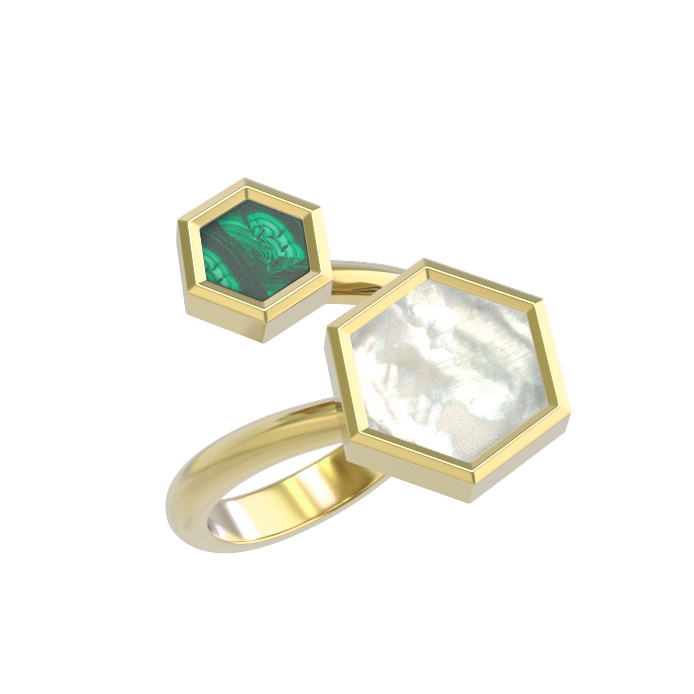 Кольцо из лимонного золота 585 пробы из коллекции De Luxe — Молекула воплощает смелый взгляд на современную эстетику. Дизайн изделия вдохновлен структурой молекулы, что выражается в уникальной геометрии: две вставки правильной шестигранной формы создают динамичный и узнаваемый силуэт. Благородный блеск лимонного золота гармонично сочетается с природной глубиной малахита зеленого цвета и мягким, переливчатым сиянием перламутра. Это украшение стирает границы, предлагая универсальный стиль, подходящий как для женщин, так и для мужчин.