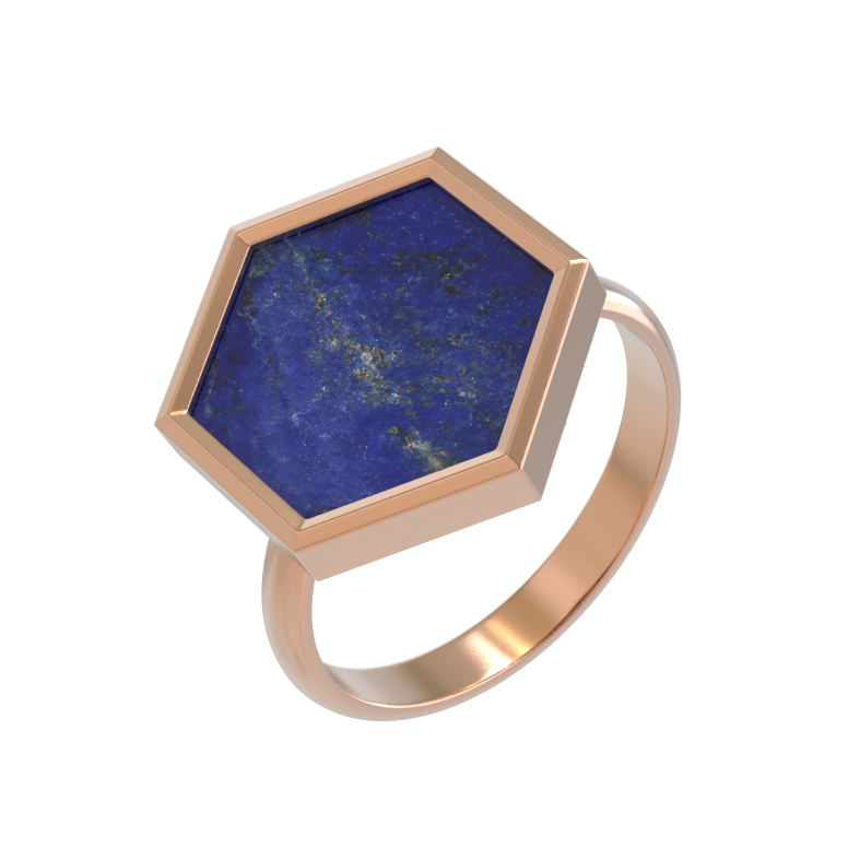 Элегантное кольцо из красного золота 585 пробы — яркий представитель коллекции De Luxe — Молекула, созданный для тех, кто ценит лаконичность и глубокий символизм в украшениях. Центральным элементом дизайна выступает крупная вставка из лазурита, обладающая насыщенным синим цветом, который гармонично сочетается с теплым оттенком драгоценного металла. Форма вставки в виде шестигранника придает изделию современный геометрический вид, отсылающий к эстетике молекулярной структуры.