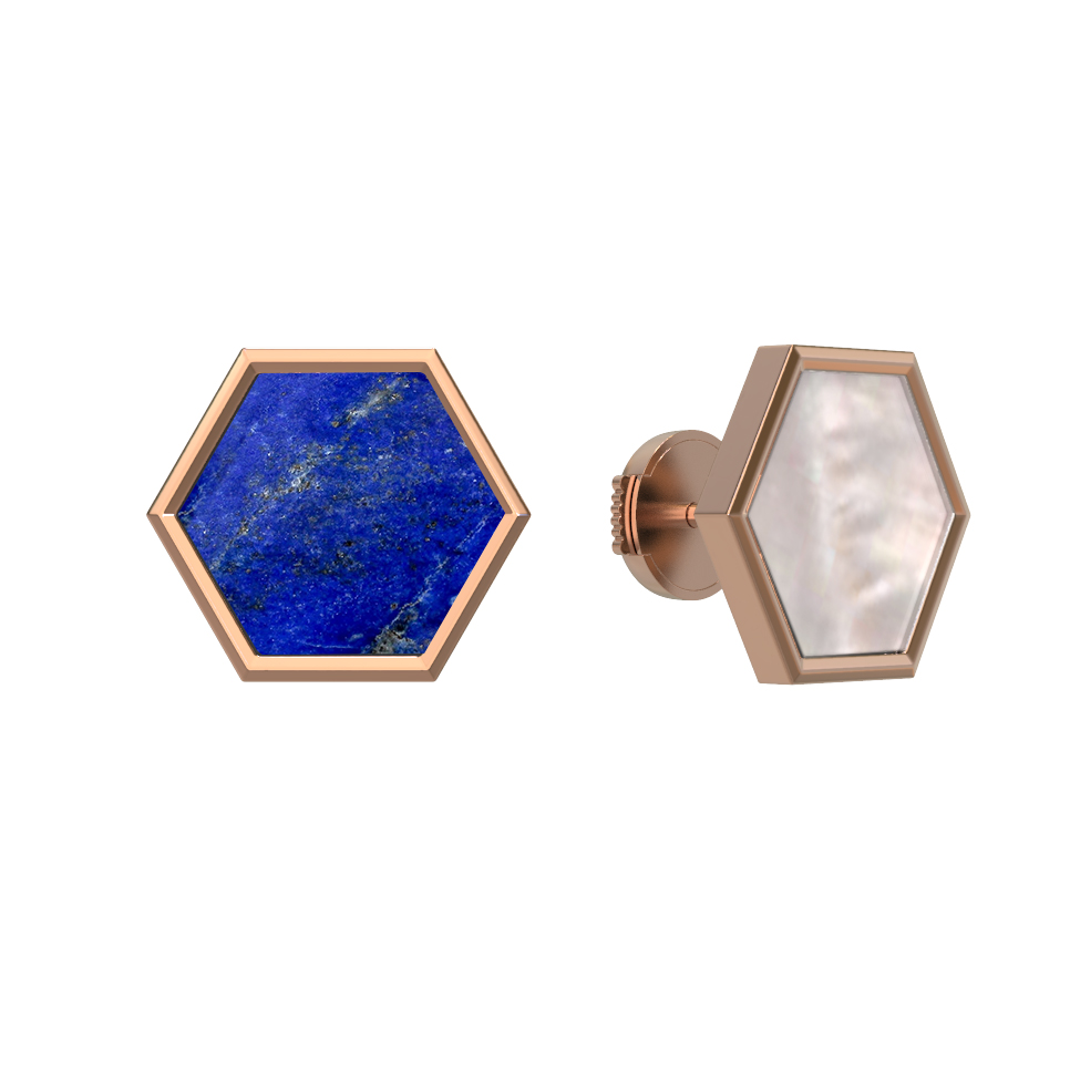 Особую выразительность модели придает контрастное сочетание вставок: глубокий синий цвет лазурита встречается с нежным, переливающимся перламутром. Геометрическая форма вставок гармонично вписана в общую композицию, создавая уникальный визуальный эффект. Изделие отличается минималистичным дизайном, который позволяет подчеркнуть индивидуальность владельца.