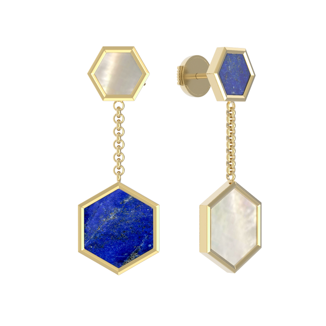 Центральным элементом композиции стали вставки в форме шестигранника. В одной модели гармонично соединены глубокий синий лазурит и нежный переливающийся перламутр. Такое контрастное сочетание цветов вставок — синего и перламутрового — делает аксессуар выразительным акцентом в любом образе. Каждая серьга содержит по 2 вставки, которые подчеркивают изящество исполнения.