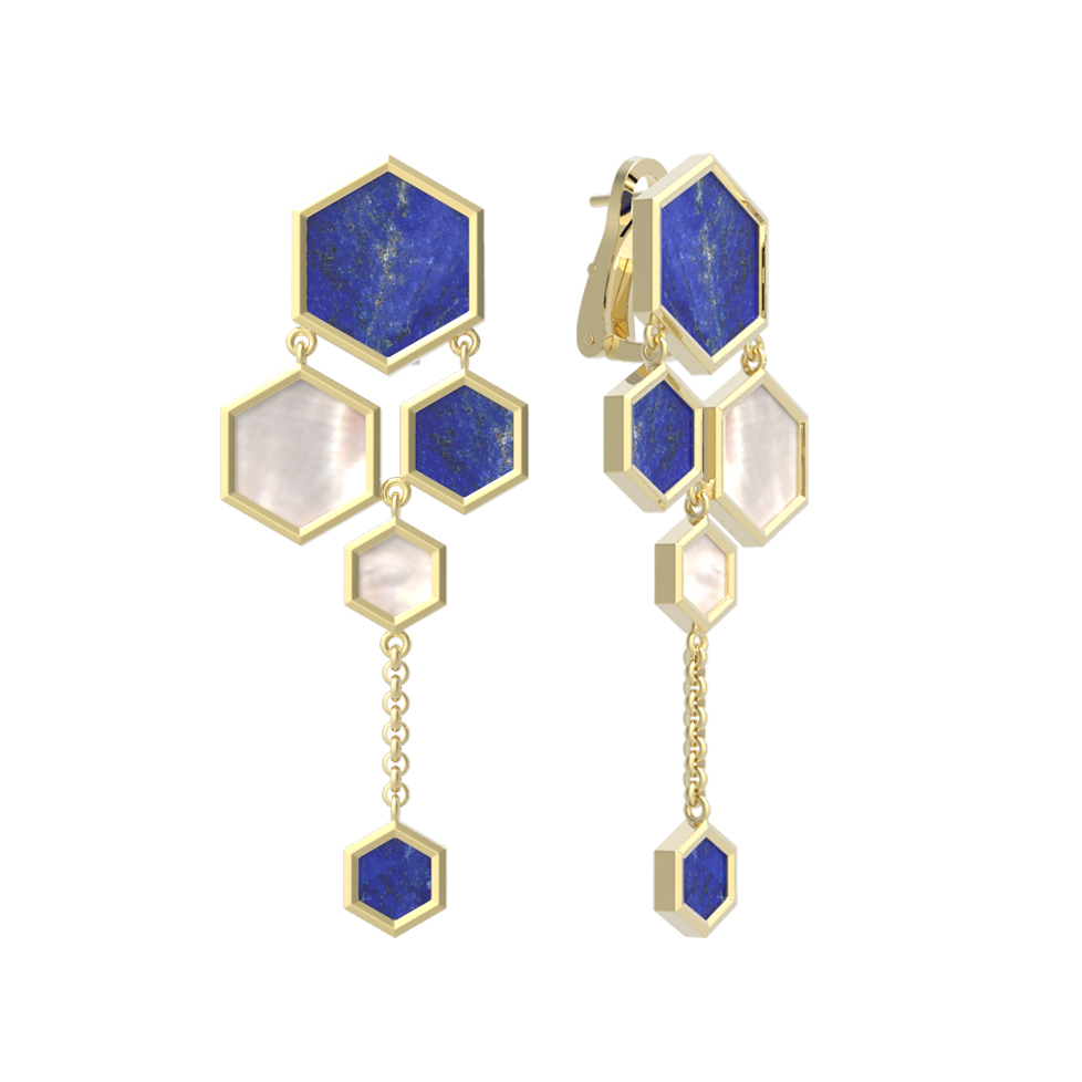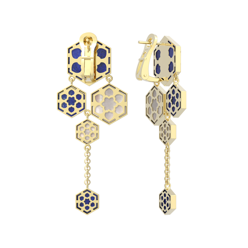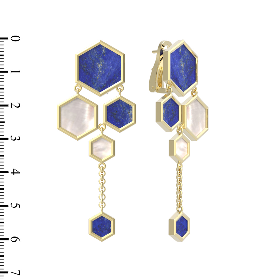Серьги декорированы 6 вставками, выполненными в форме шестигранника. Такое геометрическое решение придает модели динамику и архитектурную строгость. Вставки сочетают в себе насыщенный синий лазурит и нежный перламутр, создавая изысканный контраст цветов. Лазурит придает украшению глубину ночного неба, а перламутр добавляет мягкие переливы, делая ювелирное изделие универсальным и запоминающимся аксессуаром.