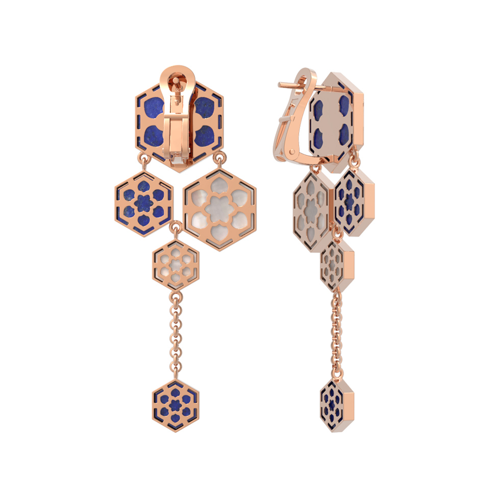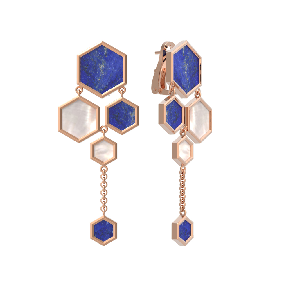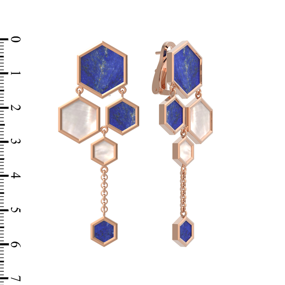 В дизайне гармонично сочетаются два контрастных камня: глубокий синий лазурит и нежный перламутр. Всего в паре серег использовано 6 вставок, которые переливаются в лучах света, создавая эффектные блики. Теплое сияние красного золота великолепно обрамляет природную красоту камней, подчеркивая их насыщенный цвет и текстуру. Эти серьги — универсальный выбор, который прекрасно подойдет как для женщин, так и для мужчин, предпочитающих стильные и оригинальные ювелирные решения.