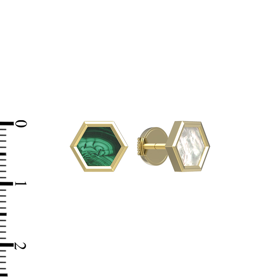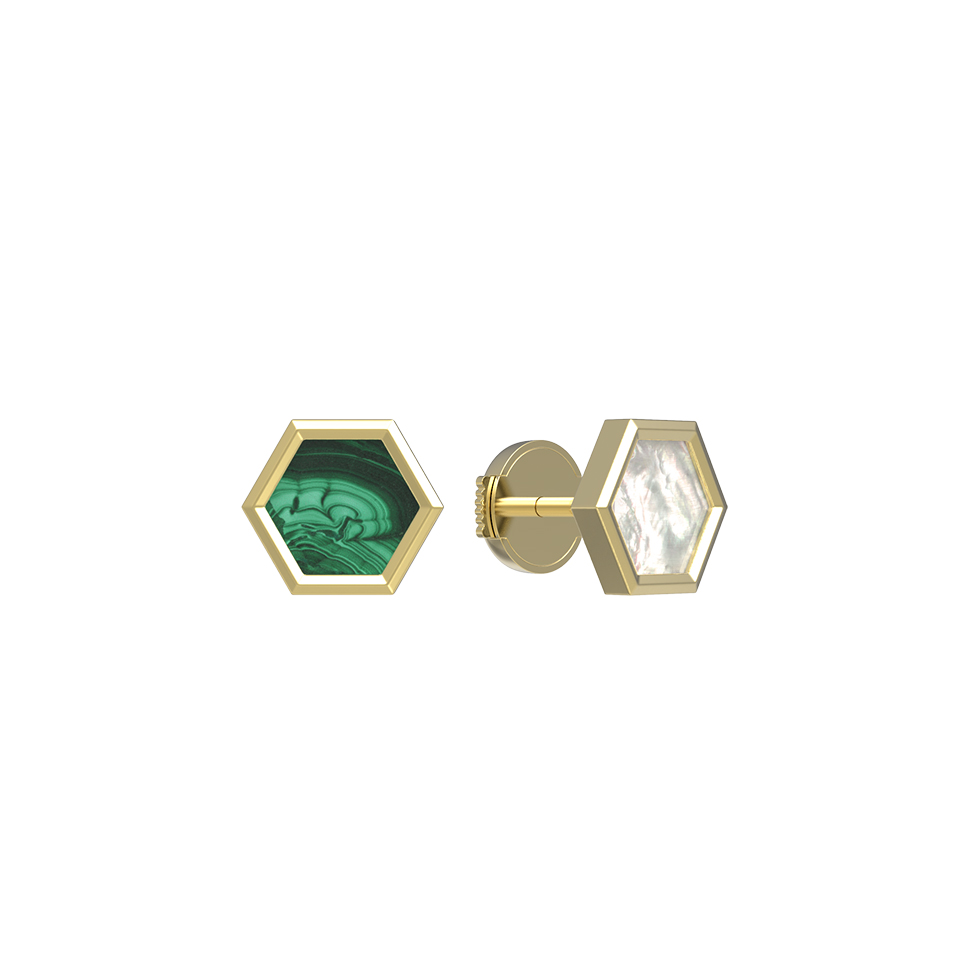 Особое очарование этой модели придает контрастное сочетание материалов. В одном изделии гармонично объединились природный малахит глубокого зеленого цвета и нежный перламутр с его характерным перламутровым переливом. Лимонный оттенок золота подчеркивает насыщенность натуральных камней, создавая изысканный баланс между строгостью линий и мягкостью природных фактур.