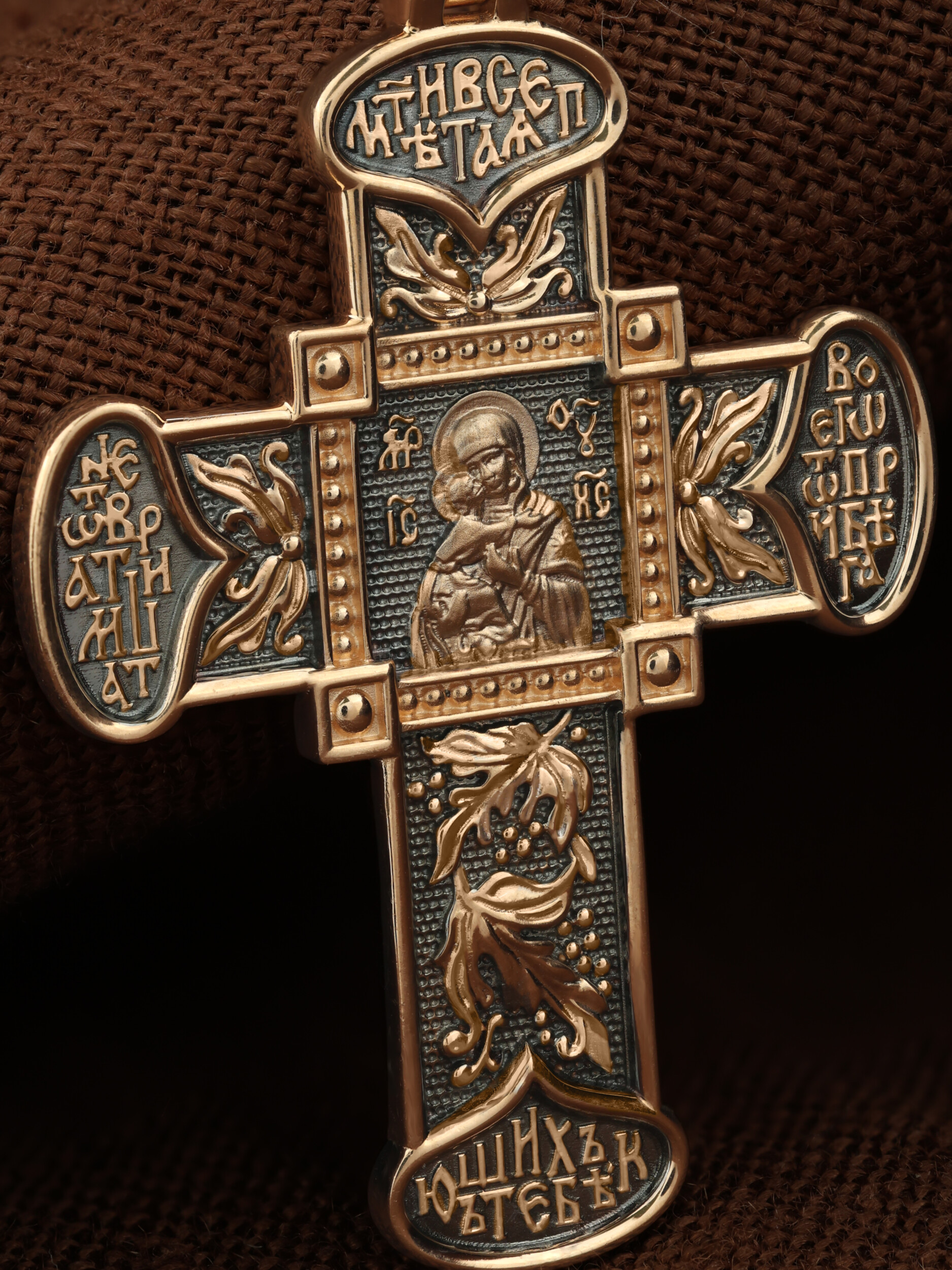 В центре оборотной стороне креста помещен образ Владимирской иконы Божией Матери — один из самых чтимых святынь Русской православной церкви. По преданию, икона была написана Святым апостолом и евангелистом Лукой во время земной жизни Богородицы. Дева Мария, увидев Свое изображение, молвила: «Отныне ублажат Мя вси роди. Благодать Рождшегося от Меня и Моя с сим образом да будет». Образ написан в лирическом иконографическом типе «Умиление». Младенец припал щекой к щеке Матери и тянется к ней правой рукой, другой нежно обнимая за шею. Икона Владимирской Божией Матери вплоть до V века находилась в Иерусалиме, затем была перевезена в Византию. На Русь икона была привезена в 1131 г. За прошедшие столетия святыня неоднократно переезжала из Владимира в Москву и обратно, не раз спасая страну от захватчиков. Русская Православная Церковь установила троекратное празднование Владимирской иконе Божией Матери. Каждый из дней празднования связан с избавлением русского народа от порабощения иноплеменниками по молитвам ко Пресвятой Богородице. В последующие века у иконы происходили многие важные исторические события: подписание актов, принятие присяги значимых государственных деятелей и возведение на престол. Вокруг образа, по сторонам Креста, написана молитва: «Мати Всепетая, не отврати лица Твоего от прибегающих к Тебе». Оборотная сторона креста украшена растительным орнаментом.