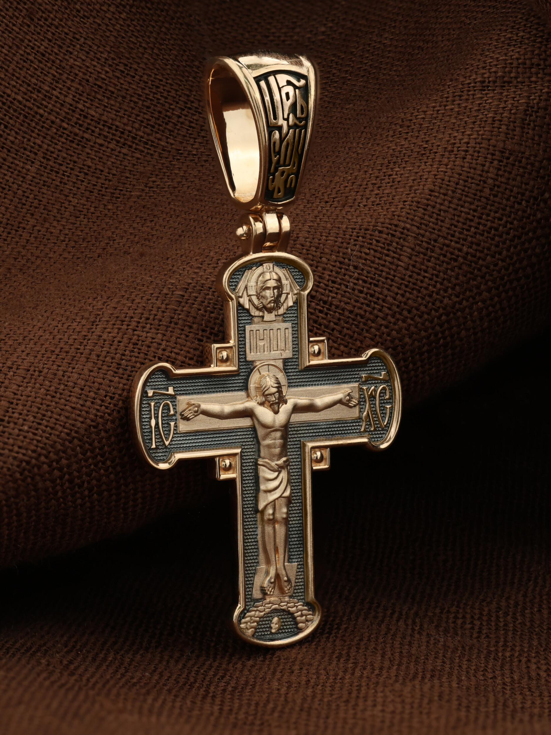 На лицевой стороне креста изображено Распятие Господа и Спасителя нашего Иисуса Христа, отдавшего Себя на смерть, для искупления грехов мира. Крест является символом жертвенной любви Всеблагого Бога к падшим людям, всепобеждающим духовным оружием христиан, основанием и средоточием церковной жизни. Господь сказал: «кто хочет идти за Мною, отвергнись себя, и возьми крест свой, и следуй за Мною». (Мк. 8: 34). На кулонном кольце помещена надпись «Царь Славы». На верхней табличке, выше головы Иисуса, расположена надпись, составленная Понтием Пилатом — «IНЦI». Она означает «Иисус Назорей, Царь Иудейский». Над ней — Нерукотворный образ Господа и Спасителя нашего Иисуса Христа, чудесно отпечатавшийся на плате, котором Христос вытер свой лик. Надпись «IC» «ХC», означает Иисус Христос, помещается на разных сторонах поперечной перекладины креста. Крест стоит на горе камней, символизирующих Голгофу. В ее основании различается череп– это голова Адама.