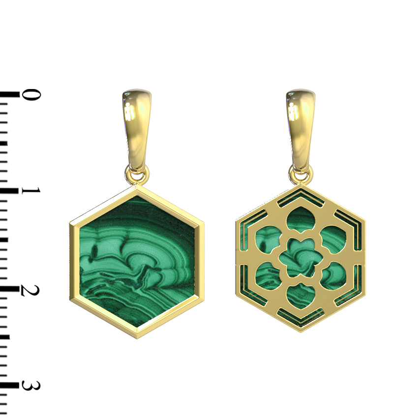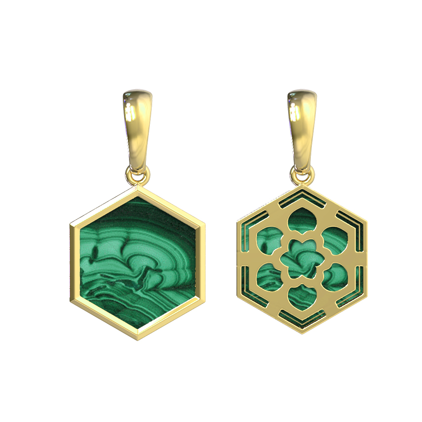 Малахит в сочетании с качественным золотом создает благородный контраст, делая эту подвеску запоминающимся подарком для ценителей минимализма и интеллектуального дизайна. Изделие выполнено с вниманием к деталям, где каждый контур шестигранника подчеркивает природную красоту вставки.