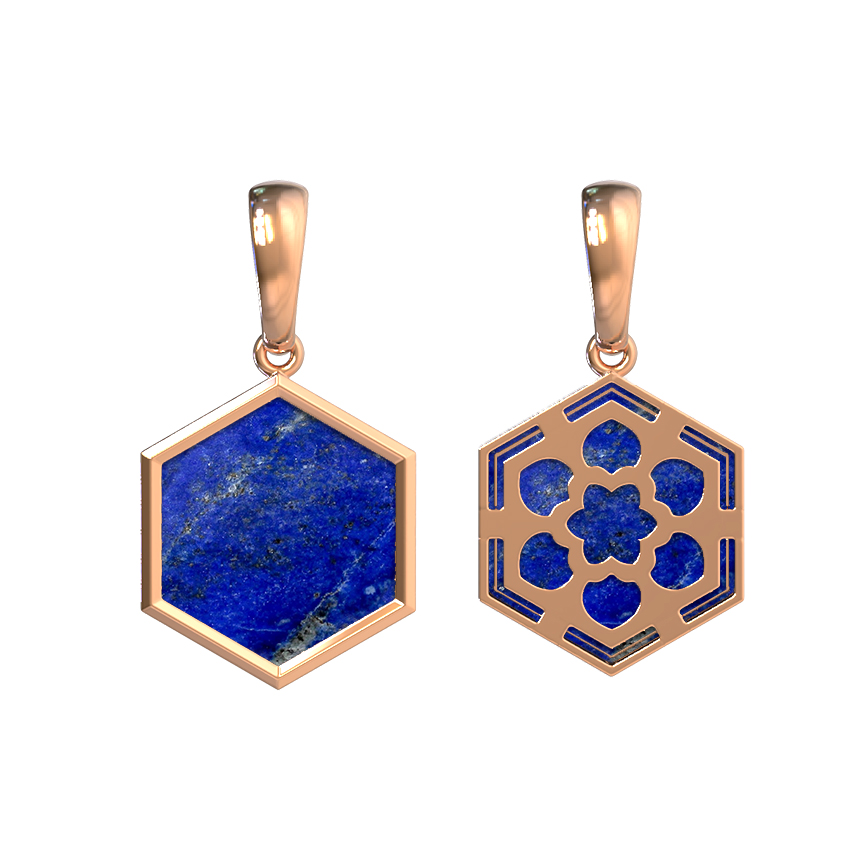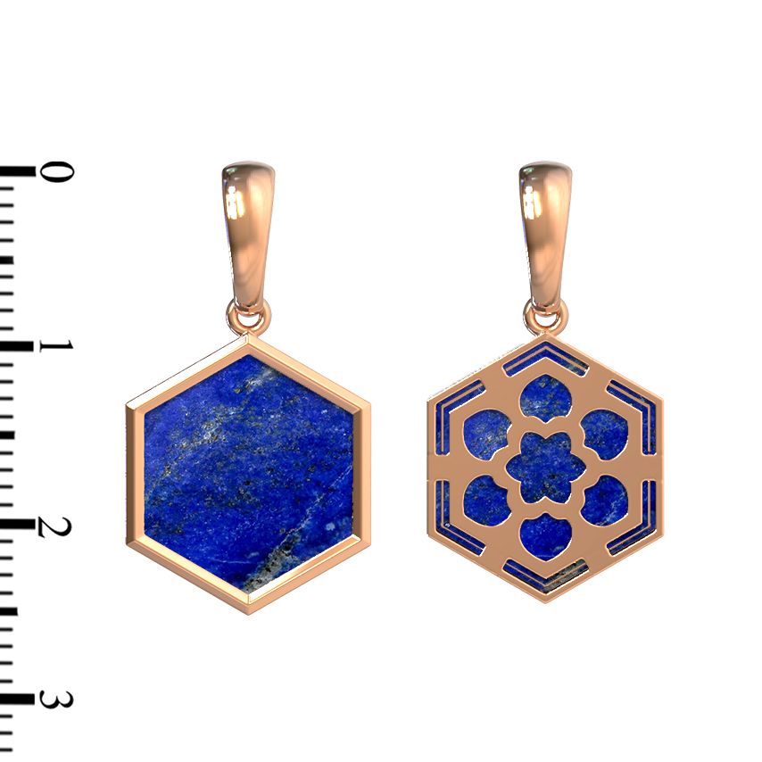 Подвеска из красного золота 585 пробы — это изысканное ювелирное изделие, сочетающее в себе строгость геометрических форм и природную красоту камня. Украшение входит в коллекцию De Luxe — Молекула, дизайн которой вдохновлен структурой молекулы. Центральным элементом композиции является вставка из натурального лазурита глубокого синего цвета, выполненная в необычной форме шестигранника. Лаконичная оправа из благородного красного золота подчеркивает насыщенный оттенок минерала, создавая эффектный контраст.