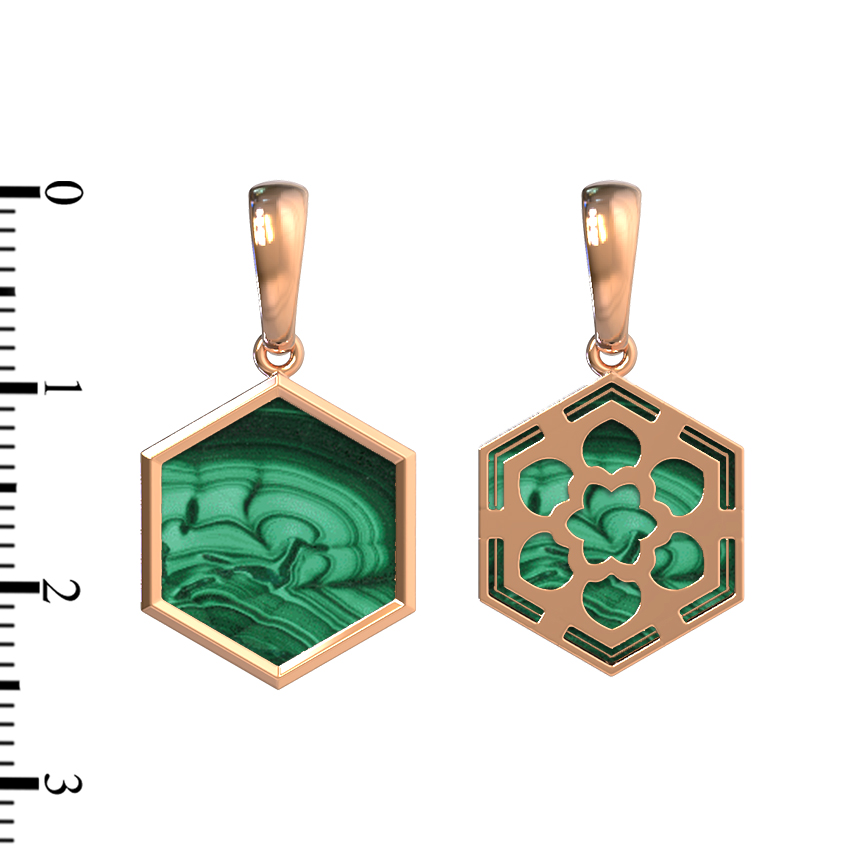 Геометрическая точность форм является ключевой особенностью данной модели. Малахит имеет форму шестигранника и идеально вписан в оправу, создавая контрастное сочетание благородного металла теплого оттенка и яркого камня. С одной стороны, подвеска выглядит как минималистичная пластина, а с другой — демонстрирует ажурную конструкцию в виде молекулярной структуры, что придает украшению многогранность и оригинальность.
