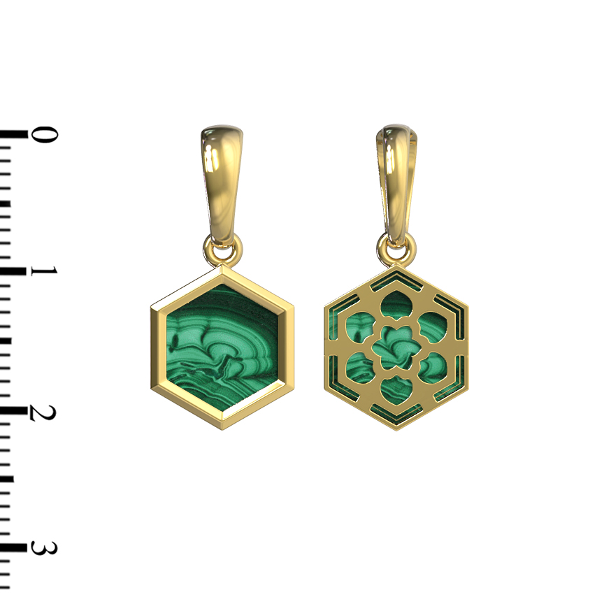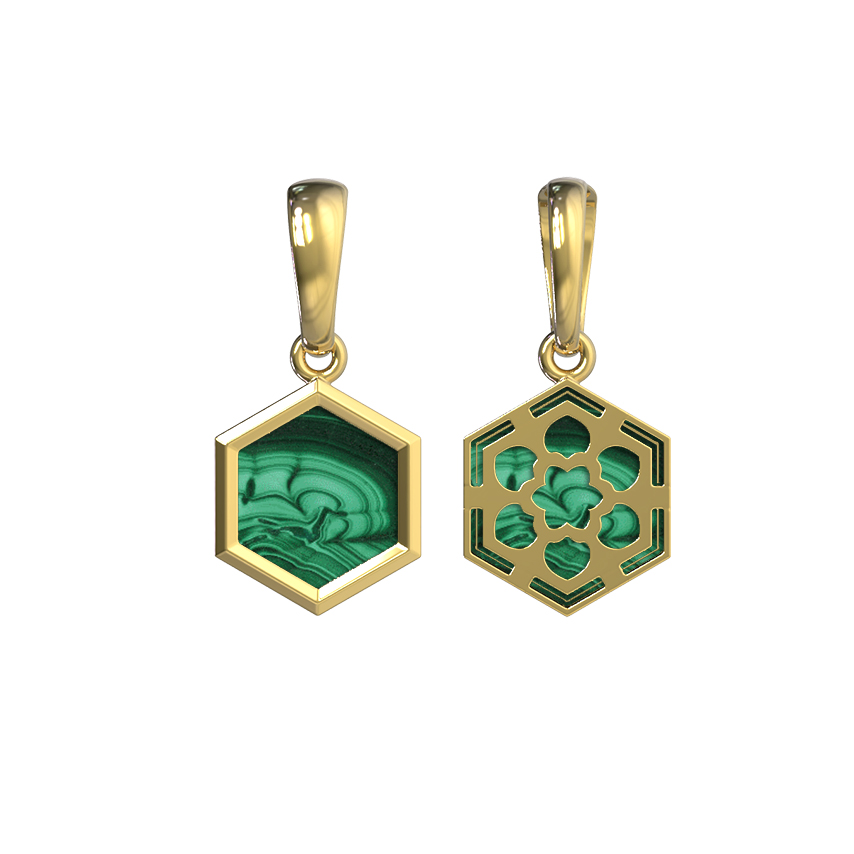В качестве центральной вставки используется натуральный малахит глубокого зелёного цвета. Уникальный природный рисунок камня делает каждое изделие единственным в своем роде. Контраст между насыщенным зелёным оттенком малахита и благородным блеском лимонного золота 585 пробы выглядит выразительно и стильно. Благодаря продуманной форме шестигранника и универсальному дизайну, эта подвеска станет ярким акцентом в любом образе.
