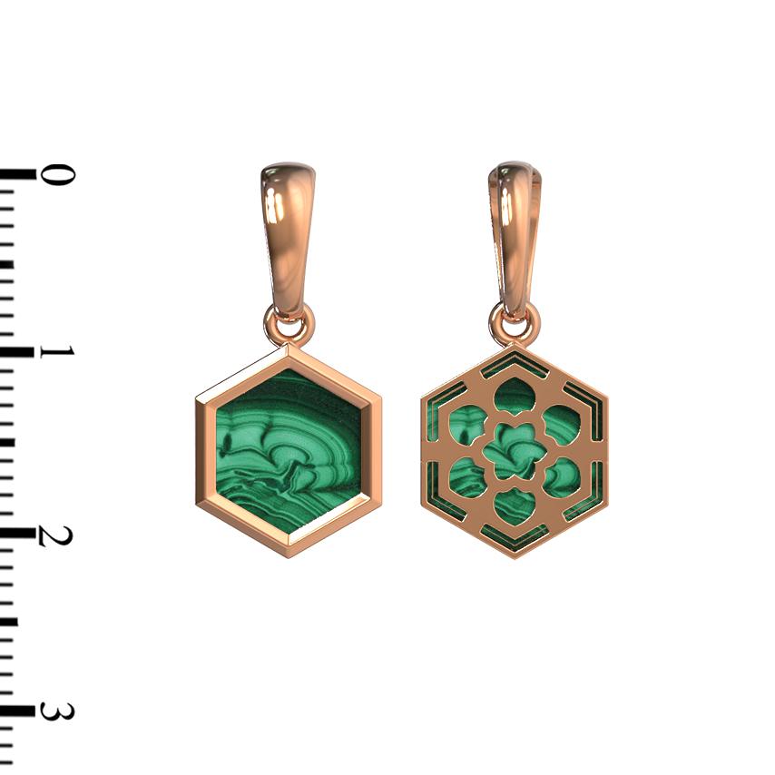 Элегантная подвеска из красного золота 585 пробы из коллекции De Luxe — Молекула станет стильным акцентом вашего образа. Дизайн украшения вдохновлен геометрией молекулы, что придает изделию современный и интеллектуальный вид. Центральным элементом композиции является вставка из природного малахита глубокого зеленого цвета. Камень огранен в форме шестигранника, что подчеркивает уникальность природного рисунка минерала и гармонично сочетается с четкими линиями золотой оправы.