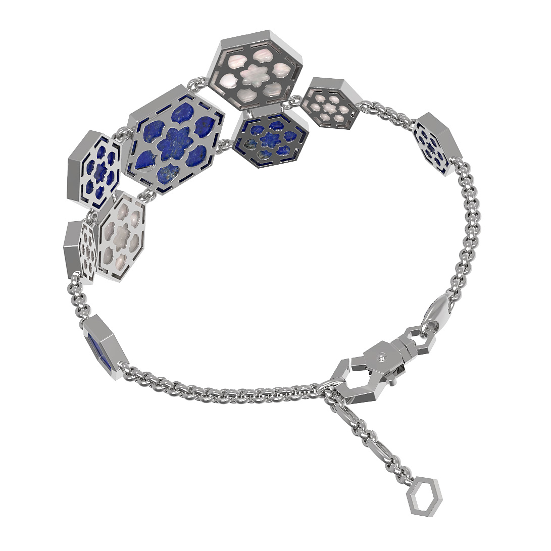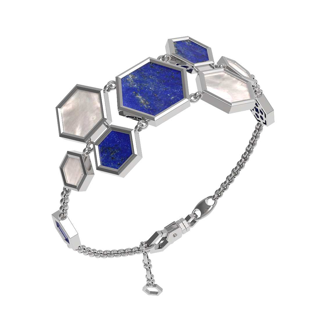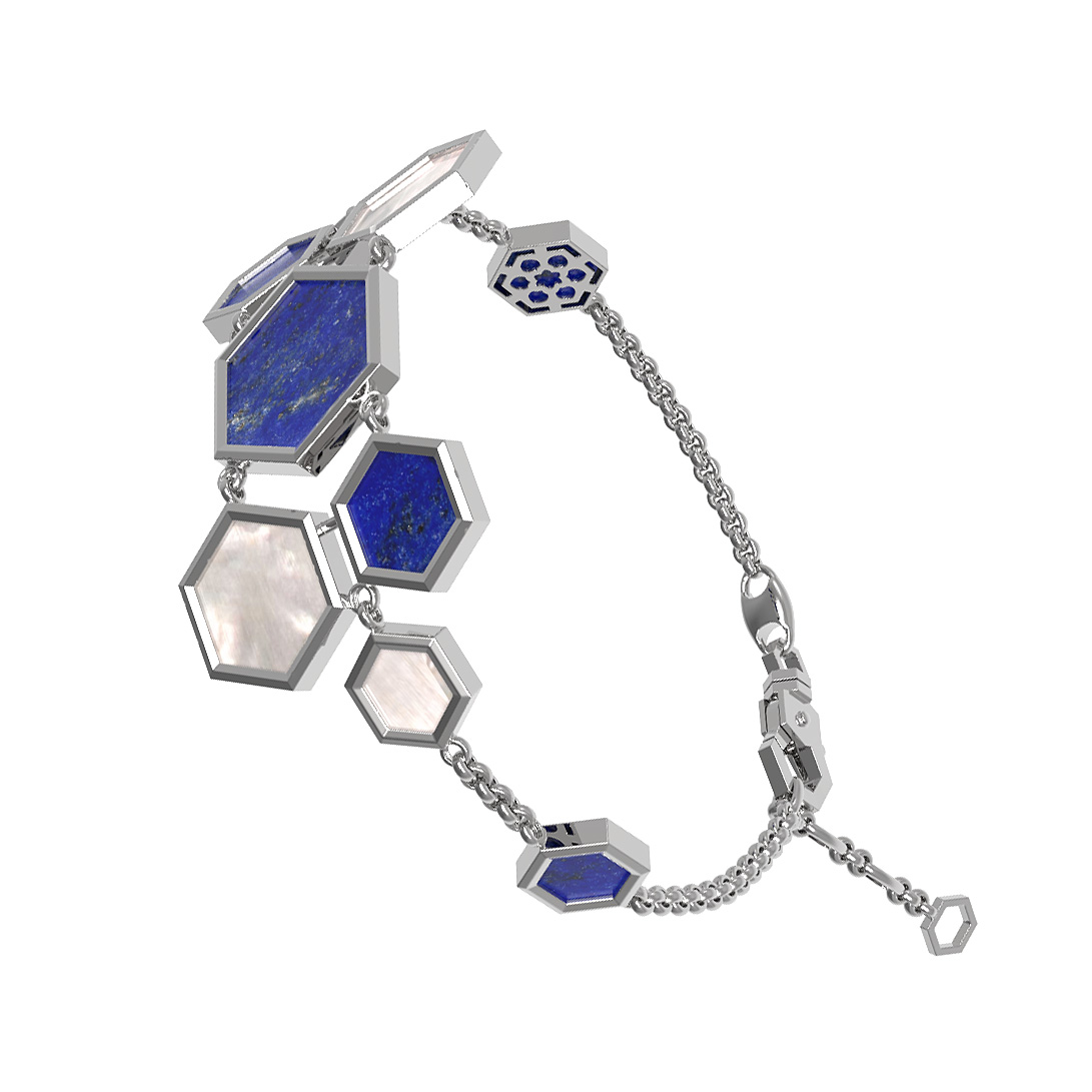 Контрастное сочетание материалов подчеркивает благородство белого золота: глубокий синий цвет лазурита дополняется нежным сиянием перламутра. Каждый из пяти шестигранников проработан с ювелирной точностью, благодаря чему браслет выглядит как архитектурный объект. Холодный блеск металла гармонично сочетается с природной фактурой камней, создавая универсальный аксессуар.