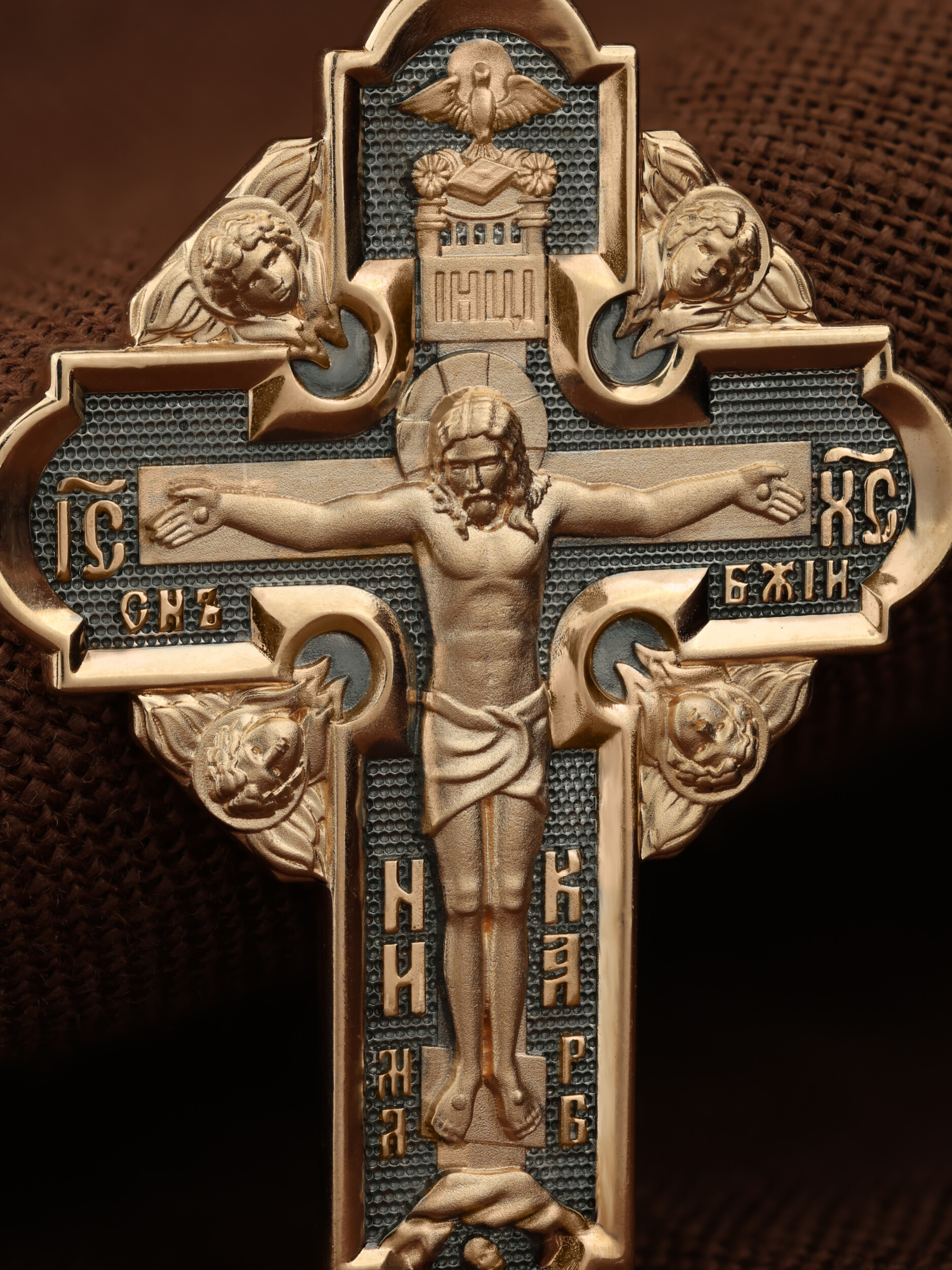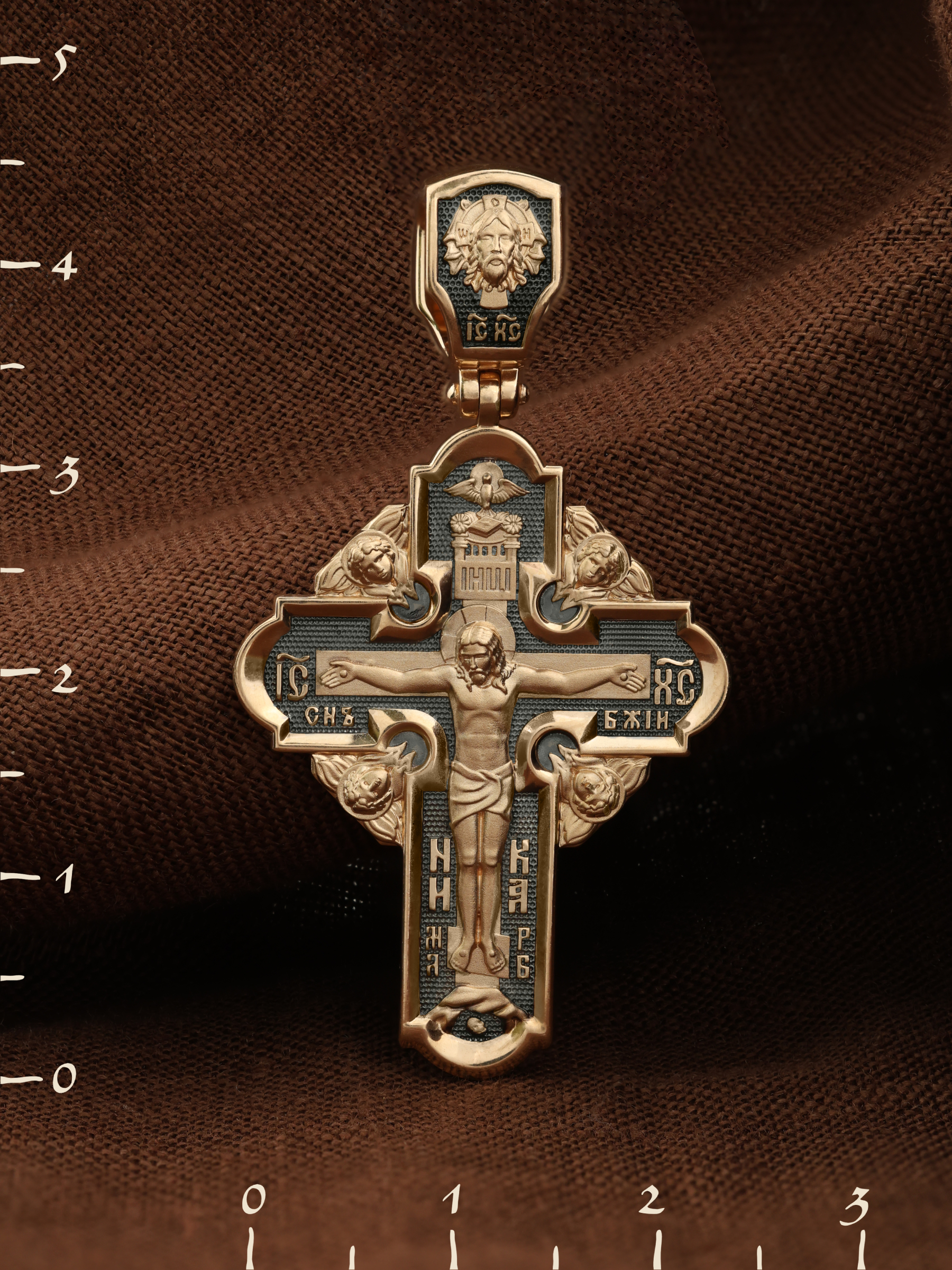 На лицевой стороне креста изображено Распятие Господа и Спасителя нашего Иисуса Христа. Крест- символ спасения и искупления рода человеческого, знамение победы над смертью и адом. Верхняя перекладина символизирует титло — табличку, на которой, согласно Евангелию, было начертано: Иисус Назорей Царь Иудейский (IНЦI). Надпись «IC» «ХC», означает Иисус Христос, помещается на разных сторонах поперечной перекладины креста. Ниже перекладины расположено словосочетание «СЫН БОЖИЙ», что означает божественную природу Иисуса Христа. Надпись «МЛРБ» — «место лобное рай бысть» означает, что место лобное стало раем и помещаются в нижней части креста. Рядом — слово «НИКА», что означает «победитель». Возвышение, на котором стоит Крест, символизирует гору Голгофу, на которой произошло Распятие. Под подножием Креста изображена покоящаяся голова (череп) Адама. На кулонном кольце изображен Нерукотворный образ Господа и Спасителя нашего Иисуса Христа, чудесно отпечатавшийся на плате, которым Христос вытер свой лик.