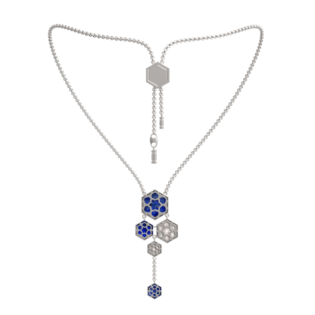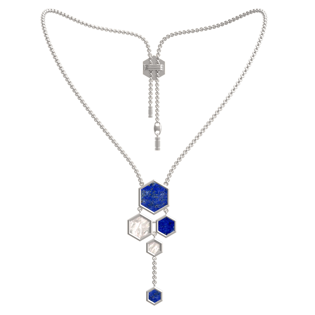 Контрастное сочетание камней создает неповторимый визуальный эффект: глубокий синий лазурит гармонично дополняется мягким мерцанием натурального перламутра. Белое золото подчеркивает холодный блеск и насыщенность цвета вставок, делая колье универсальным дополнением как для вечернего, так и для повседневного гардероба. Благодаря лаконичному и при этом смелому исполнению, данное украшение подойдет как для женщин, так и для мужчин, предпочитающих современные ювелирные решения.