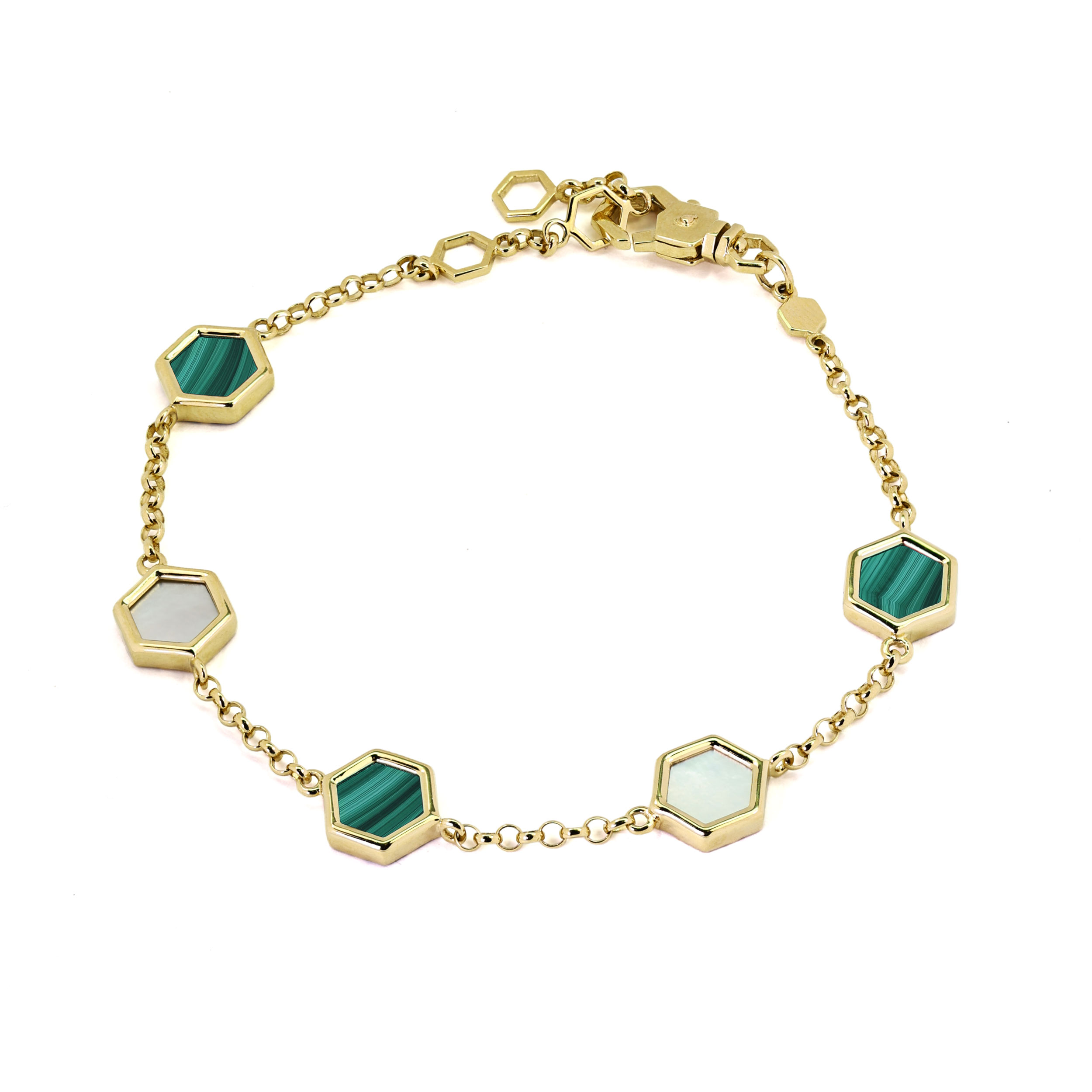 Центральными элементами украшения выступают три вставки в форме шестигранника, чередующиеся в изящной цепочке. Глубокий зеленый цвет малахита с его характерным природным рисунком эффектно контрастирует с мягким сиянием перламутра, создавая завораживающую игру света. Такое сочетание материалов придает браслету особую выразительность и делает его заметным акцентом в любом образе.