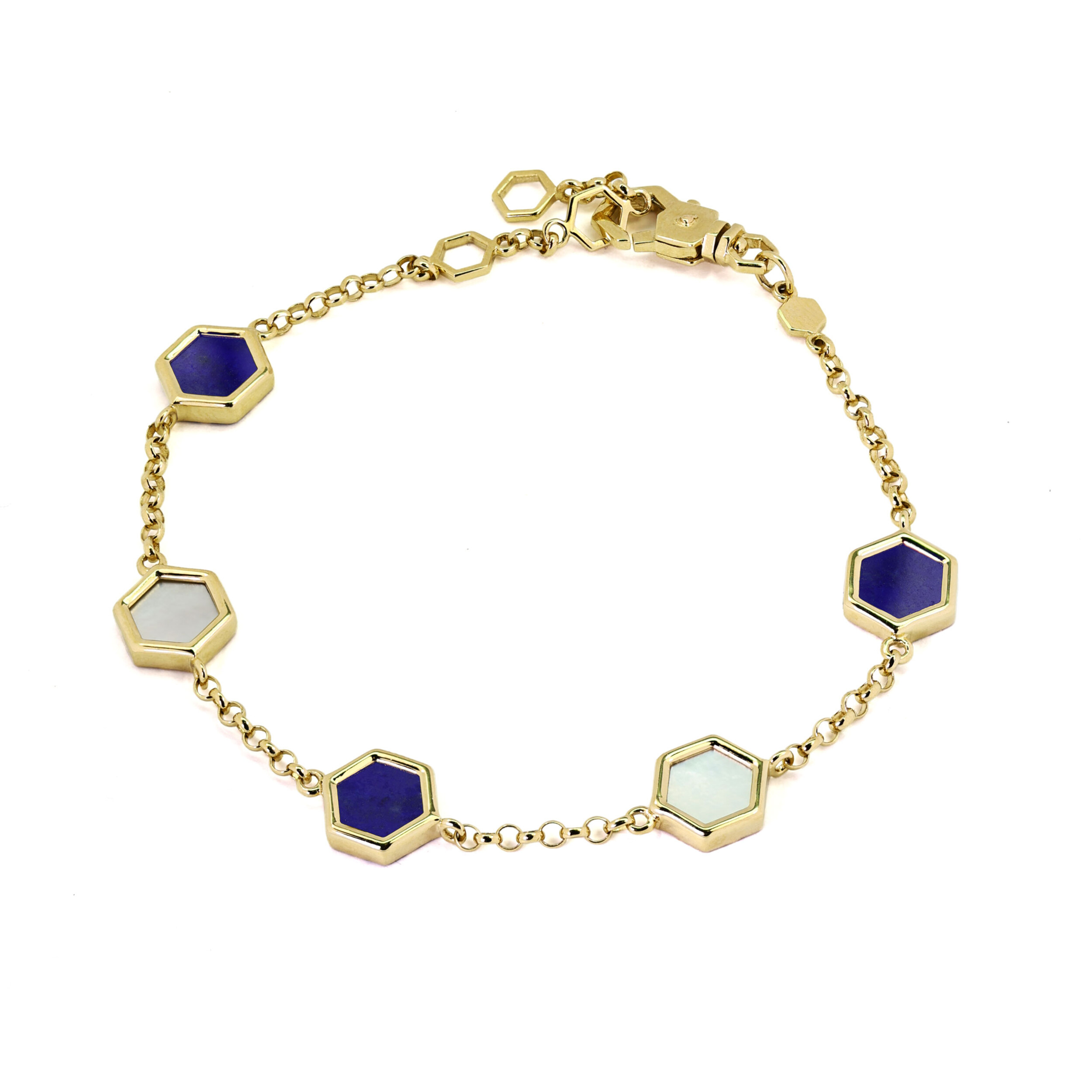В центре композиции расположены три выразительные вставки в форме шестигранника, которые притягивают взгляд своим контрастным сочетанием цветов. Глубокий синий оттенок натурального лазурита перекликается с нежным перламутровым сиянием, создавая гармоничный и сбалансированный дуэт. Тщательно продуманная геометрия делает это украшение универсальным аксессуаром, который одинаково органично смотрится как на женском, так и на мужском запястье.