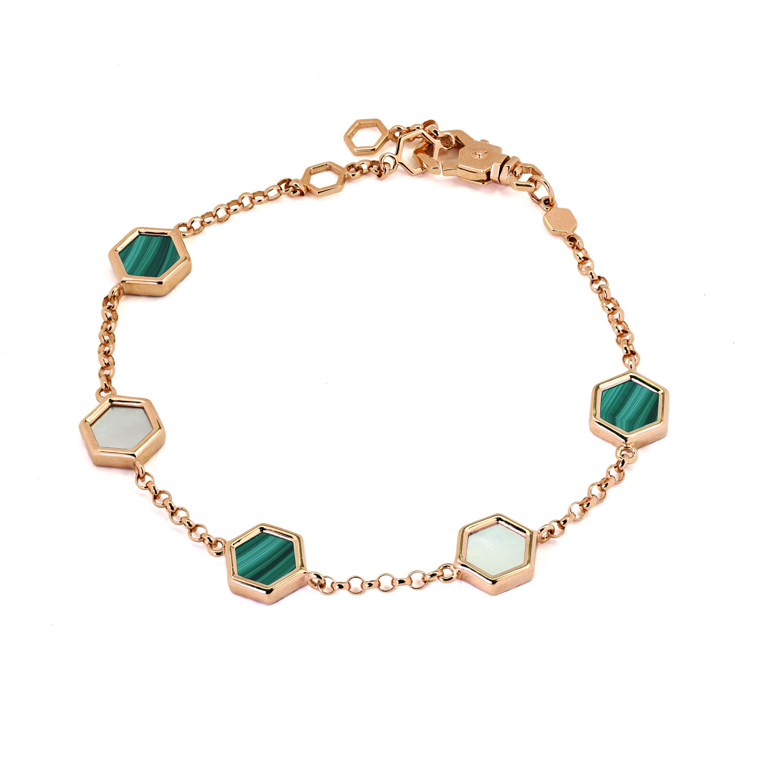 Откройте для себя оригинальное сочетание геометрии и природной красоты в ювелирном украшении из серии De Luxe — Молекула. Этот браслет — изысканный пример современного дизайна в стиле молекула, где строгость линий гармонично дополняется мягким сиянием натуральных камней. Изделие выполнено из красного золота 585 пробы, чей теплый оттенок идеально подчеркивает контраст между насыщенным зеленым малахитом и нежным, переливчатым перламутром.