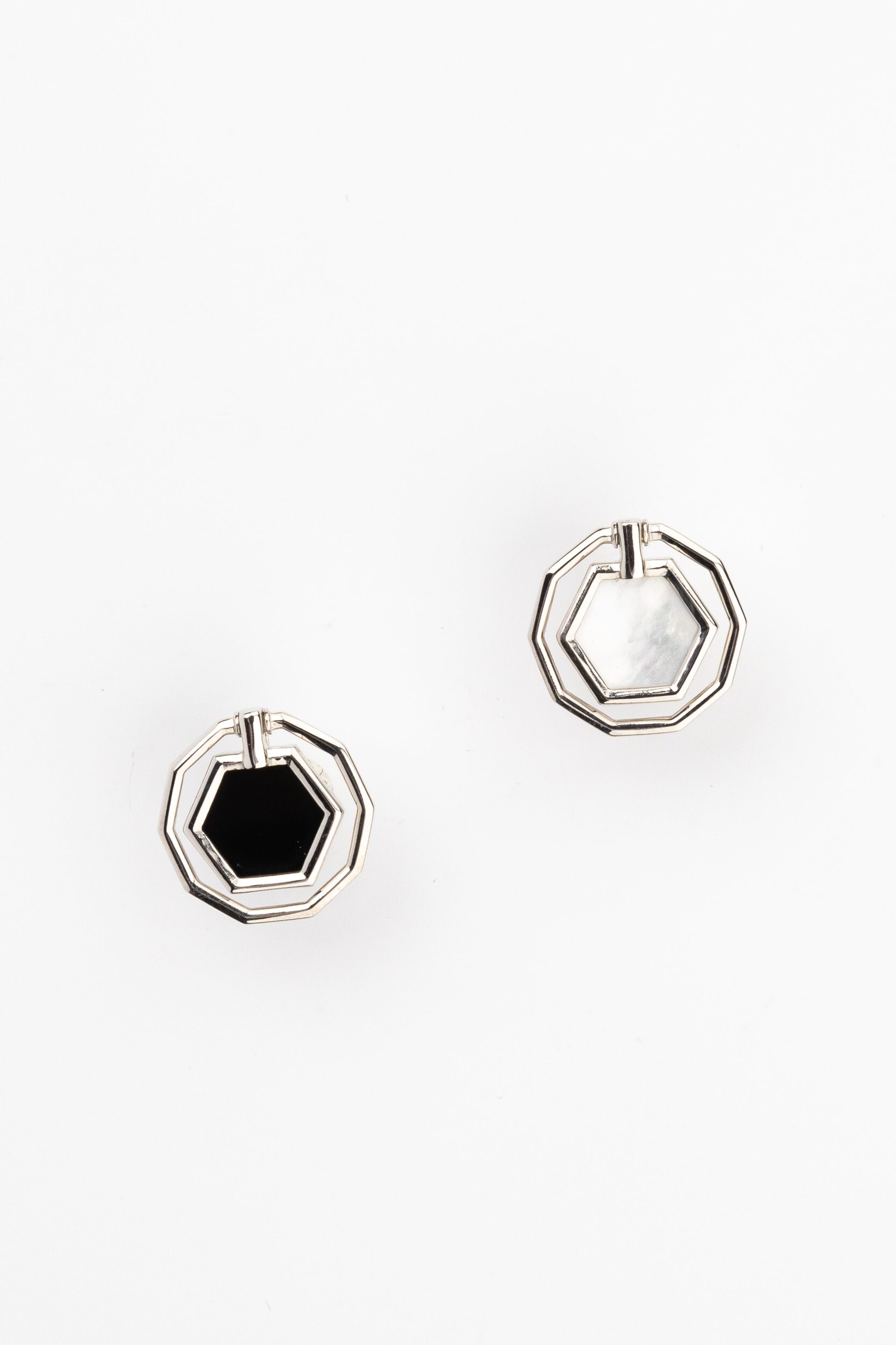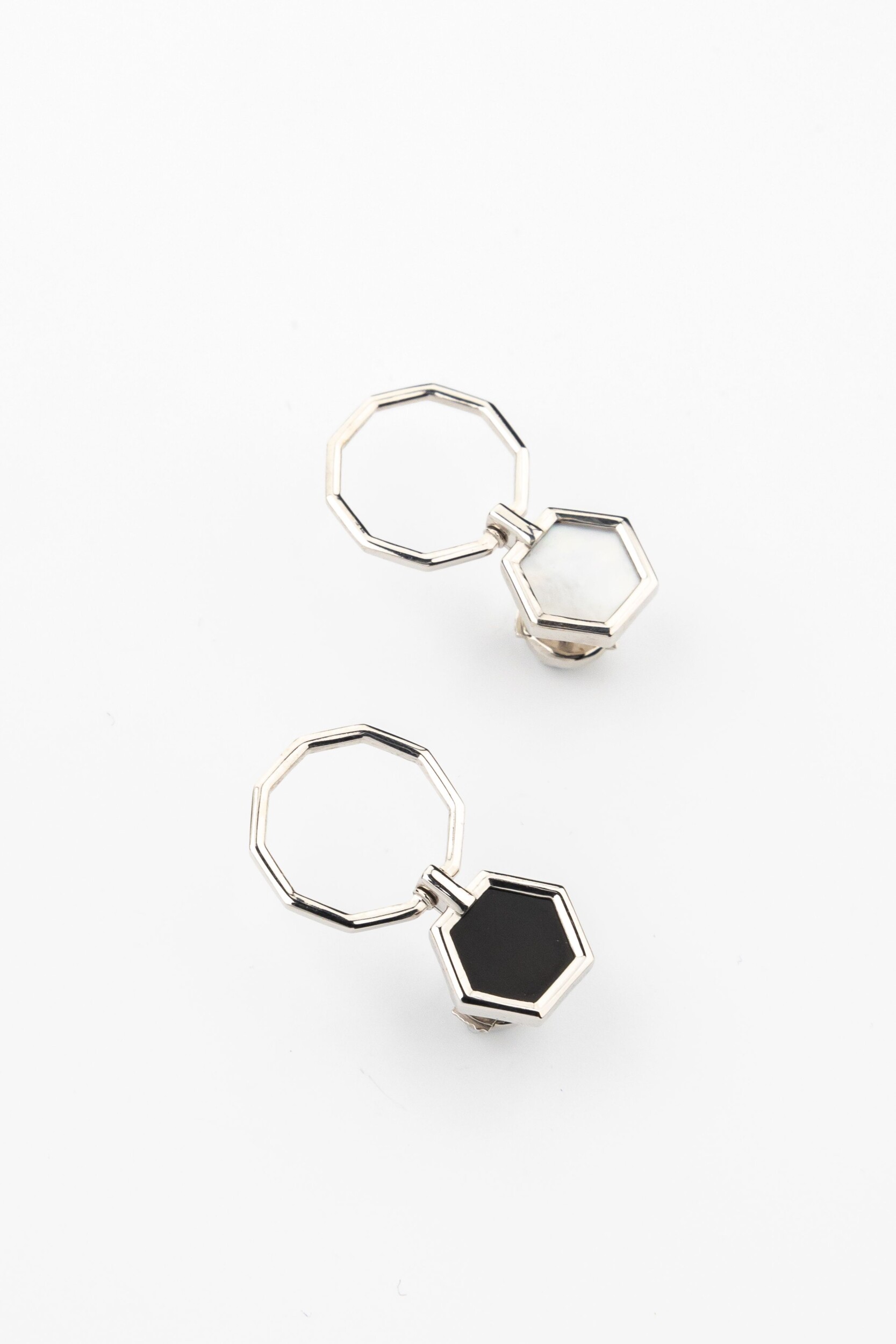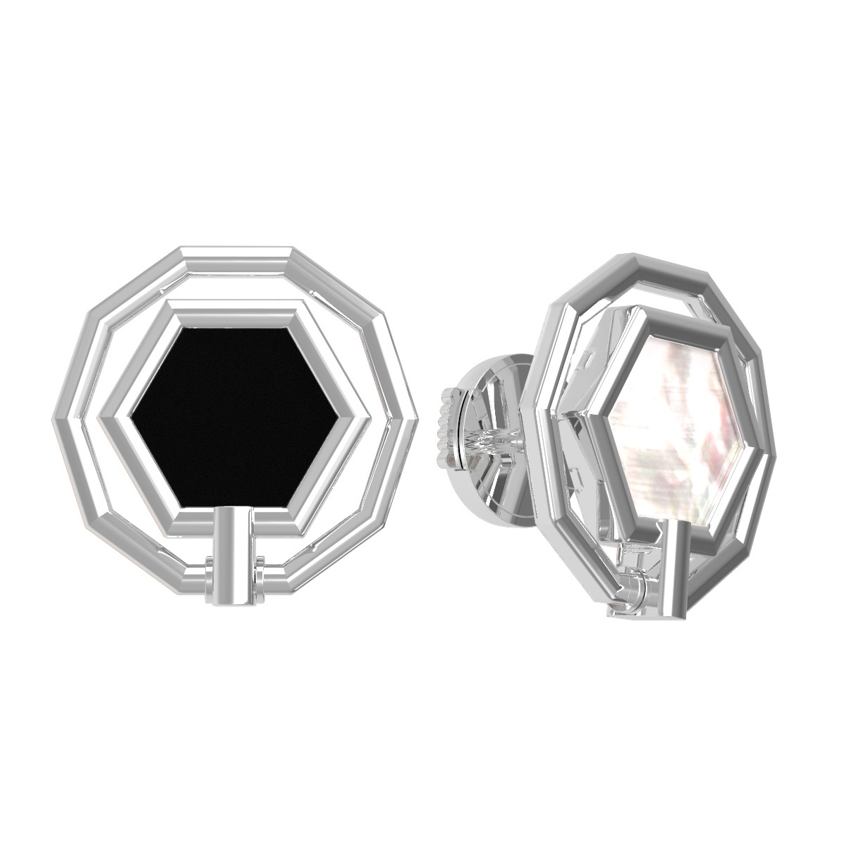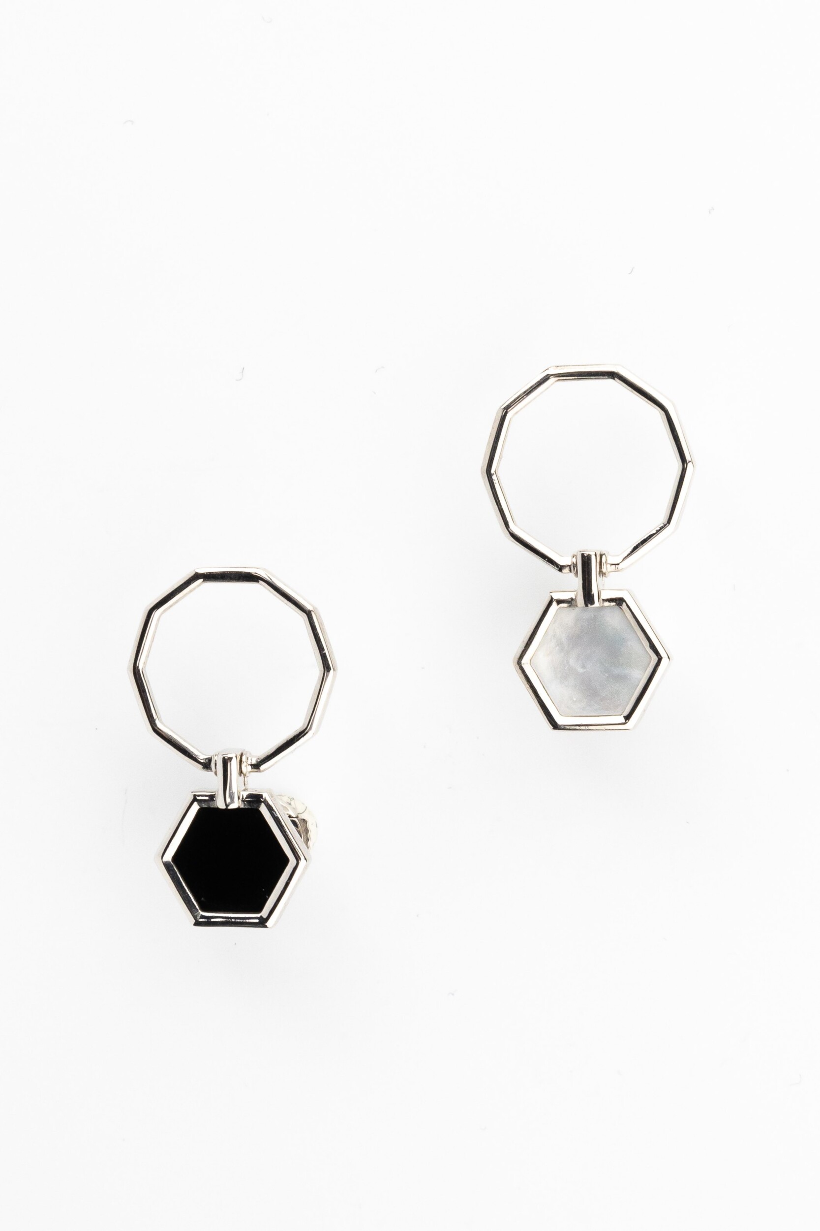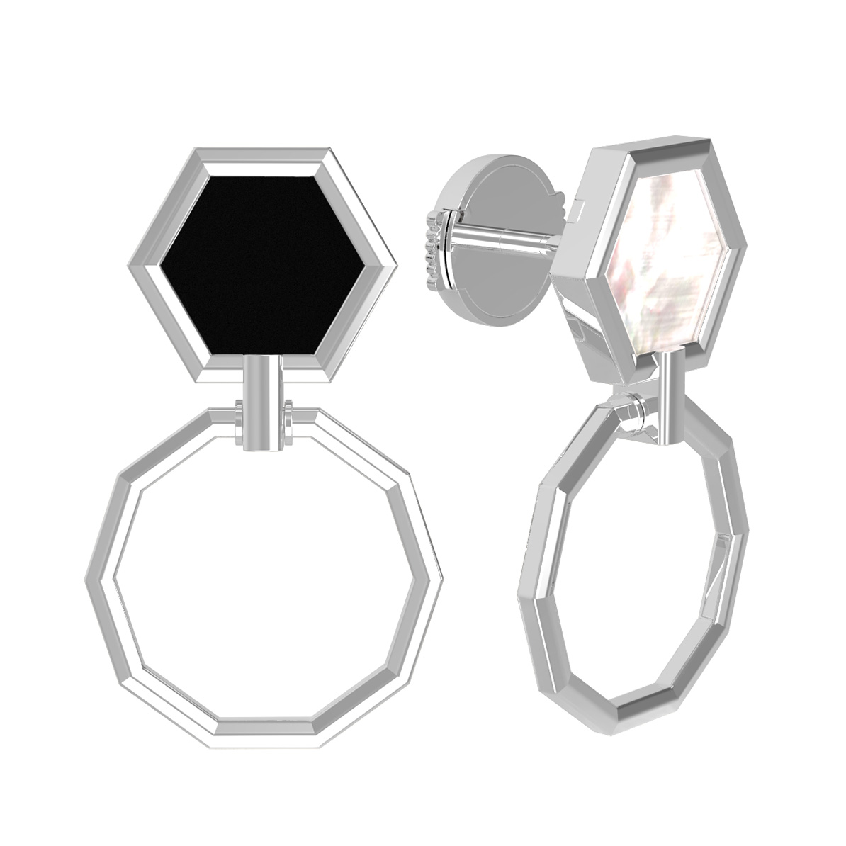 Украшение выполнено из качественного белого золота 585 пробы, чей холодный блеск идеально подчеркивает контраст вставок. Центральным элементом дизайна является форма шестигранника, которая придает изделию архитектурный и современный вид. В качестве вставок использованы натуральный оникс черного цвета и нежный перламутр, создающие интригующее сочетание темных и светлых оттенков. Каждая серьга содержит по одной вставке, акцентирующей внимание на продуманной конструкции украшения.