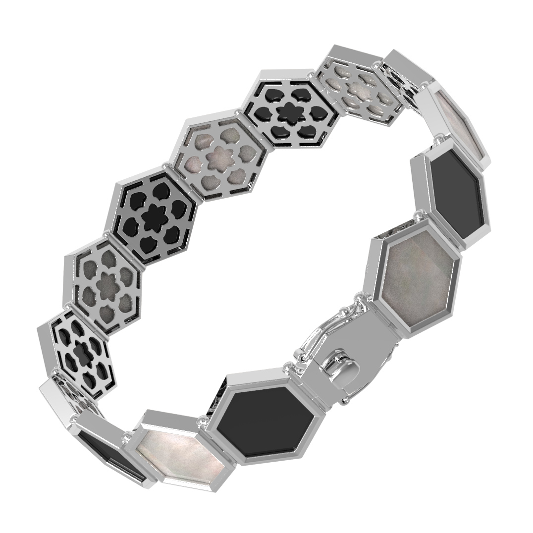 Основой композиции служат 14 вставок в форме шестигранника, которые чередуются между собой. Глубокий, насыщенный черный цвет оникса эффектно контрастирует с мягким, переливающимся блеском перламутра, создавая гармоничный дуэт. Белый металл подчеркивает благородство этих натуральных материалов, придавая браслету из серии De Luxe — Молекула завершенный и строгий вид.