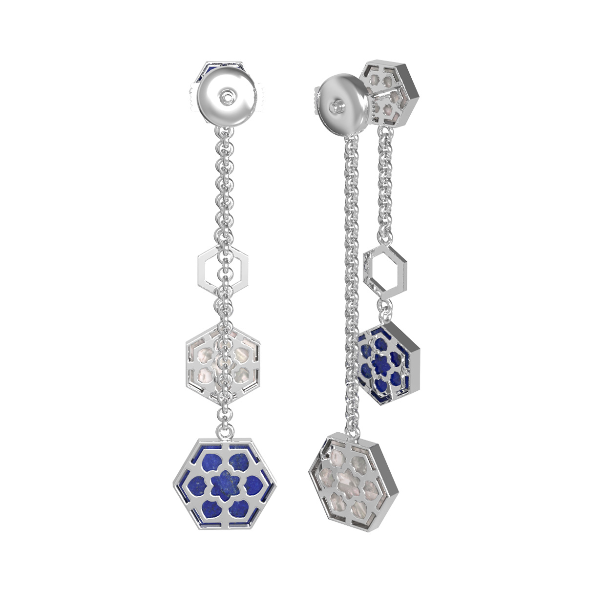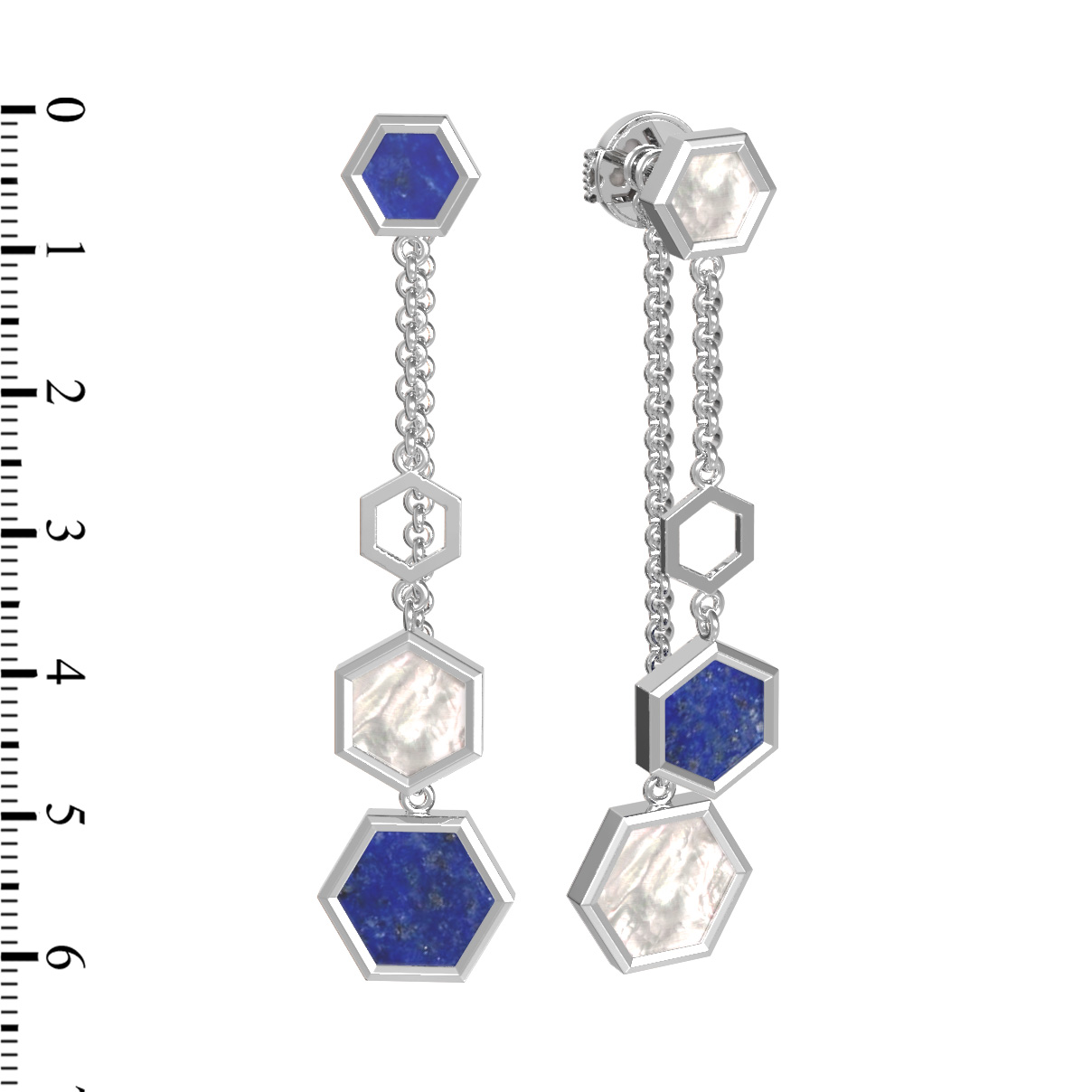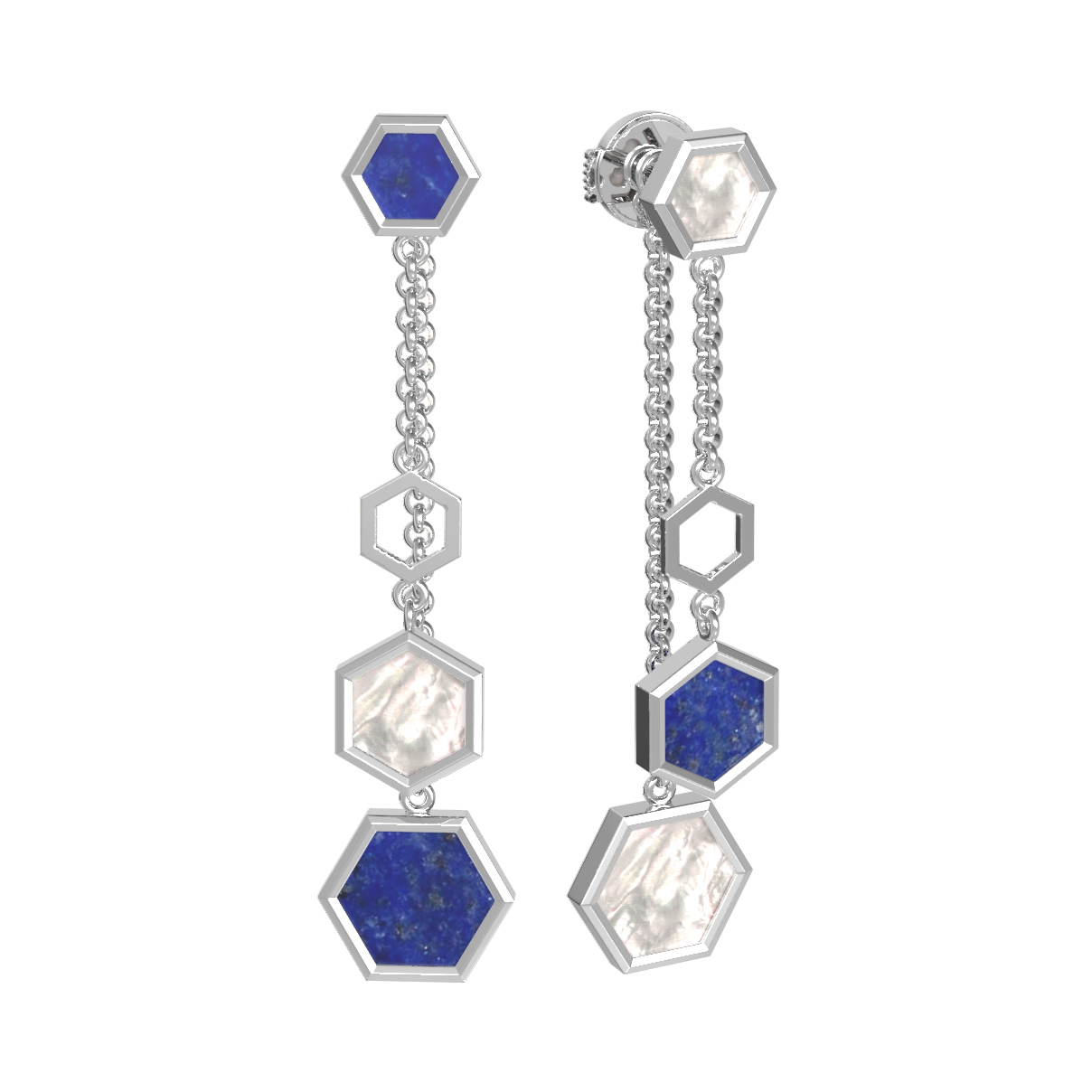 В дизайне модели использовано три вставки в форме шестигранника на каждом изделии, что создает динамичный и необычный визуальный эффект. Контрастное сочетание синего лазурита и нежного перламутра делает серьги по-настоящему выразительным аксессуаром. Геометрические линии и продуманная структура подвесных элементов придают украшению легкость, при этом сохраняя строгость и статусность изделия.