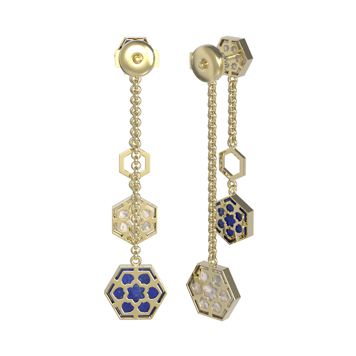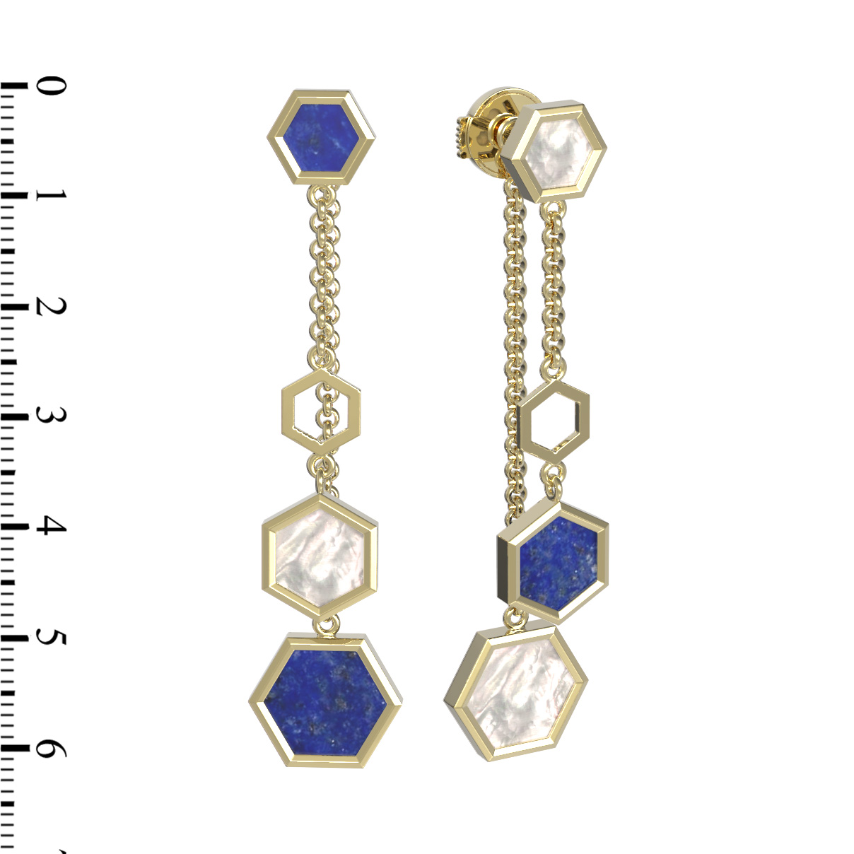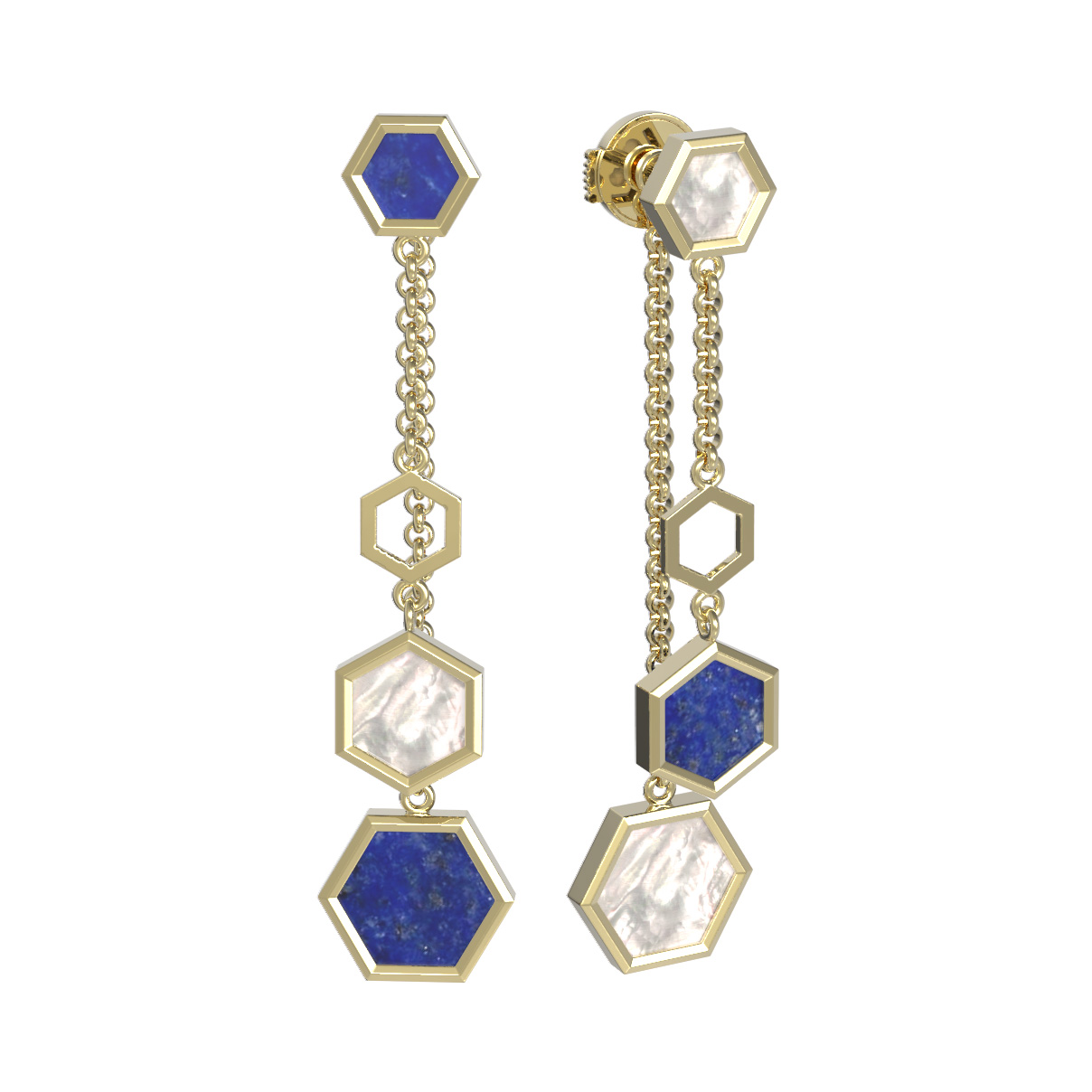 Центральным элементом композиции стали вставки в форме шестигранника. Лазурит глубокого синего цвета соседствует с нежным, переливающимся перламутром, создавая выразительный визуальный эффект. Каждая серьга включает 3 вставки, искусно встроенные в структуру изделия, напоминающую цепочку молекулярных связей. Такое архитектурное решение делает украшение по-настоящему особенным.