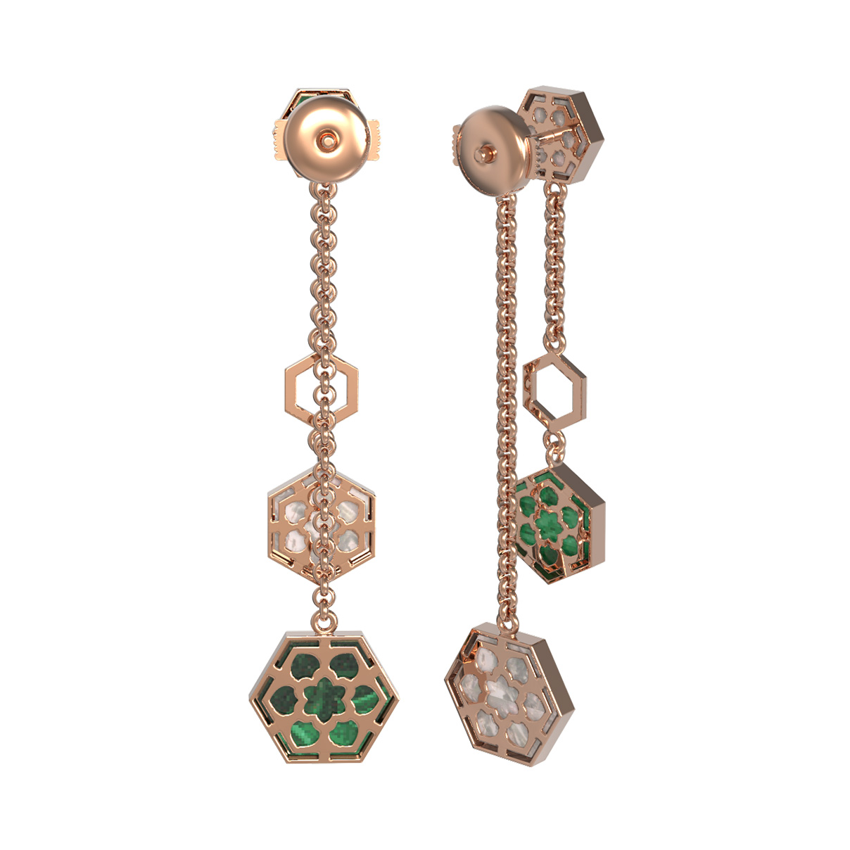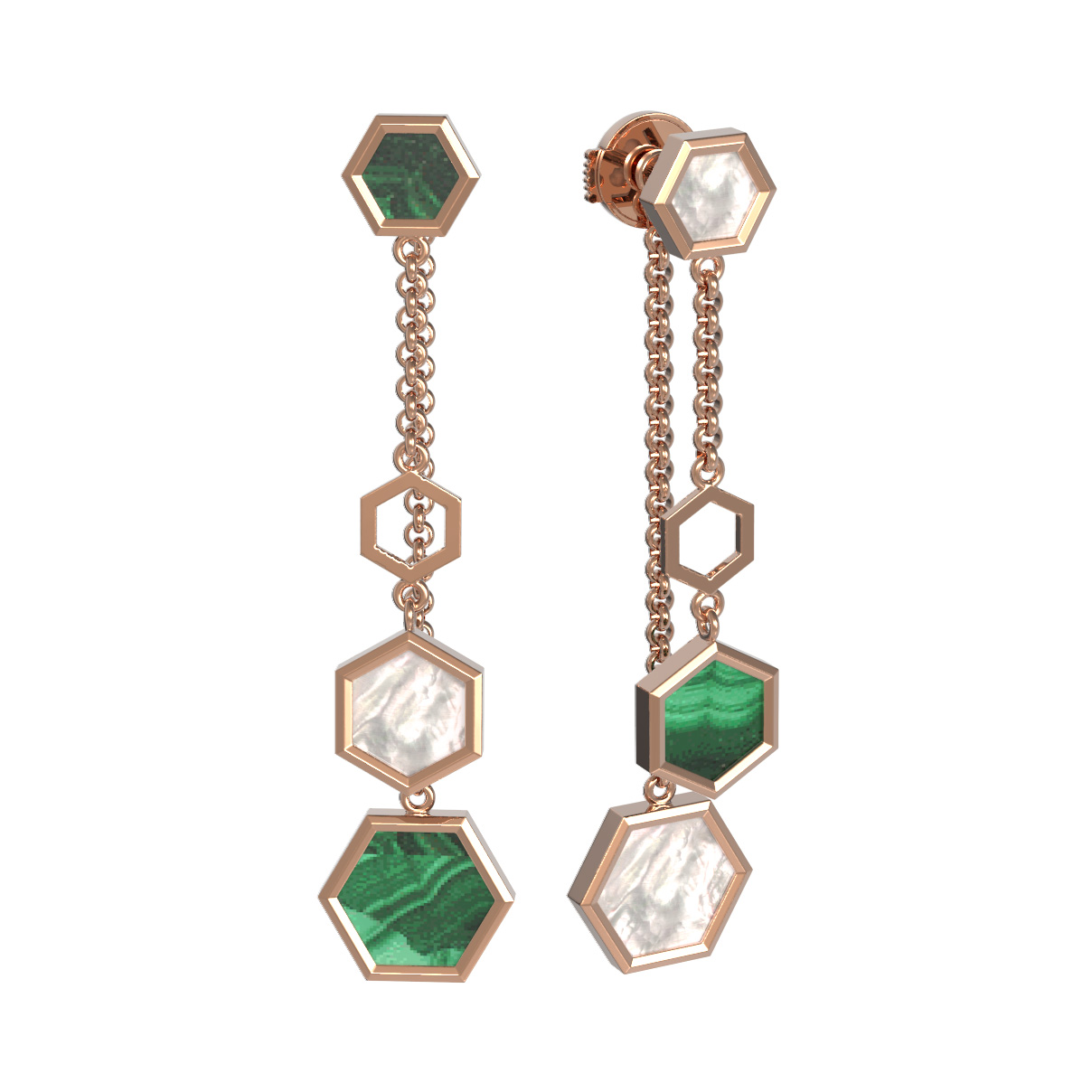 В центре внимания — три вставки изысканной формы в виде шестигранника. Глубокий зеленый оттенок малахита в сочетании с нежным перламутровым сиянием создает контрастный, притягательный образ. Цветовая палитра вставок подчеркивает благородство красного золота, из которого выполнена оправа и элементы цепочек. Эти серьги созданы для тех, кто ценит архитектурную точность и природные мотивы.