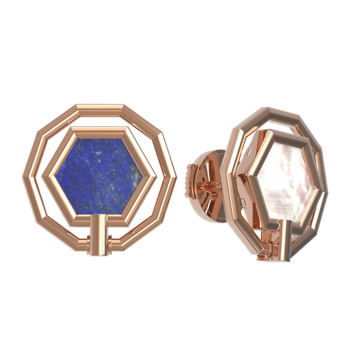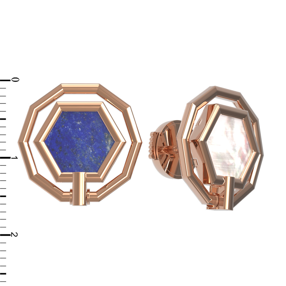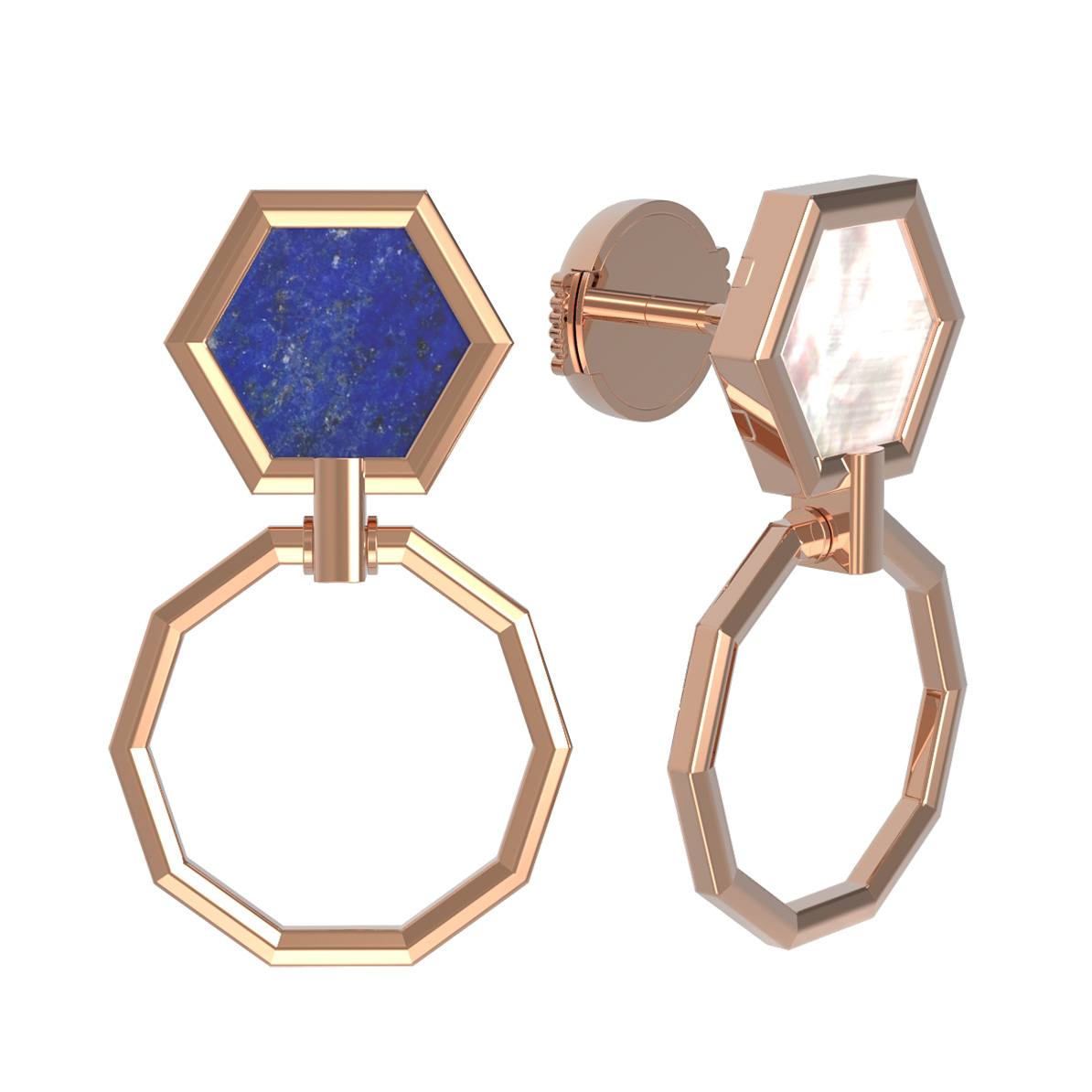 Серьги выполнены из благородного красного золота 585 пробы, чей теплый оттенок гармонично сочетается с контрастными вставками. Особенность этой модели заключается в эффектном контрасте материалов: одна сторона украшена насыщенным синим лазуритом, а другая — нежным перламутром. Вставки имеют строгую форму шестигранника, что придает изделию архитектурную четкость и завершенность. По одной вставке в каждом украшении создают сбалансированную композицию, которая притягивает взгляд.
