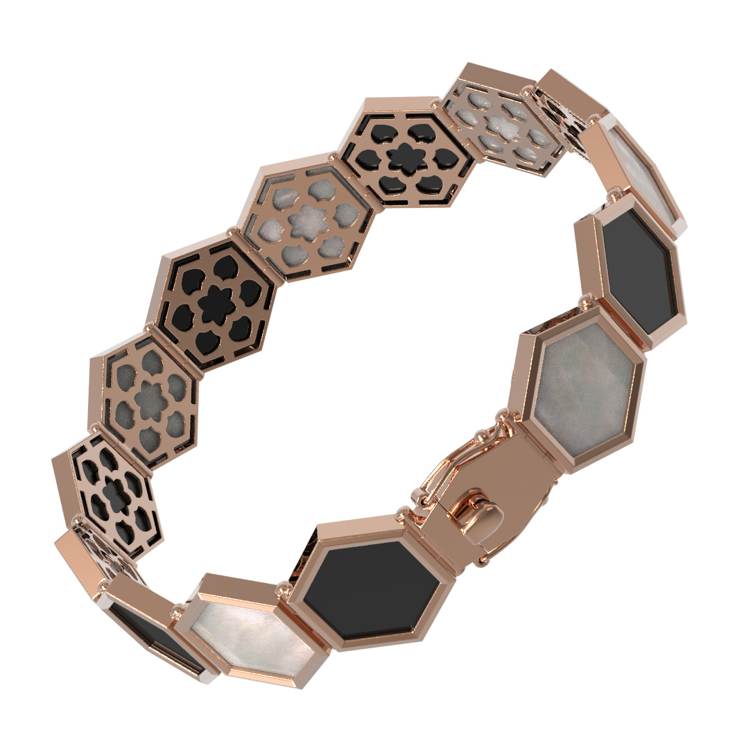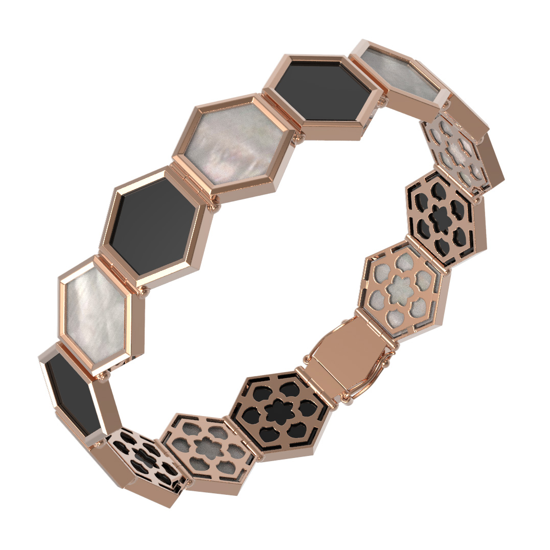 Это универсальное изделие подходит как для женщин, так и для мужчин, предпочитающих лаконичные и концептуальные украшения. Браслет из красного золота с ониксом и перламутром может стать как самостоятельным дополнением вашего гардероба, так и частью гармоничного ансамбля, так как данная модель отлично сочетается с другими украшениями из этой серии. Добавьте в свою коллекцию аксессуар, объединяющий безупречное качество исполнения и оригинальный геометрический стиль.