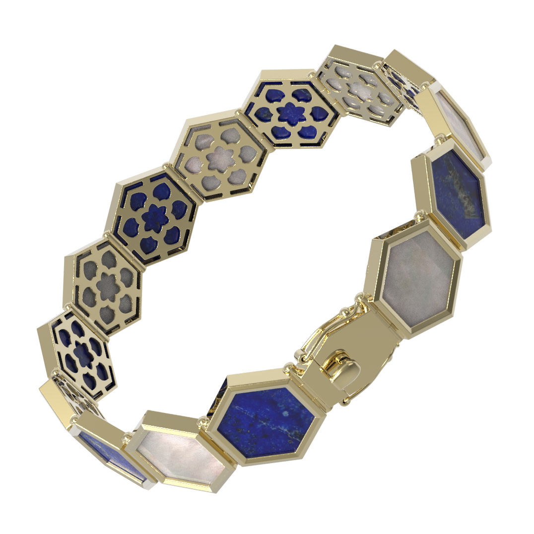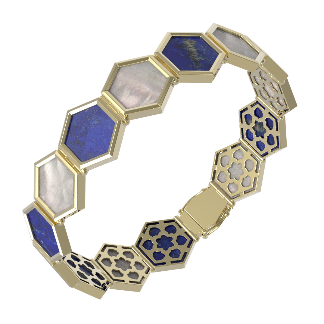 Для создания этого ювелирного изделия мастера выбрали контрастное сочетание материалов. Глубокий синий оттенок лазурита в сочетании с нежным перламутром подчеркивает благородство лимонного золота. Внешняя сторона браслета выполнена с гладкими вставками, а тыльная часть каждого звена декорирована тонким ажурным узором, напоминающим цветочные мотивы. Такое внимание к деталям делает украшение полноценным произведением ювелирного искусства.