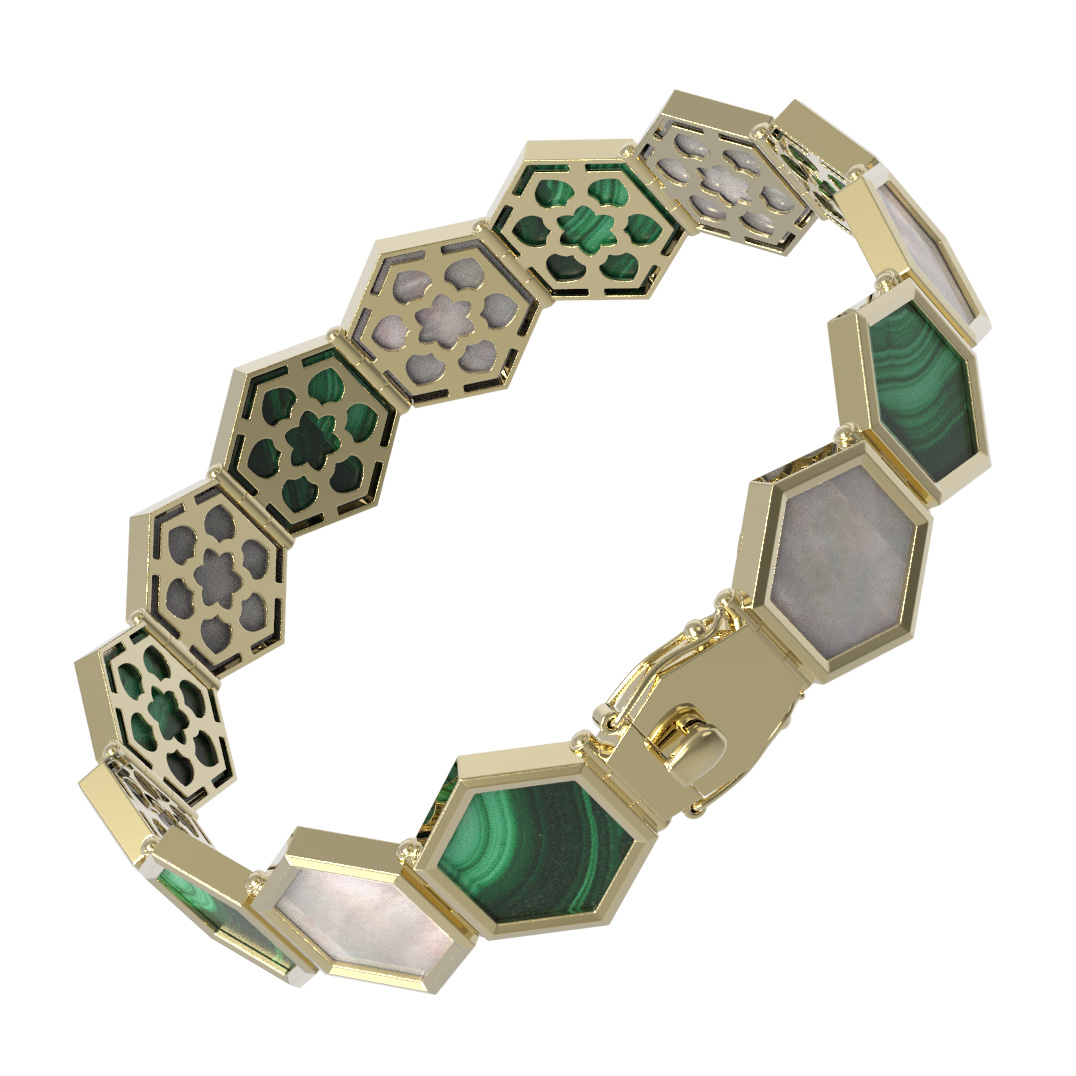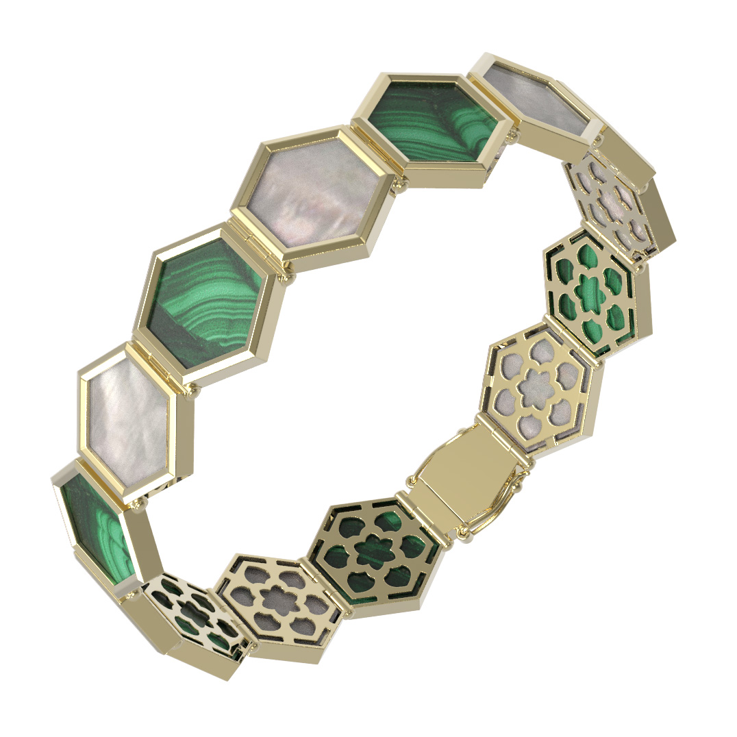 Особую выразительность браслету придает сочетание натуральных вставок: глубокий зеленый малахит контрастирует с нежным переливом перламутра. Четырнадцать вставок имеют форму шестигранника, что идеально подчеркивает концепцию дизайна. Надежная конструкция делает этот браслет подходящим как для женщин, так и для мужчин, добавляя акцент в любой ансамбль. Данная модель доступна в размерах 17 и 18.5, что позволяет подобрать идеальную посадку на запястье.