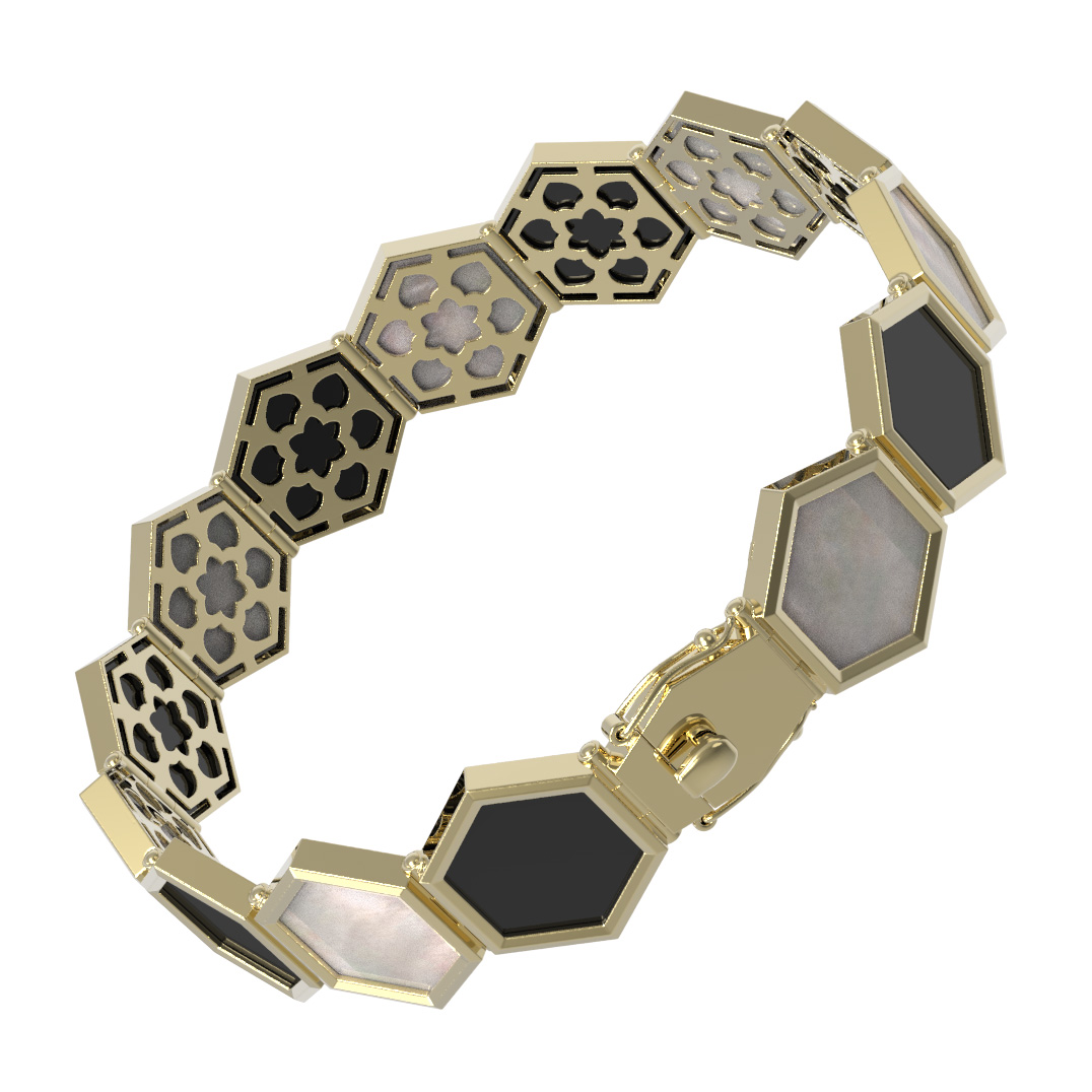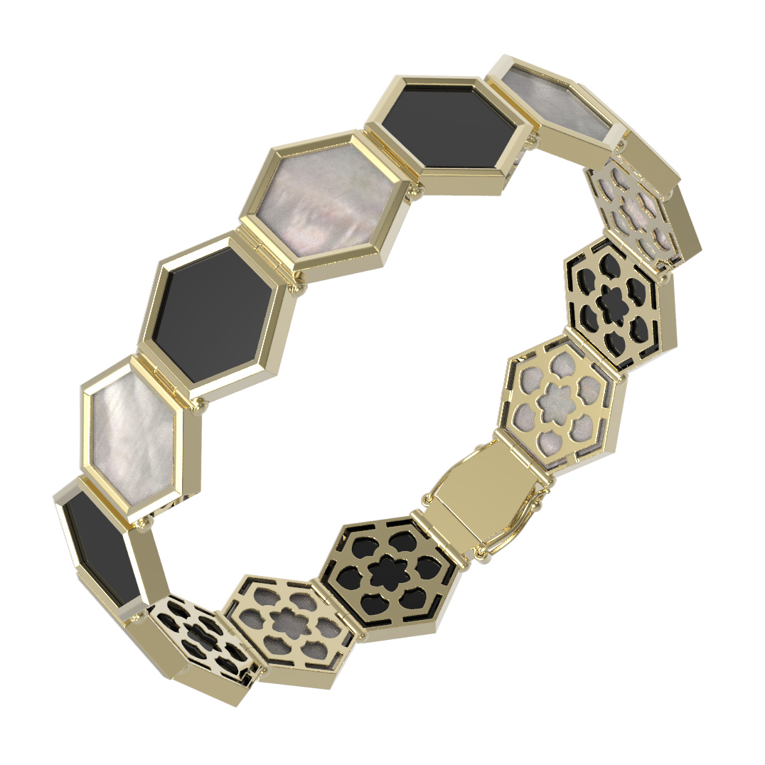 Особую выразительность браслету придают вставки: глубокий черный оникс контрастирует с нежным перламутром, что создает гармоничный и сбалансированный цветовой дуэт. Всего в изделии использовано 14 вставок формы шестигранник, каждая из которых надежно закреплена в золотую оправу. Тщательно проработанная обратная сторона элементов украшена филигранным узором, подчеркивающим премиальный статус изделия.
