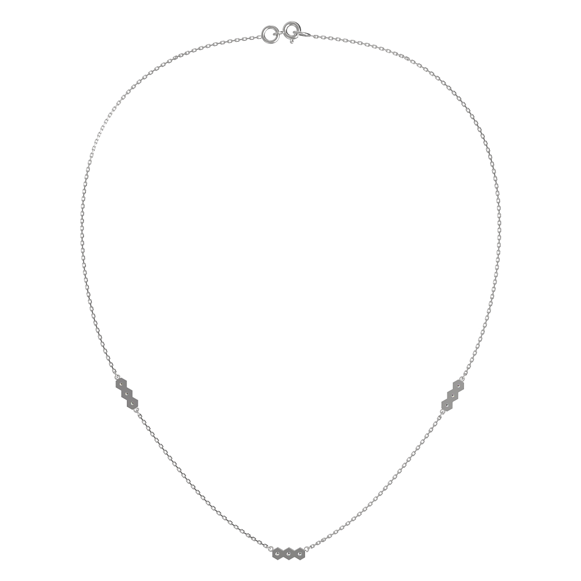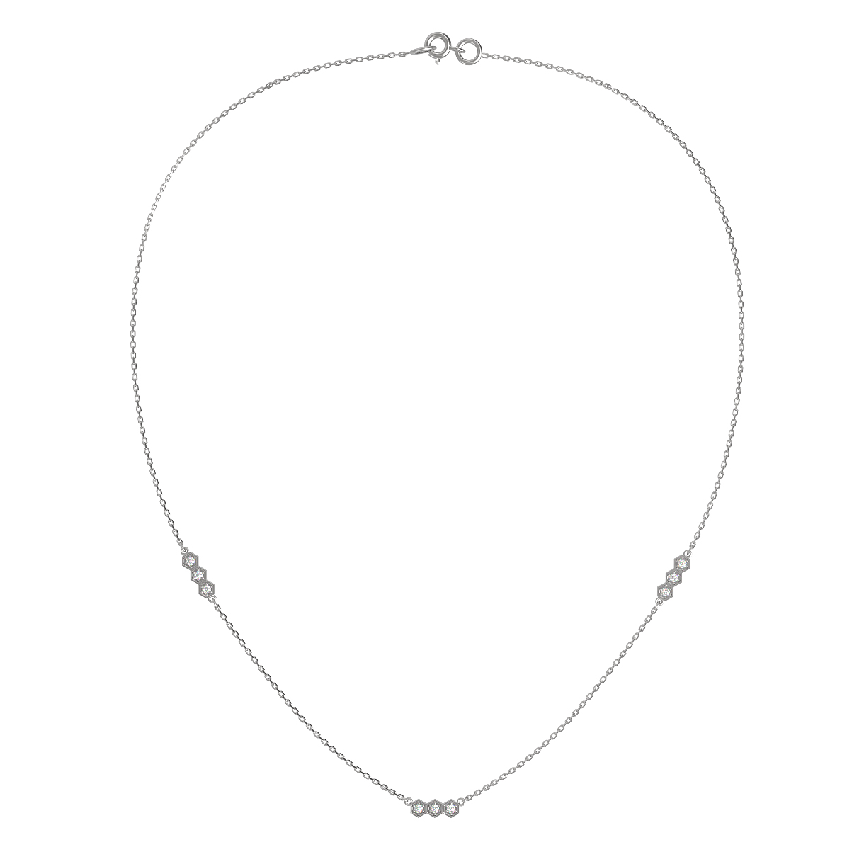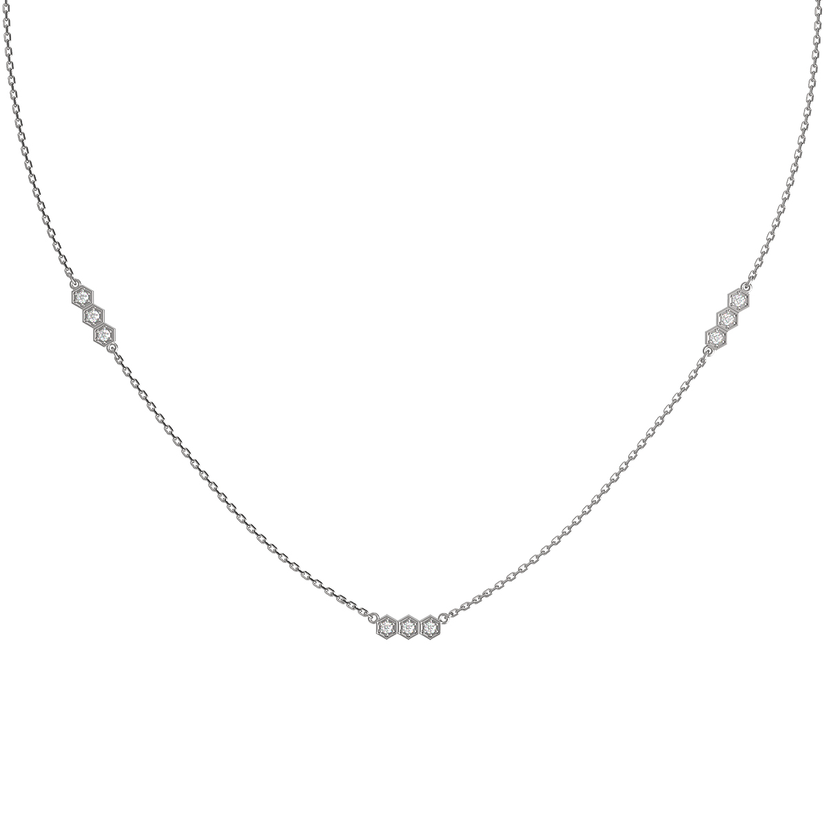 Колье из белого золота 585 пробы из коллекции De Luxe — Молекула представляет собой воплощение современной элегантности и утонченного дизайна. Ювелирное изделие вдохновлено эстетикой микромира, что подчеркивается уникальным дизайном в форме молекулы. Деликатная цепочка из белого золота дополнена изысканными вставками в форме шестиугольников, внутри которых закреплены сияющие бриллианты.