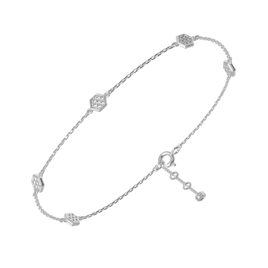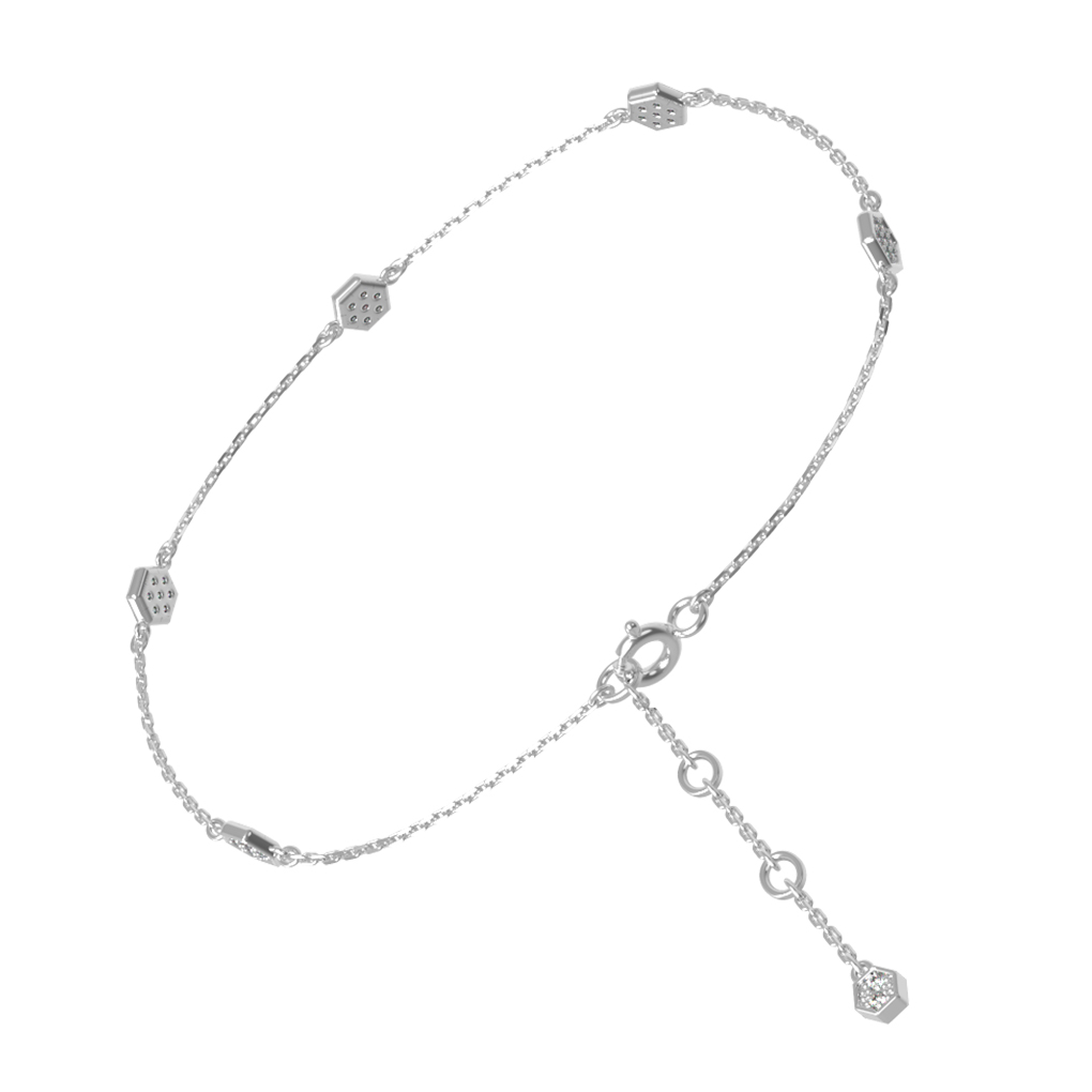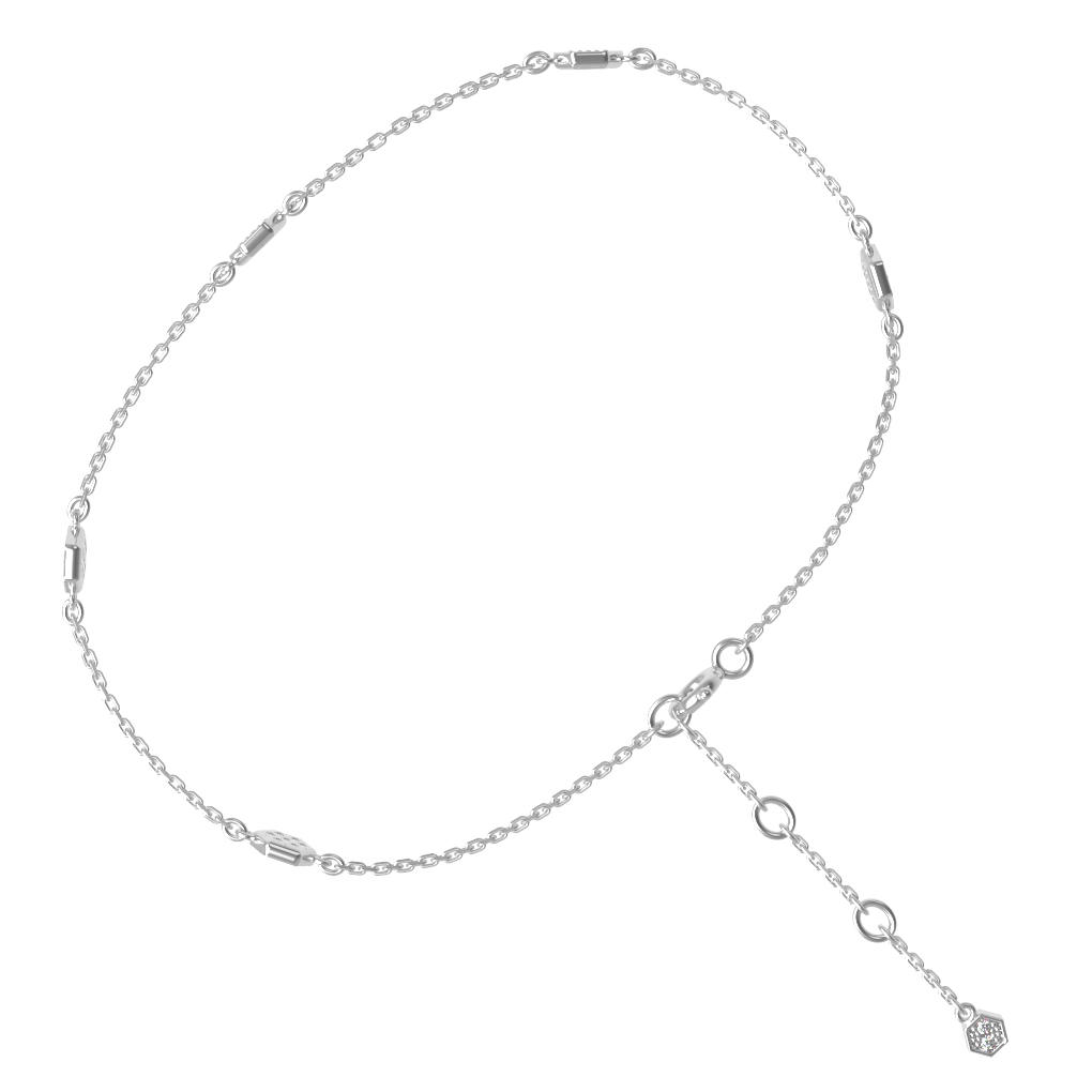 Изящный браслет из белого золота 585 пробы — это воплощение современной эстетики и утонченного стиля. Данное изделие входит в состав коллекции De Luxe — Молекула и привлекает внимание своим необычным дизайнерским решением, обыгрывающим структуру молекулы. Тонкая, прочная цепочка гармонично дополнена декоративными элементами геометрической формы, которые придают украшению уникальный и узнаваемый облик.