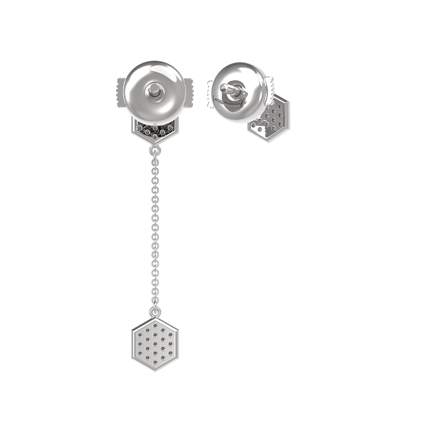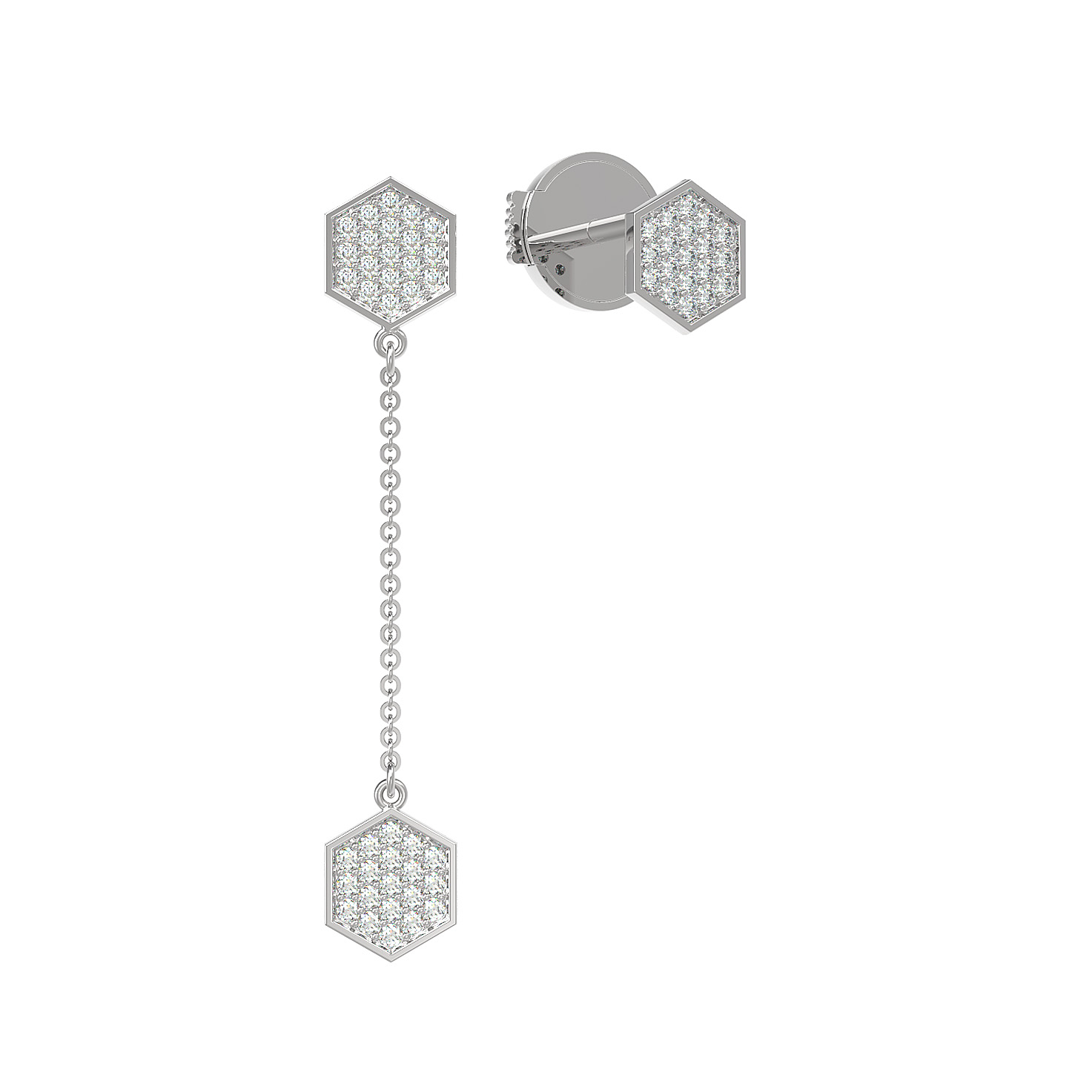 Центральным элементом композиции стали 57 бриллиантов круглой формы с чистым белым цветом вставок. Огранка камней обеспечивает безупречную игру света при каждом движении, создавая роскошное сияние. Визуальная строгость шестиугольных элементов в сочетании с изящной цепочкой делает эти серьги универсальным аксессуаром, который одинаково хорошо подойдет как для женщин, так и для мужчин, предпочитающих лаконичные и статусные украшения.
