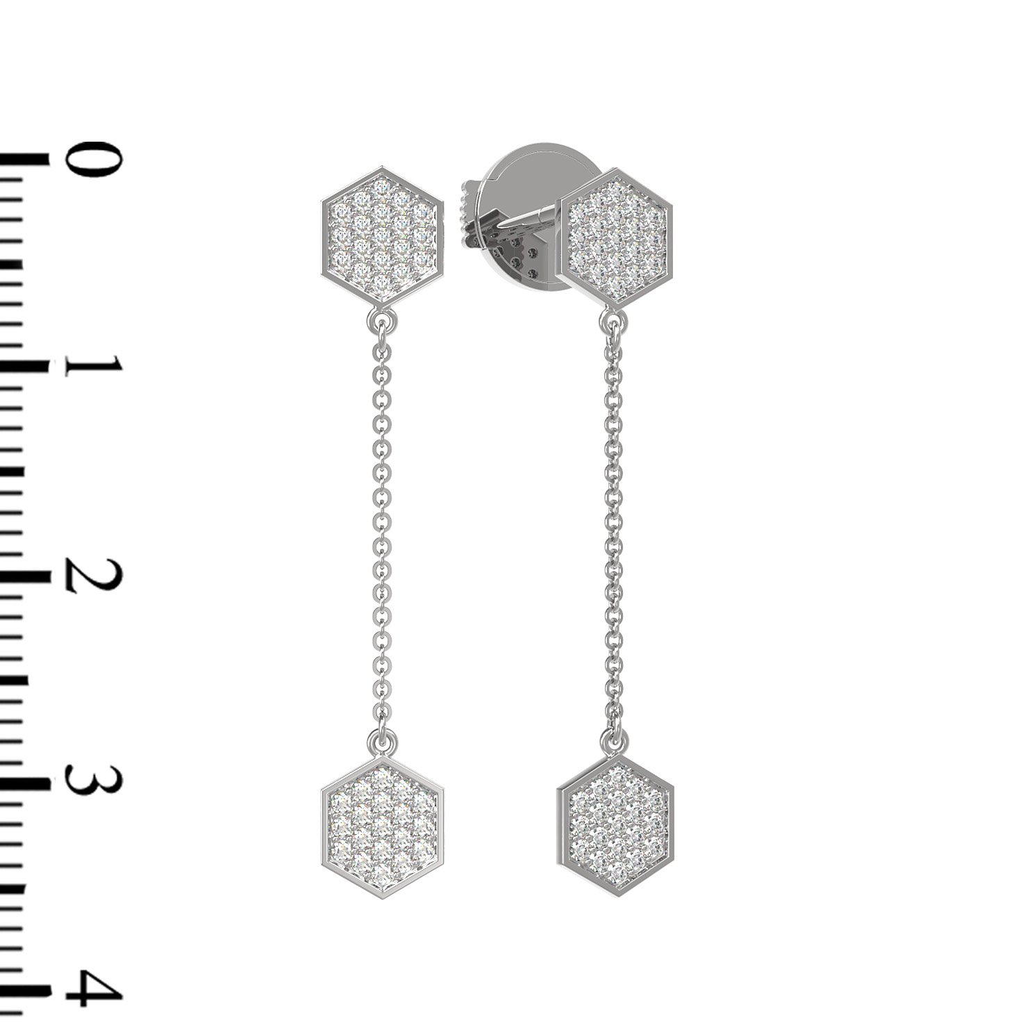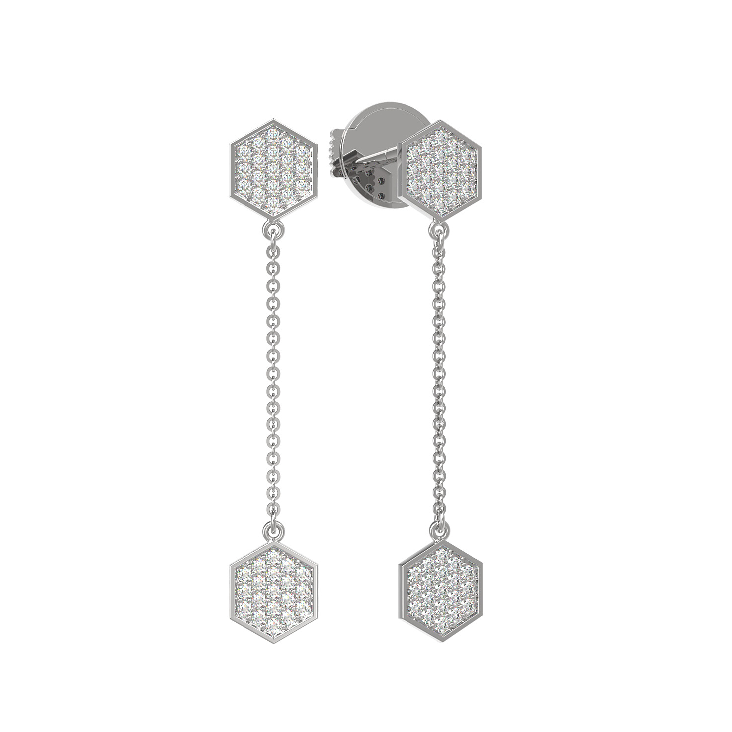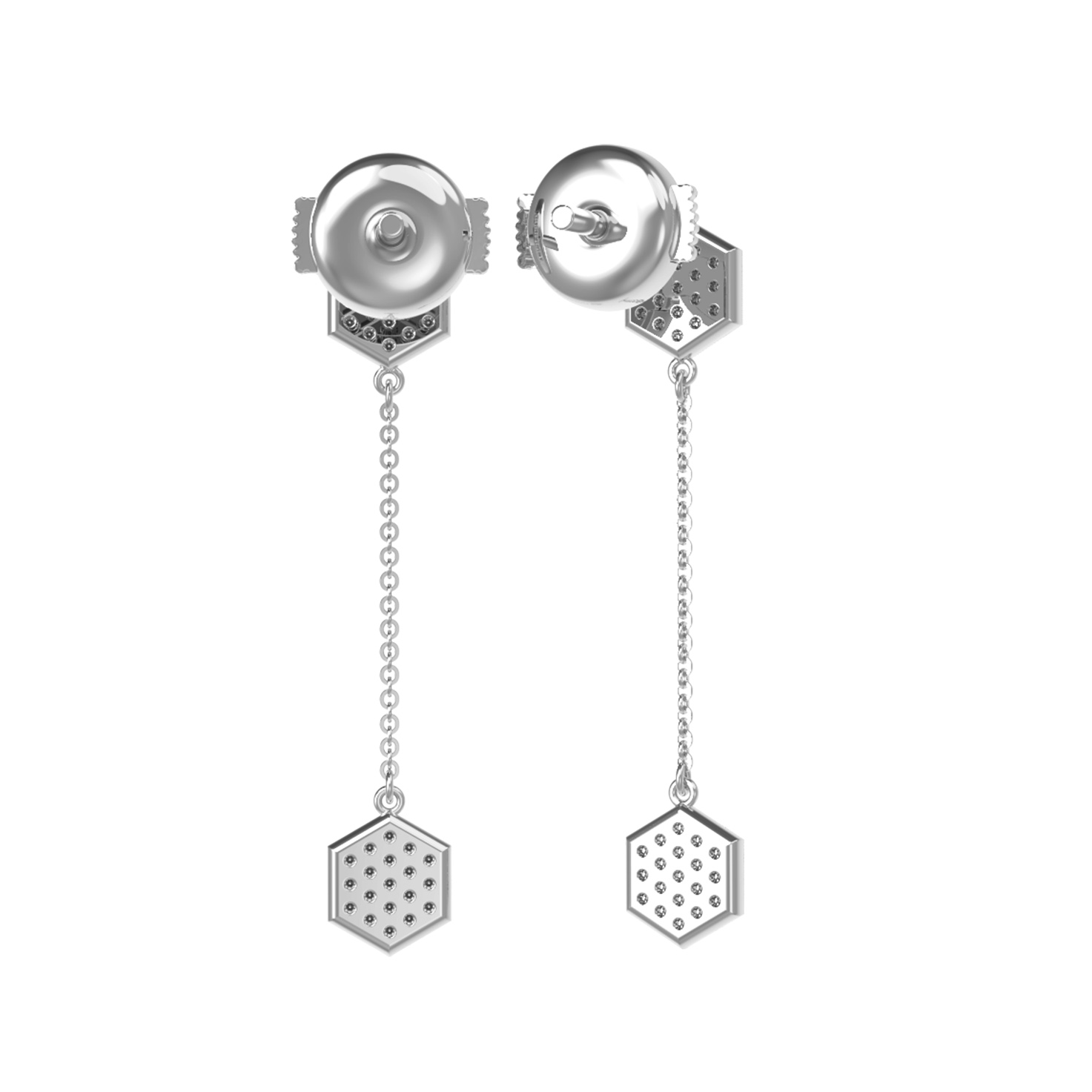 Серьги из белого золота 585 пробы из коллекции De Luxe — Молекула представляют собой образец современного ювелирного искусства. Их дизайн, вдохновленный концепцией молекулы, подчеркивает стремление к геометрической точности и эстетике. Лаконичная форма шестиугольников в сочетании с подвижными элементами-цепочками создает эффектный и динамичный образ, который привлекает внимание своей гармонией и чистотой линий.