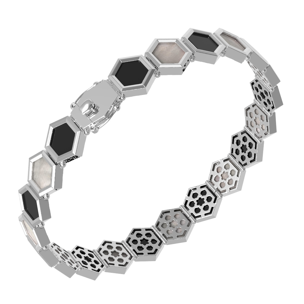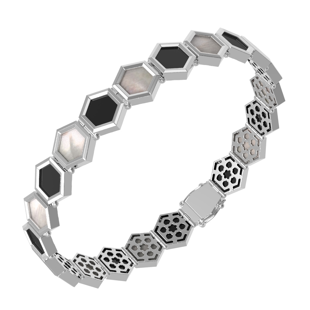 Особую выразительность модели придают вставки из натуральных камней. Контрастное сочетание глубокого черного оникса и нежного перламутра создает эффектную игру света и тени, приковывая взгляд к запястью. Всего в браслете используется 42 вставки, которые гармонично распределены по всей длине изделия, создавая единую завершенную композицию. Ювелирная работа и внимание к деталям делают это украшение заметным акцентом в любом гардеробе.
