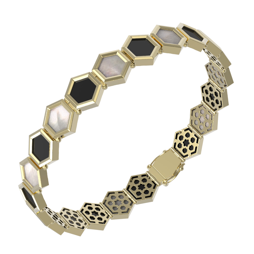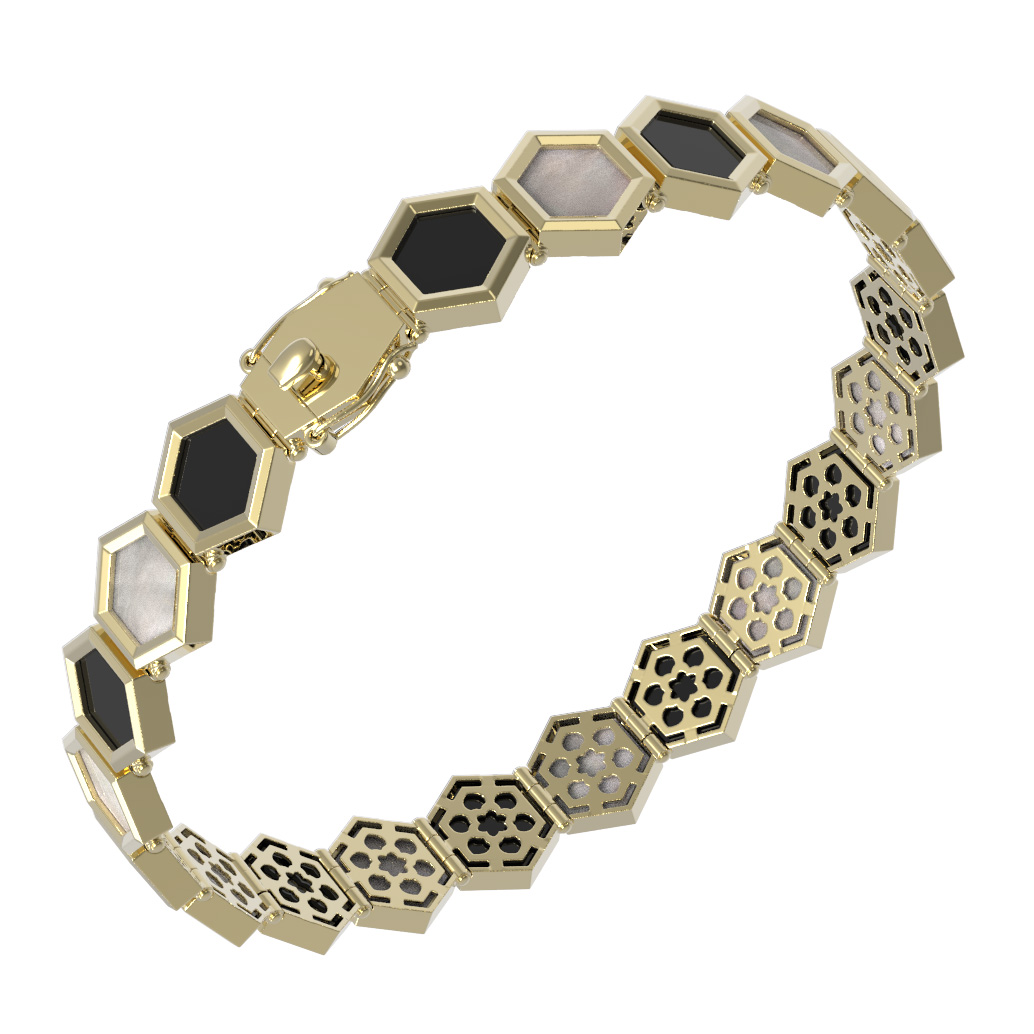 Эффектный браслет из лимонного золота 585 пробы станет центральным акцентом вашего образа. Дизайн изделия вдохновлен структурой молекулы, что придает украшению геометрическую четкость и современный стиль. Основу композиции составляют 43 вставки в форме шестигранника, которые чередуются между собой. Контрастное сочетание черного оникса и нежного перламутра создает выразительный визуальный ритм, подчеркивая благородство драгоценного металла.