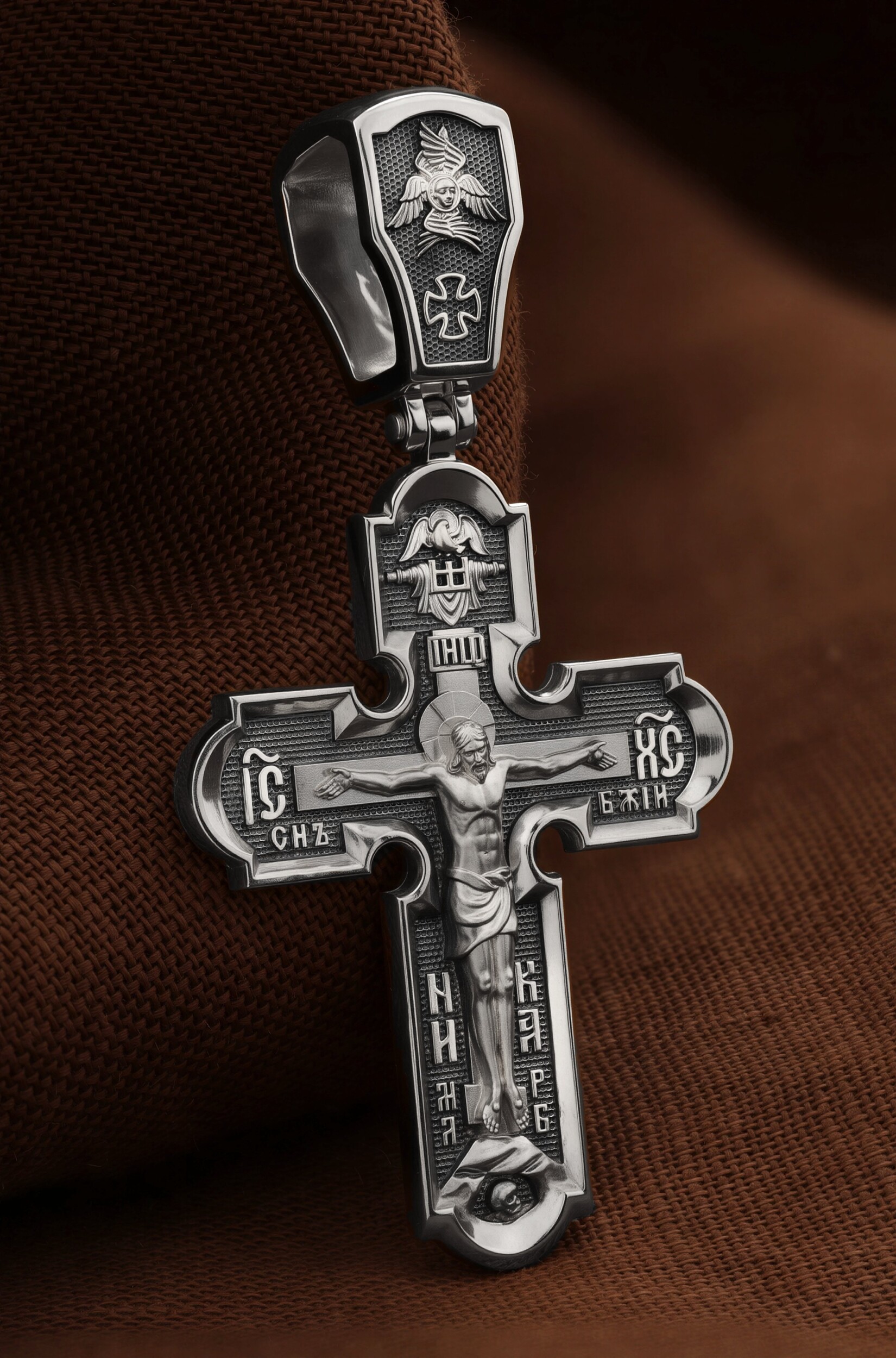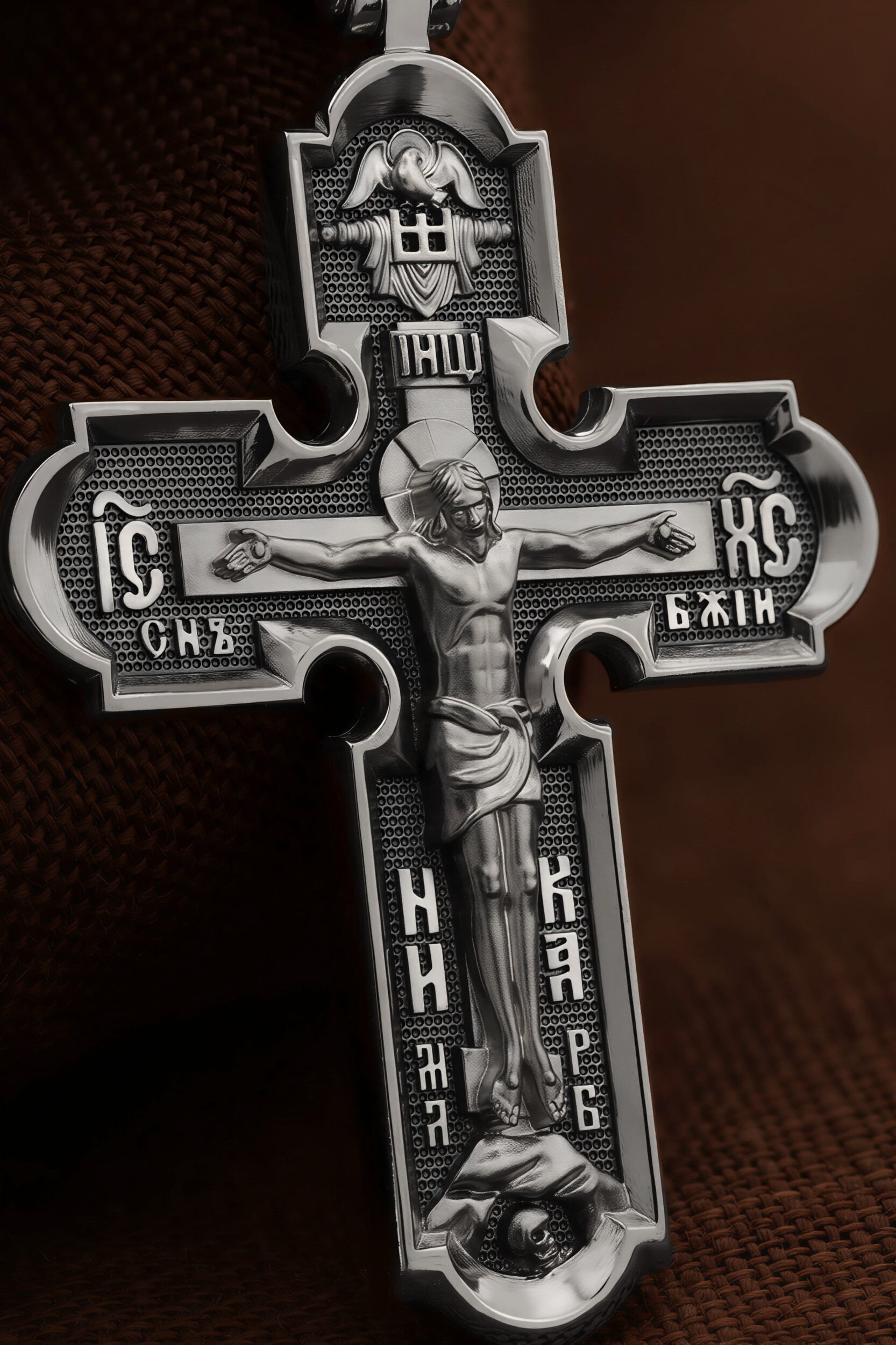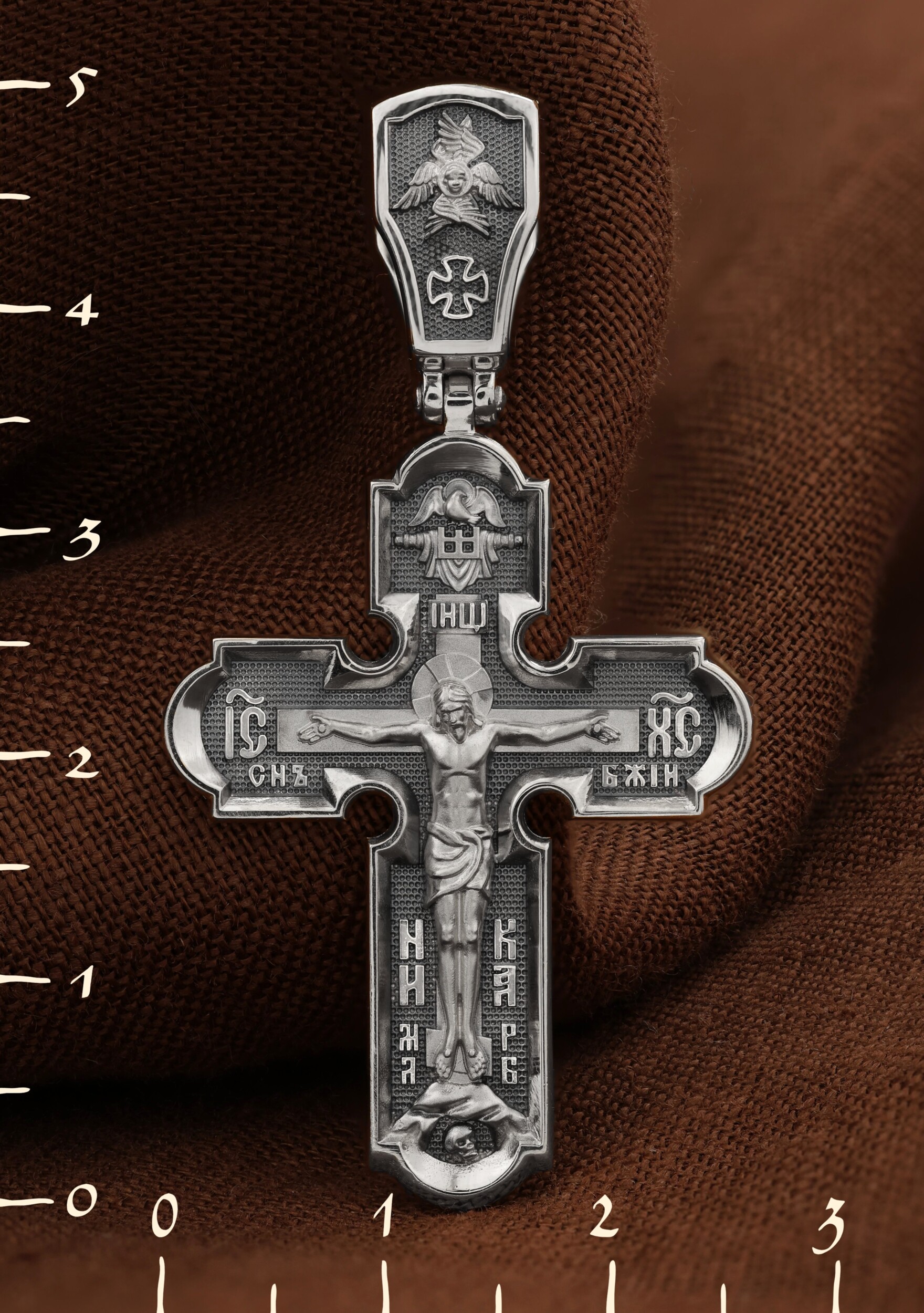 На лицевой стороне креста изображено Распятие Господа и Спасителя нашего Иисуса Христа. Крест- символ спасения и искупления рода человеческого, знамение победы над смертью и адом. Иисус Христос, как искупительная жертва освобождения человечества от власти греха, умер крестной смертью и в третий день воскрес. Верхняя перекладина символизирует титло — табличку, на которой, согласно Евангелию, было начертано: Иисус Назорей Царь Иудейский (IНЦI). Надпись «IC» «ХC», означает Иисус Христос, помещается на разных сторонах поперечной перекладины креста. Ниже перекладины расположено словосочетание «СЫН БОЖИЙ», что означает божественную природу Иисуса Христа. Надпись «МЛРБ» — «место лобное рай бысть» означает, что место лобное стало раем и помещаются в нижней части креста. Рядом — слово «НИКА», что означает «победитель». Возвышение, на котором стоит Крест, символизирует гору Голгофу, на которой произошло Распятие. Под подножием Креста изображена покоящаяся голова (череп) Адама. На кулонном кольце изображен шестикрылый Серафим.