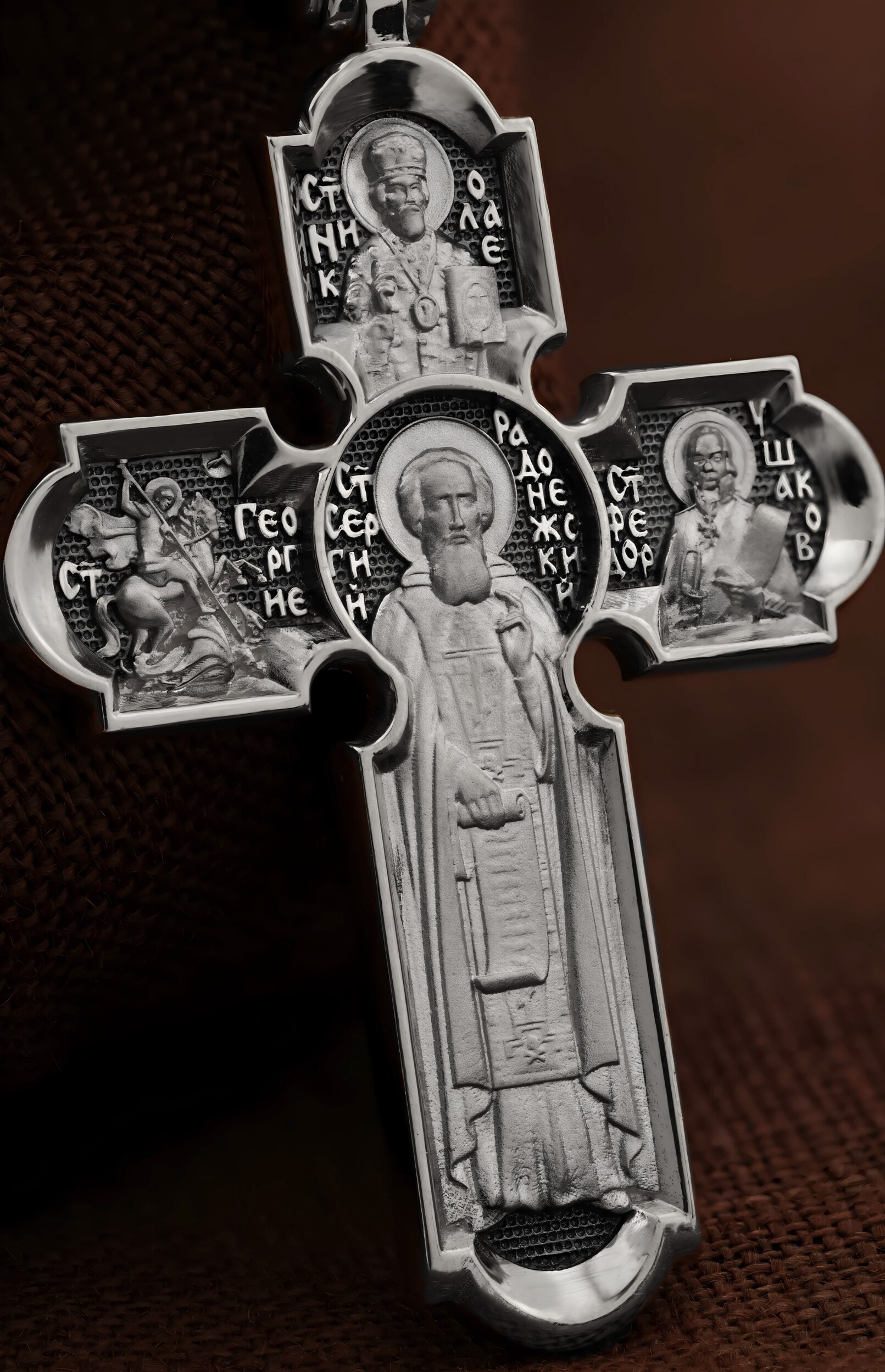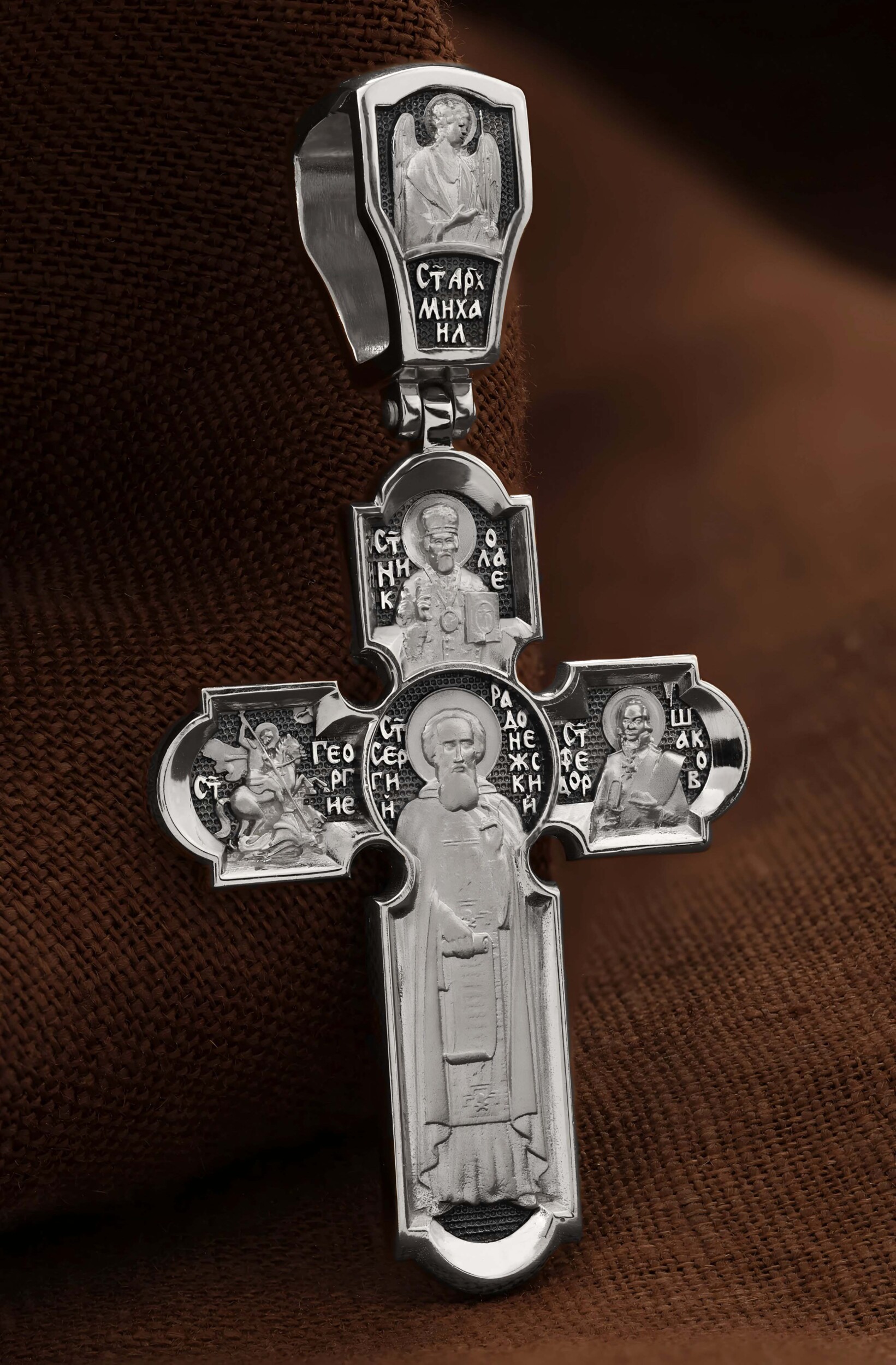 На центральной части оборотной стороны креста размещен образ Святого Преподобного Сергия, игумена Радонежского, Чудотворца. Он является духовным собирателем русского народа и русской культуры, основателем целого ряда монастырей, в том числе Троице-Сергиевой лавры под Москвой. Выше образа изображен Святитель Николай Чудотворец, архиепископ Мир Ликийских. Он является одним из самых почитаемых святых в православном мире, издревле считающийся помощником и молитвенником за всех, притекающих к нему. Слева — образ Святого Великомученика Георгия Победоносца. Он изображен как воитель, сидящий на вздыбленном коне и поражающий копьем огнедышащего змея. Змей символизирует собою сатанинские силы. Справа — образ Святого Праведного воина Феодора Ушакова. Он является выдающийся русским флотоводцем. Федор Ушаков сочетал свой высокий воинский чин с глубоким смирением, неподдельной скромностью и искренней верой. На кулонном кольце изображен образ Архангела Михаила.