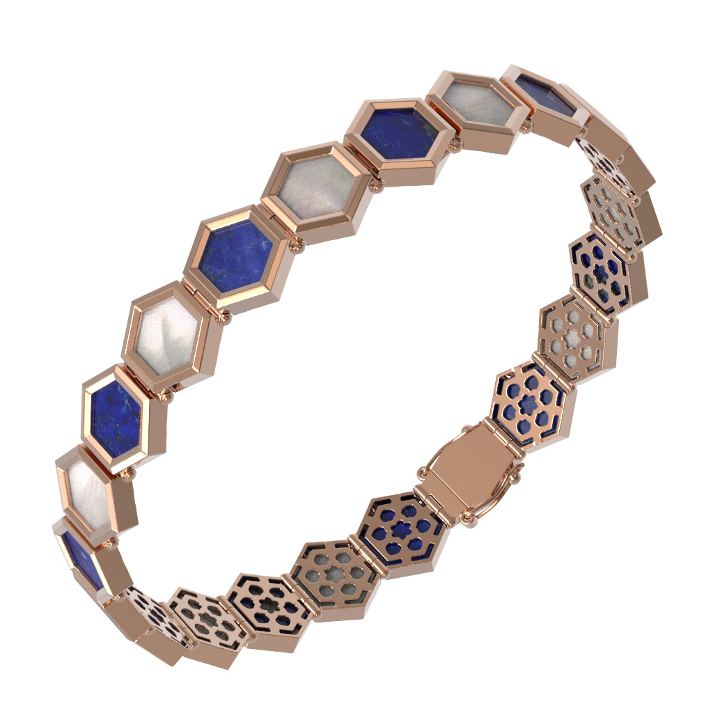В центре композиции гармонично сочетаются два контрастных камня: глубокий синий лазурит и нежный перламутр. Всего браслет насчитывает 42 вставки правильной геометрической формы, которые чередуются между собой, создавая эффектный визуальный ритм на вашем запястье. Тщательная проработка деталей видна не только снаружи, но и с внутренней стороны звеньев, где узор повторяется в золоте.