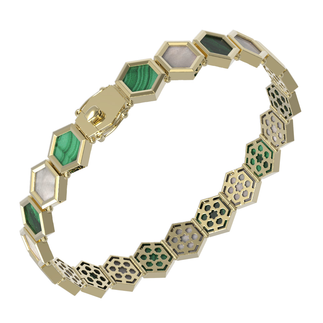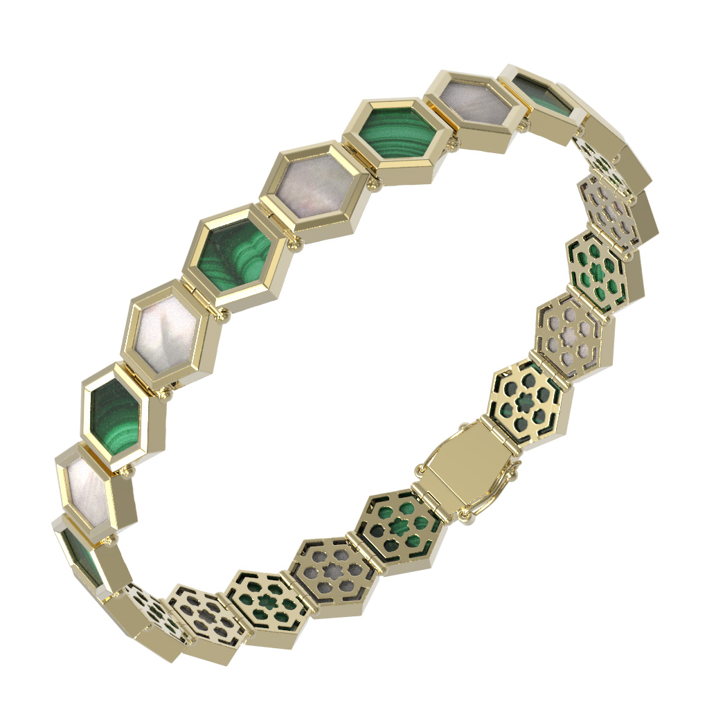 В центре внимания — эффектное сочетание контрастных материалов. Насыщенный зеленый цвет малахита и нежное сияние перламутра создают выразительный дуэт, подчеркивающий благородный оттенок лимонного золота. Ювелиры использовали 42 вставки, чтобы добиться безупречного визуального эффекта и глубины цвета. Каждая деталь браслета продумана до мелочей, а продуманный дизайн позволяет с комфортом носить украшение как женщинам, так и мужчинам.