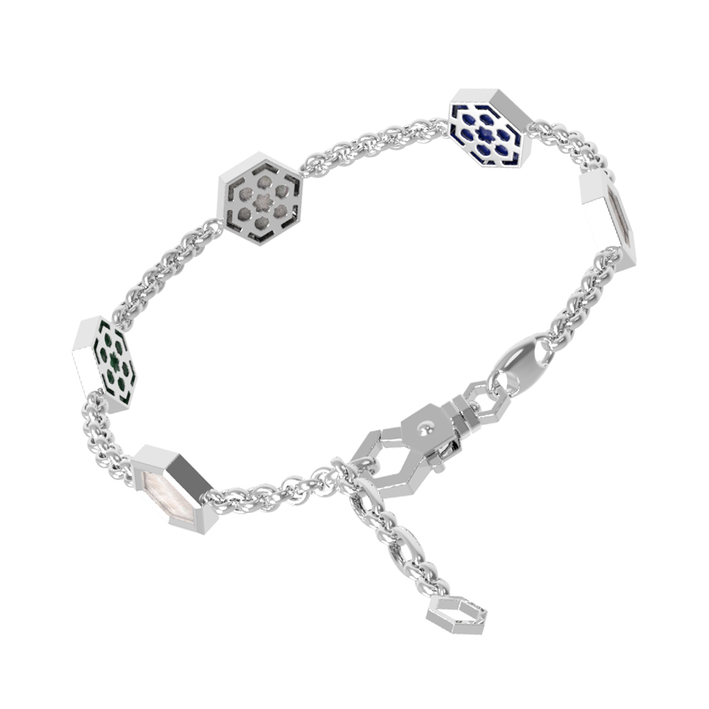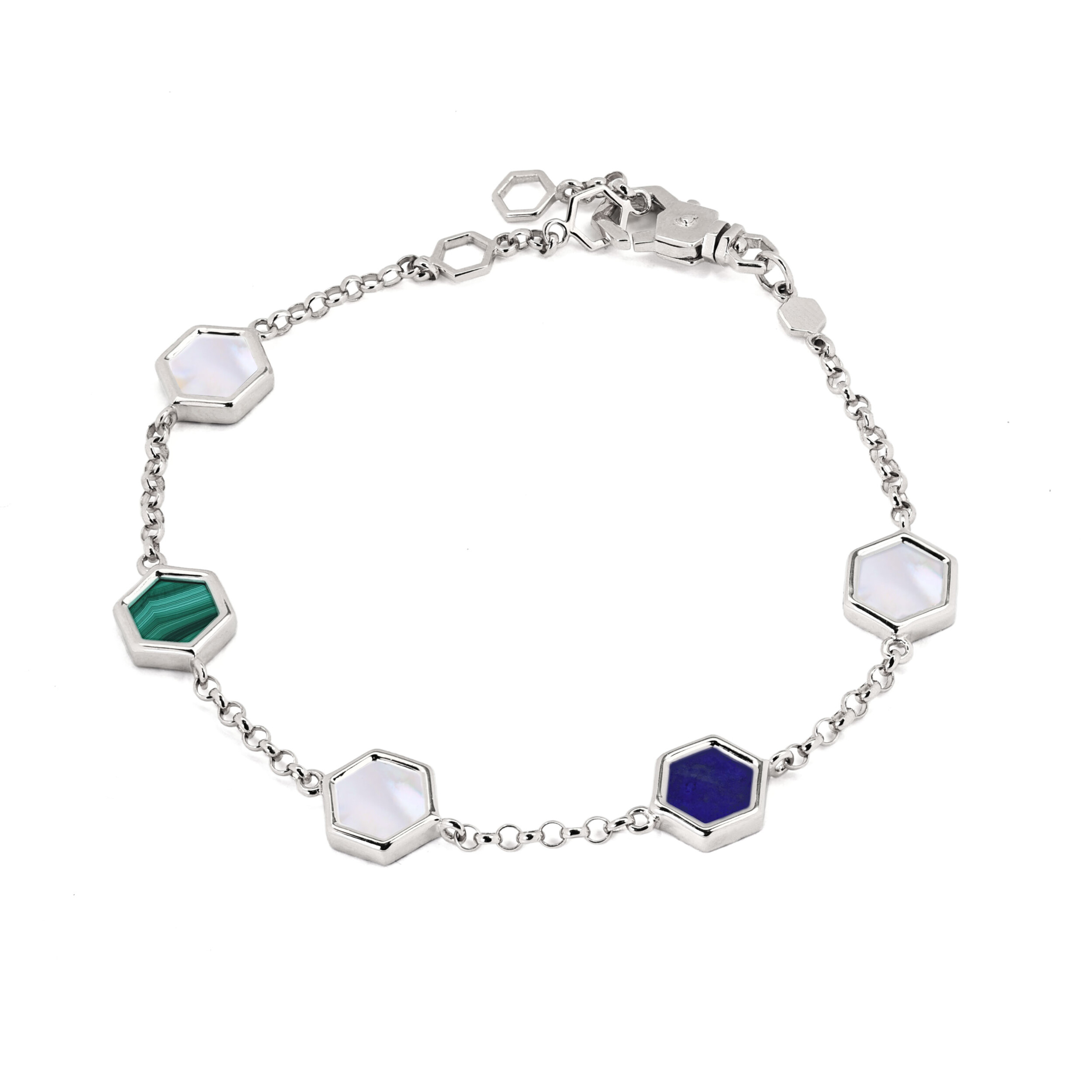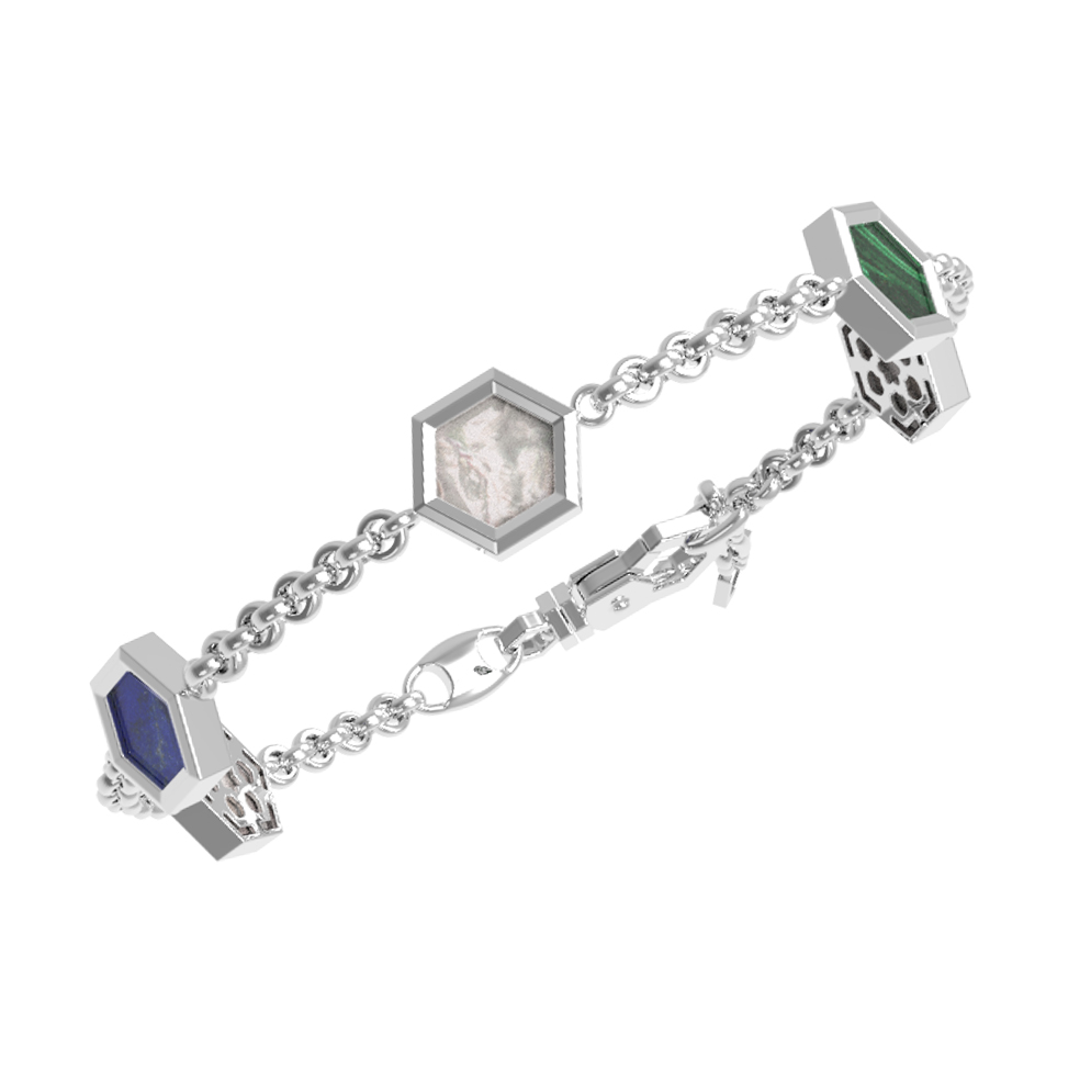 Дизайн украшения вдохновлен строгой геометрией молекулы, где центральными элементами выступают вставки в форме шестигранника. Лаконичная цепочка соединяет яркие акценты: насыщенный синий лазурит, глубокий зеленый малахит и нежный перламутр. Такое сочетание цветов придает браслету уникальный визуальный ритм, делая его заметным и стильным аксессуаром.