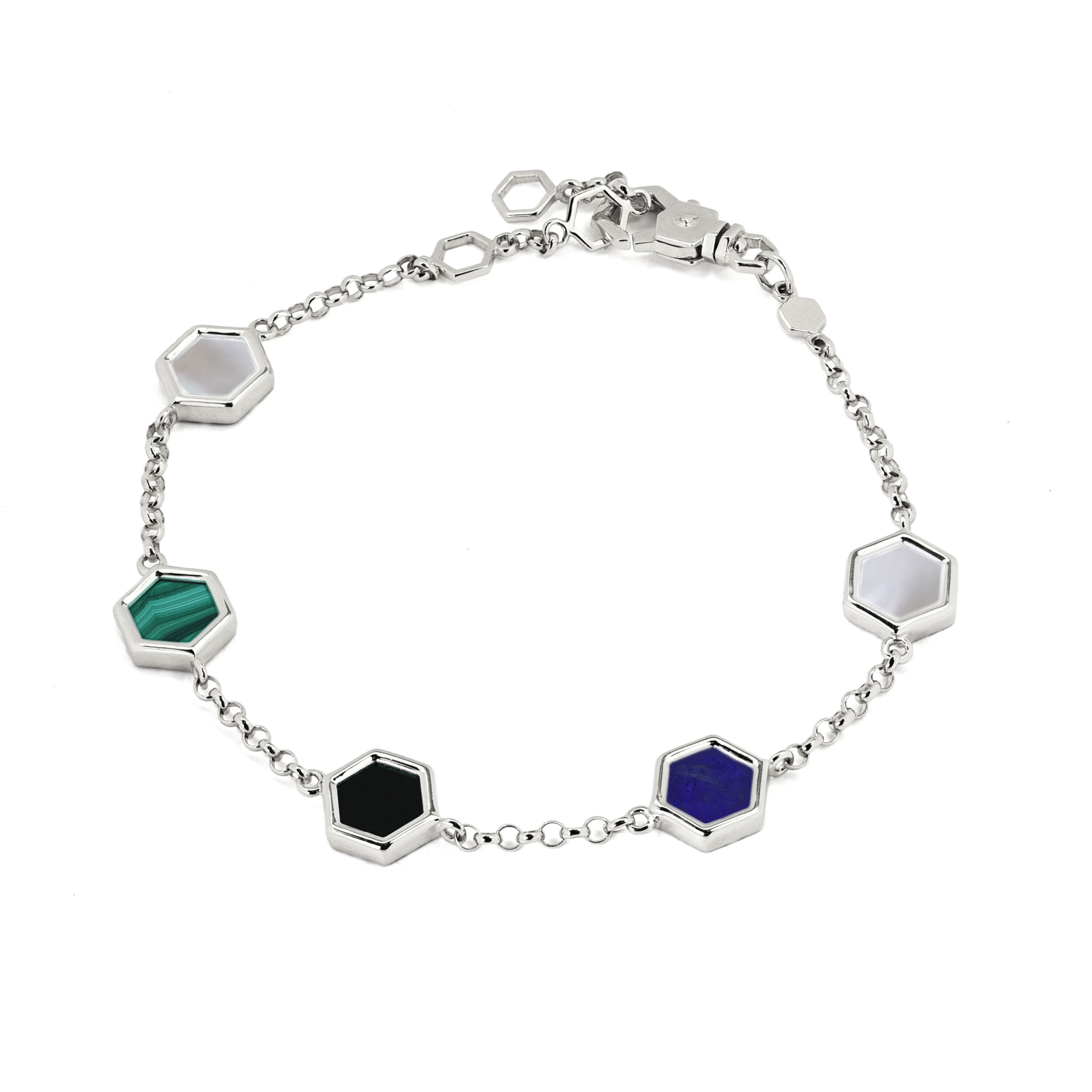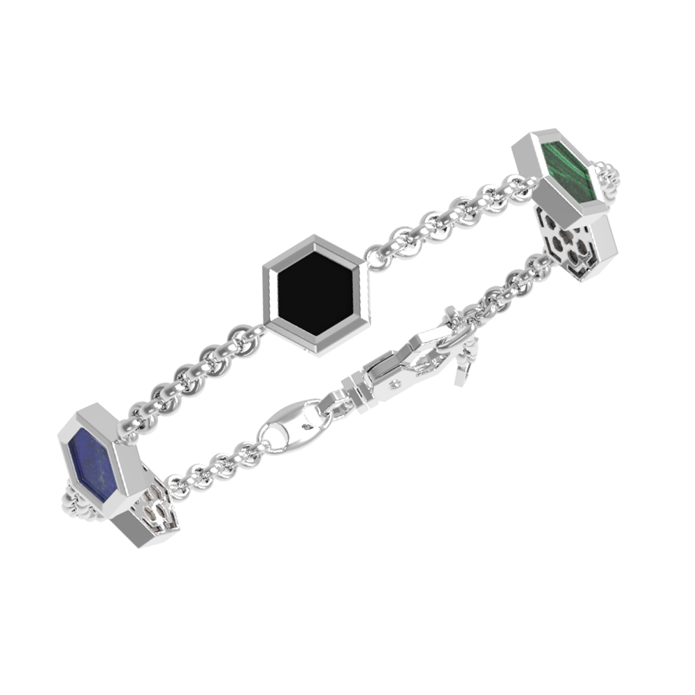 В этой модели гармонично соседствуют глубокий черный оникс, насыщенный синий лазурит, природный зеленый малахит и нежный перламутр. Сочетание благородного белого золота и разноцветных вставок создает динамичный и современный вид, который одинаково гармонично дополнит как женский, так и мужской стиль. Тонкая цепочка обеспечивает комфортную посадку на запястье, а надежный замок гарантирует безопасность при ежедневном ношении.