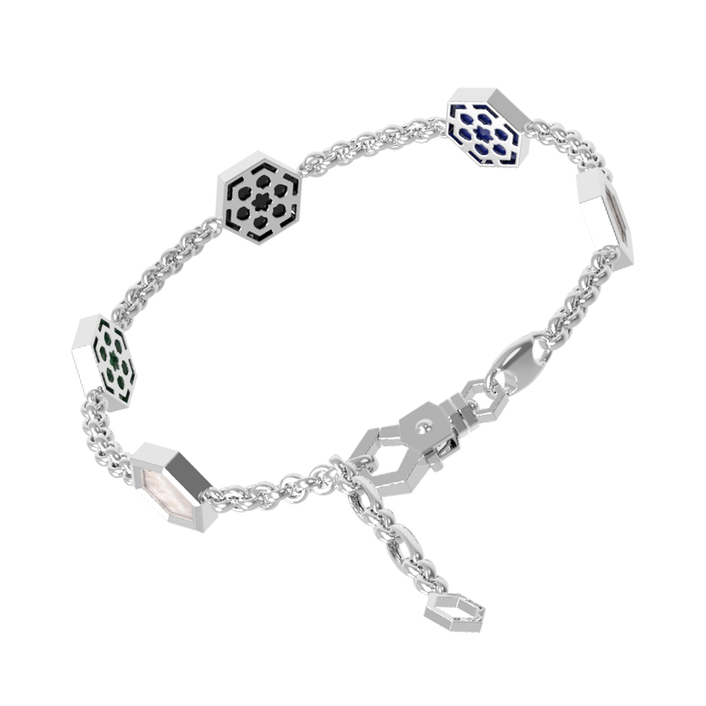 Эффектный браслет из белого золота 585 пробы станет центральным акцентом вашего образа. Дизайн украшения, вдохновленный структурой молекулы, объединяет строгость геометрии и природную красоту камней. Центральным элементом ювелирного изделия выступают три вставки в форме шестигранника, которые притягивают взгляд своим контрастным сочетанием цветов.
