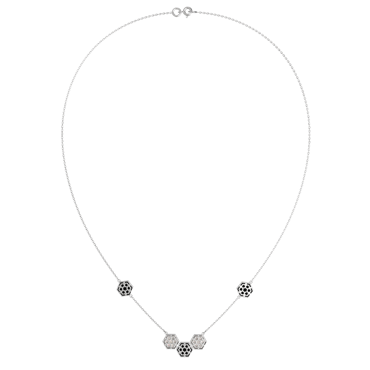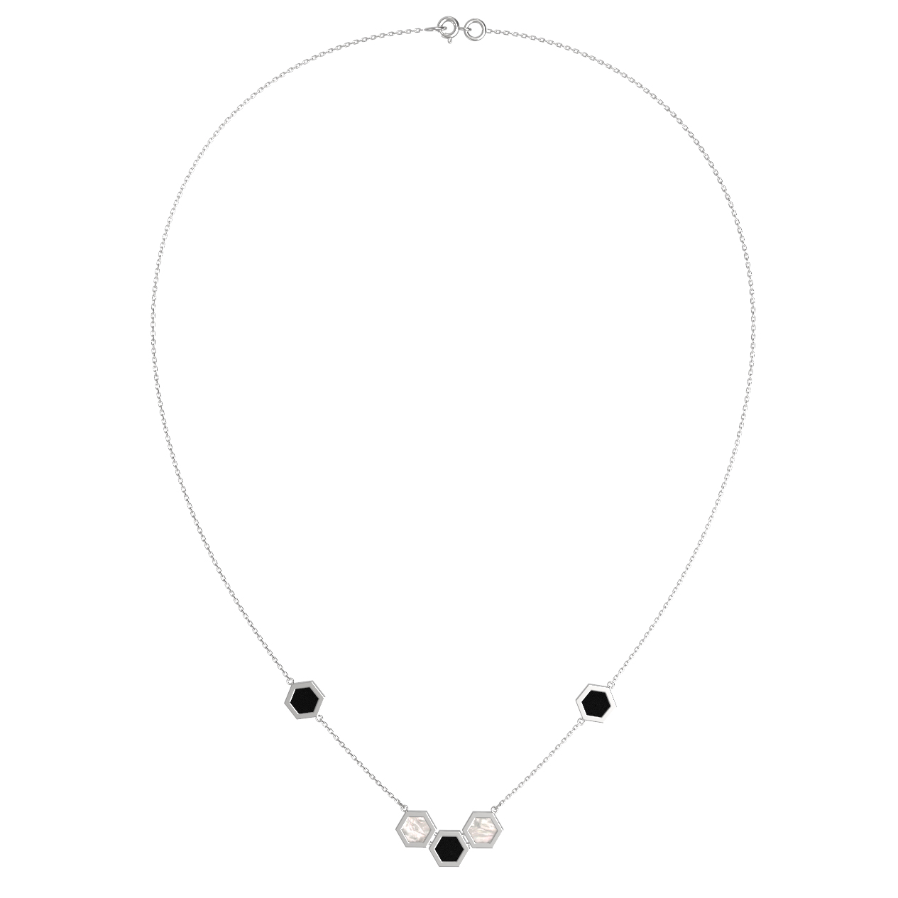 Это колье привлекает внимание контрастным сочетанием материалов: благородный блеск белого металла дополняют вставки из оникса черного цвета и перламутра. Всего в изделии использовано 9 вставок, которые чередуются на изящной цепочке, подчеркивая выверенную эстетику украшения. Лаконичность линий позволяет носить это колье как самостоятельный аксессуар, так и в качестве части ювелирного комплекта.