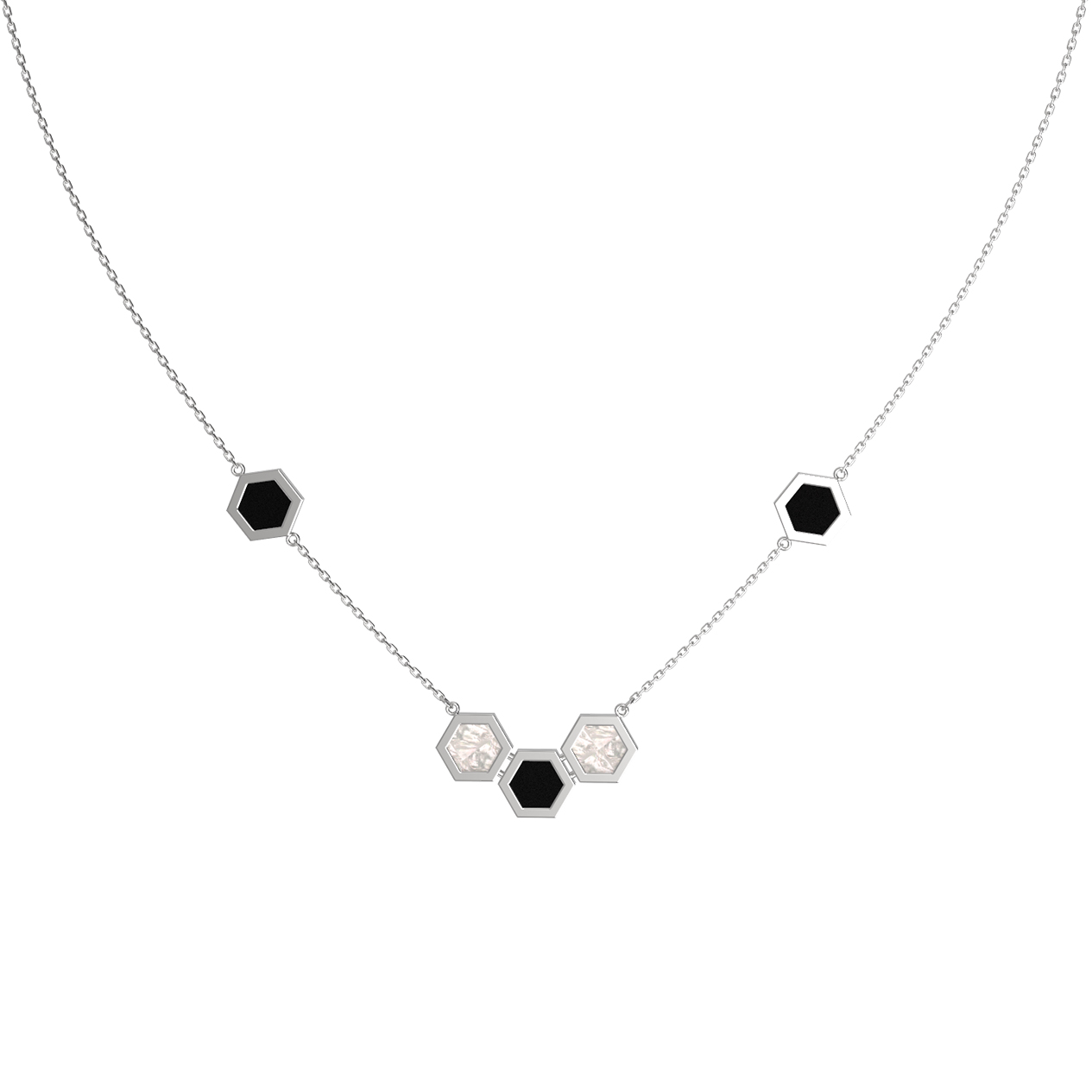 Колье из белого золота 585 пробы из коллекции De Luxe — Молекула воплощает современный взгляд на ювелирное искусство. Дизайн модели вдохновлен структурой молекулы, где строгие геометрические формы гармонично переплетаются, создавая уникальный визуальный акцент. Центром композиции стали вставки в форме шестигранника, которые придают изделию футуристичный и динамичный характер.