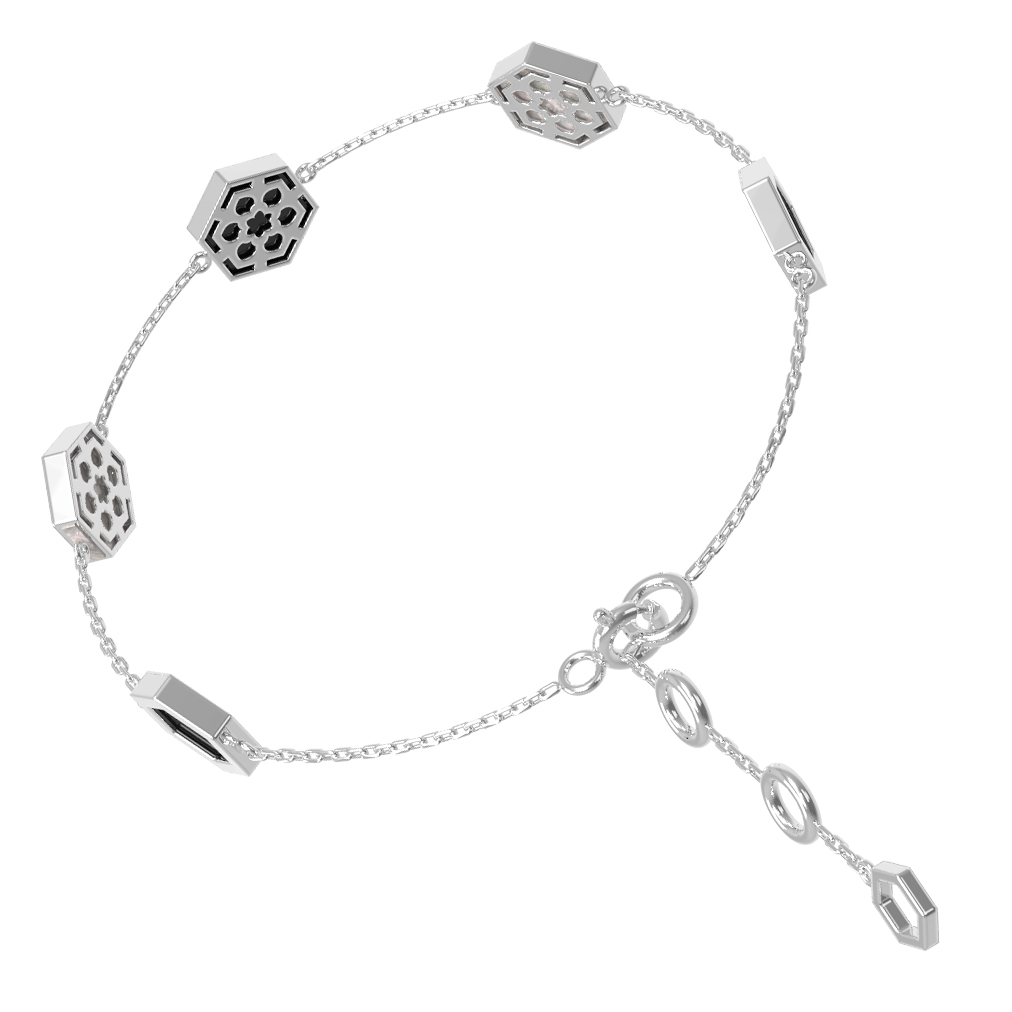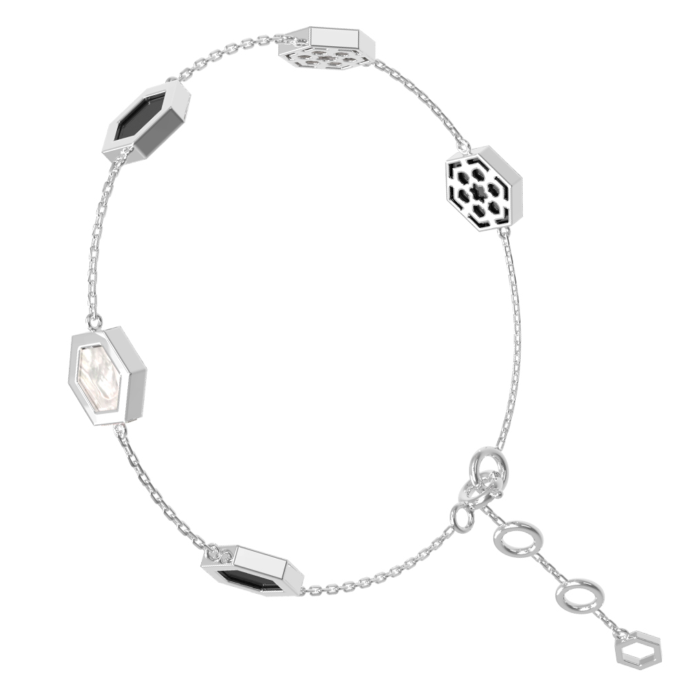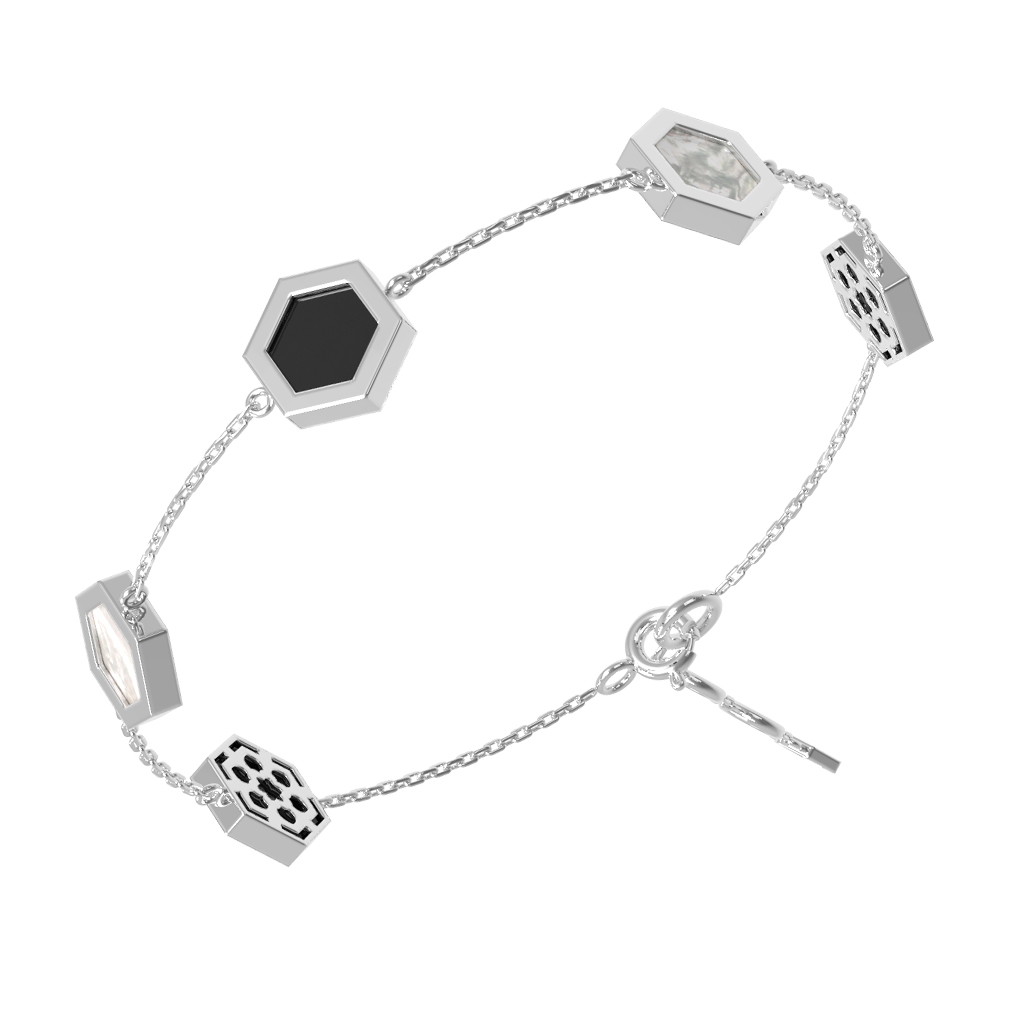 Центральным элементом композиции стали три вставки в форме шестигранника, которые гармонично сочетают в себе глубину черного оникса и нежное сияние перламутра. Контрастное сочетание черного и перламутрового оттенков придает украшению особую выразительность и глубину. Тонкое плетение цепи из белого золота создает изящную основу, на которой акценты смотрятся максимально эффектно.