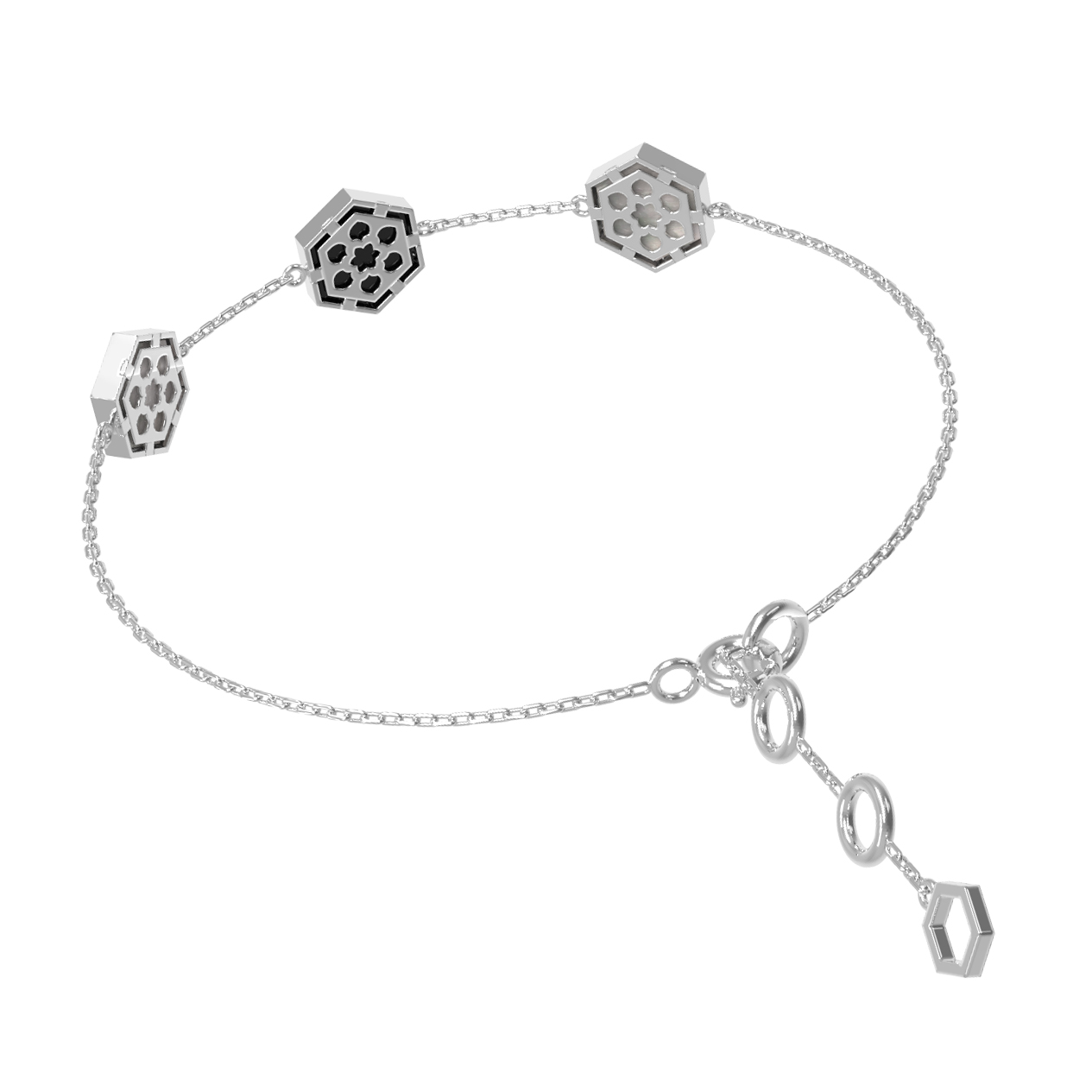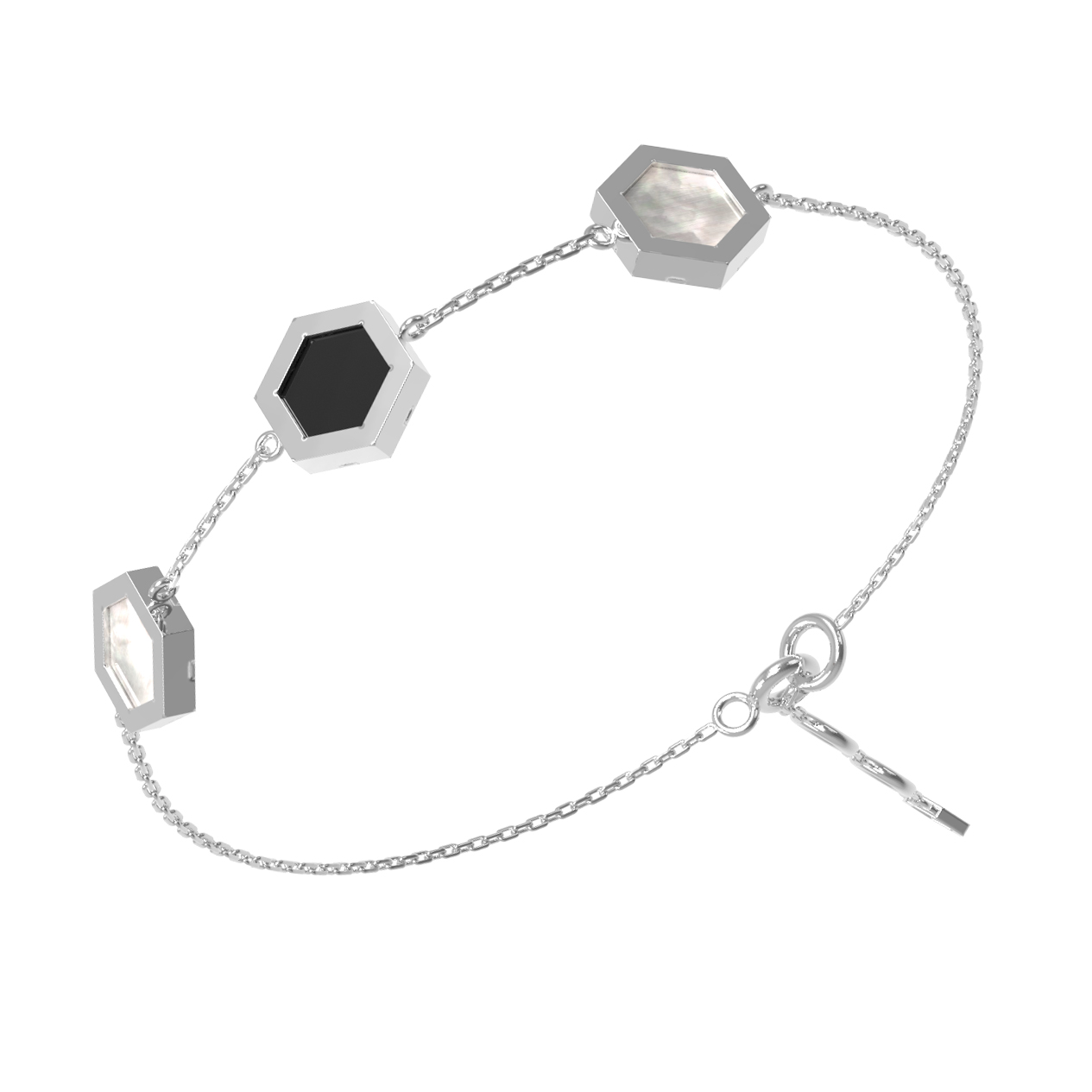 Центральным элементом композиции являются вставки в форме шестигранника. Такое решение смотрится необычно и притягивает взгляд. Контрастное сочетание цветов вставок — глубокий черный оникс и нежный переливающийся перламутр — создает изысканный визуальный эффект. Каждая деталь тщательно проработана, чтобы обеспечить комфортное ношение и безупречный внешний вид.
