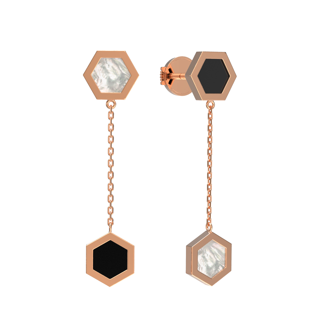 В центре композиции — контрастная игра фактур и оттенков. Вставки выполнены из благородного оникса черного цвета и переливающегося перламутра. Две вставки правильной геометрической формы притягивают взгляд, создавая динамичный образ. Особая конструкция изделия с изящной цепочкой придает серьгам легкость и подвижность, заставляя их мягко играть при движении.