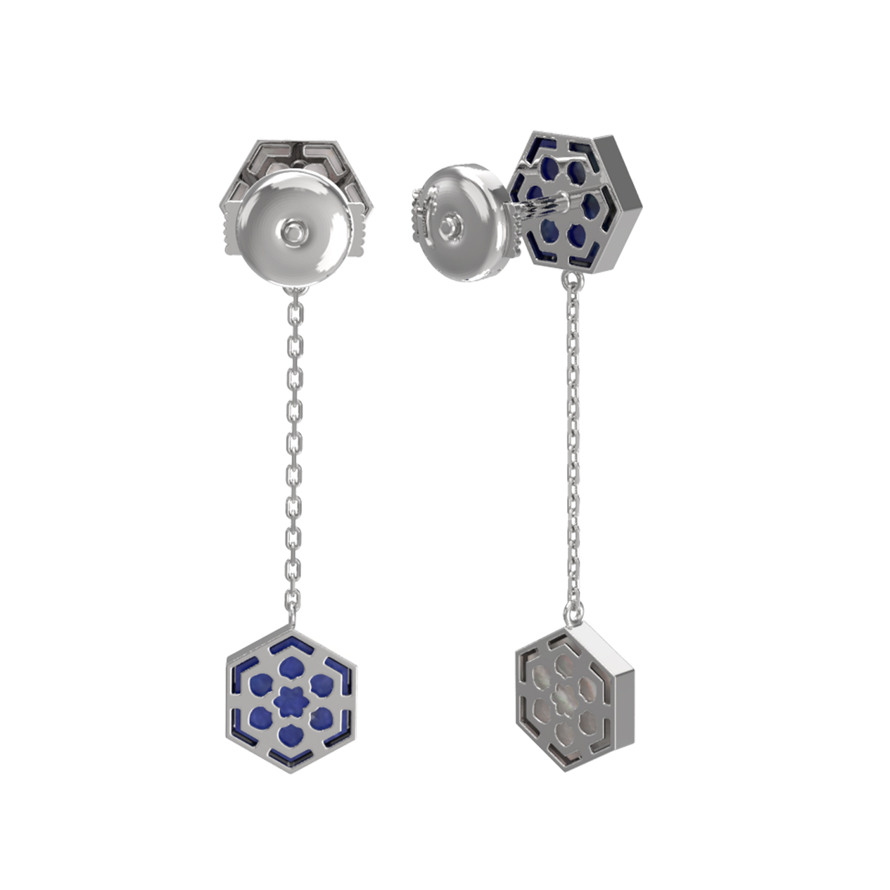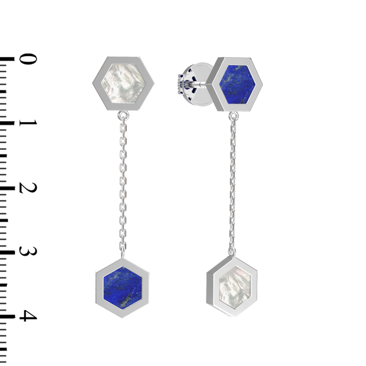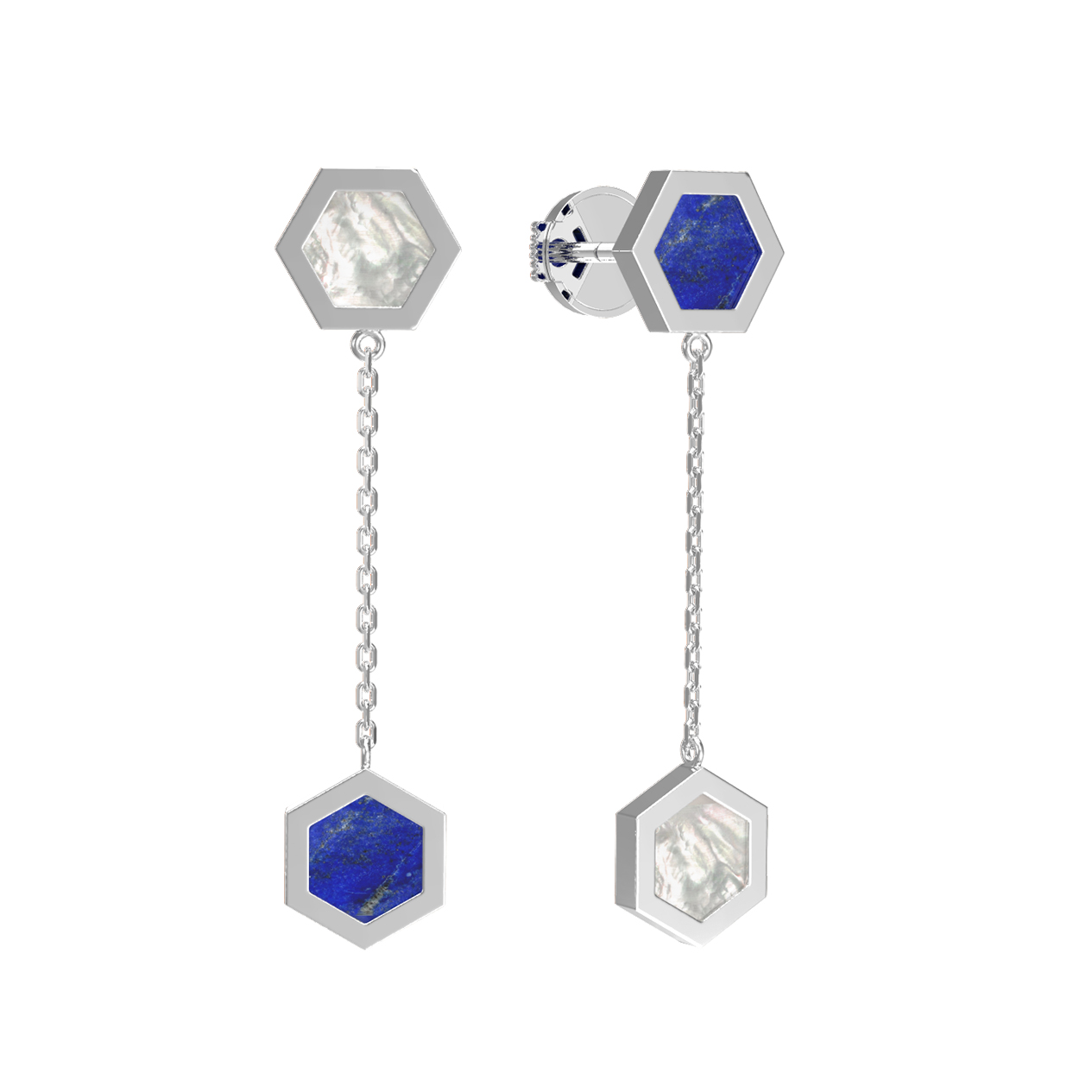 Центральными элементами композиции выступают две вставки: благородный синий лазурит и нежный переливающийся перламутр. Контрастное сочетание этих натуральных материалов создает глубокий визуальный эффект, подчеркивающий холодный блеск белого металла. Аккуратная цепочка, соединяющая геометрические элементы, добавляет серьгам динамики и подвижности, заставляя свет красиво играть на гранях.