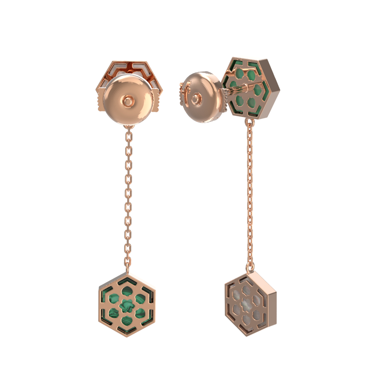 Элегантные и необычные серьги из красного золота 585 пробы станут ярким акцентом вашего образа. Дизайн украшения, вдохновленный концепцией молекулы, воплощен в строгой геометрии: вставки выполнены в форме шестигранника, что придает изделию современный и динамичный вид. Сочетание благородного металла теплого оттенка с природными камнями создает утонченный контраст, подчеркивающий безупречный вкус владельца.